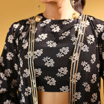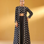 Pure soft crepe block print jacket. Hand embellished gota crop top with solid cream flair pants. Naaz is our hotseller for a reason.