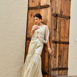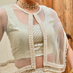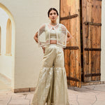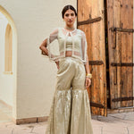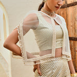 Delicate net cape with intricate pearl details , banarasi crop top , flared pants Flaunt this beautiful pastel outfit at your friends wedding or cocktail party. Pair it with statement earrings and pumps for the bold and fierce look.