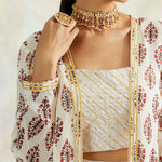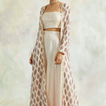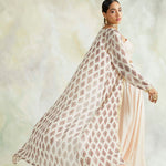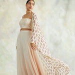 Peach printed cape in pure georgette with intricate hand gota detailing at the the neck. It is paired with heavily hand embroidered sliver and light gold gota work crop top with straps and soft cotton modal flair pants accentuating the waist .