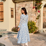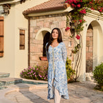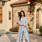 Make heads turn in this statement making piece. Soft crepe high low top with intricate floral print. It comes with ivory cotton pants. Hand gota detailing accentuates this breezy set. Style this set with statement earrings and white pumps.