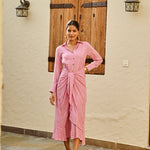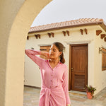 Button down dress with front tie detail to cinch the waist as per your comfort . This dress is the perfect summer stable , made in soft rayon crepe lurex and the softest cotton mulmul slip.