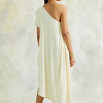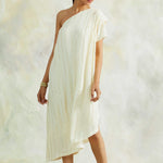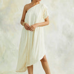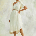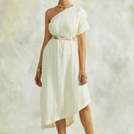 One shoulder dress in soft crepe fabric. Delicate gold threads to accentuate the outfit. Cinch it at the waist with a belt or wear it free flowing. Belt is highlighted with gold thread and gota embroidery.