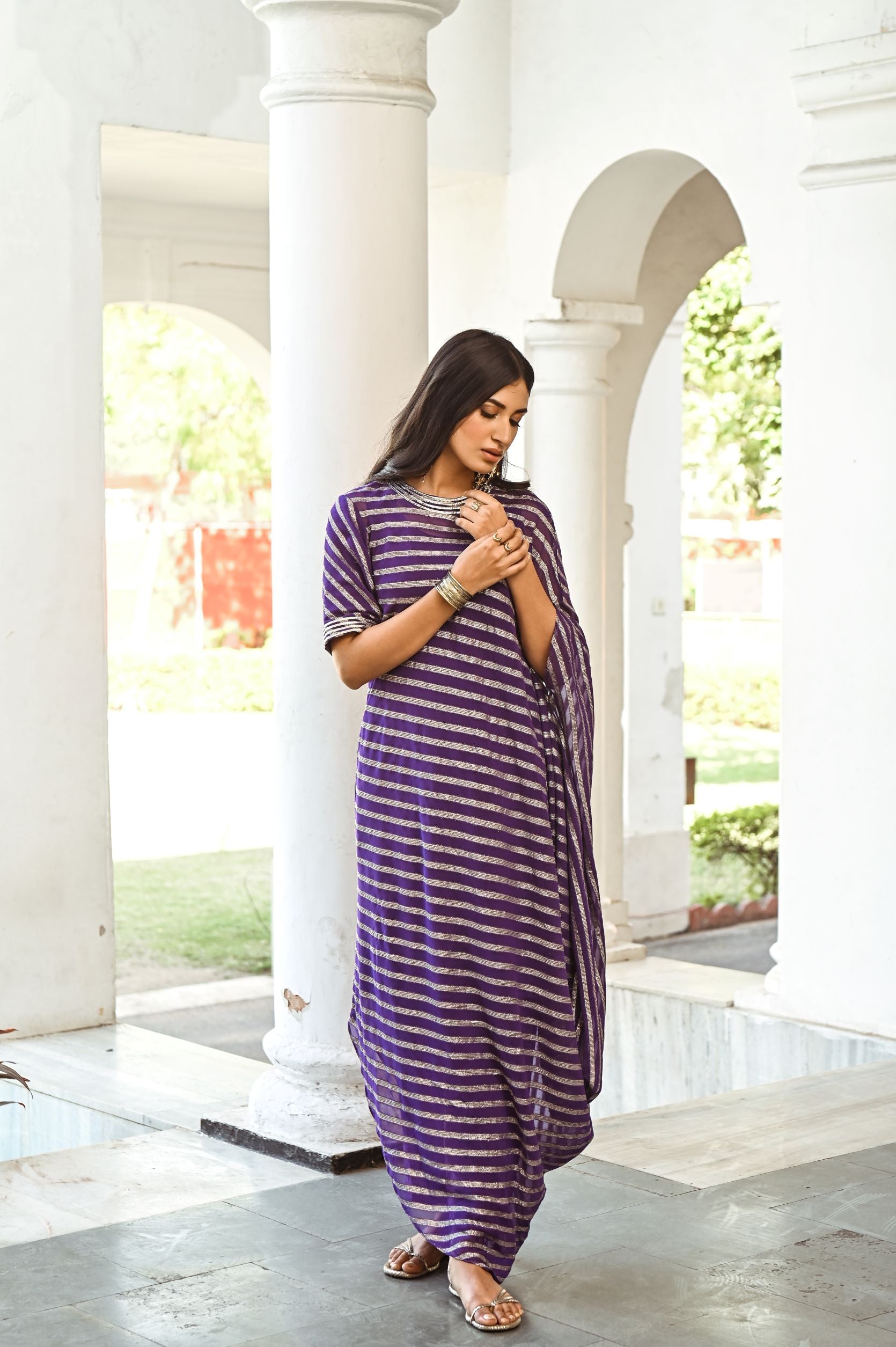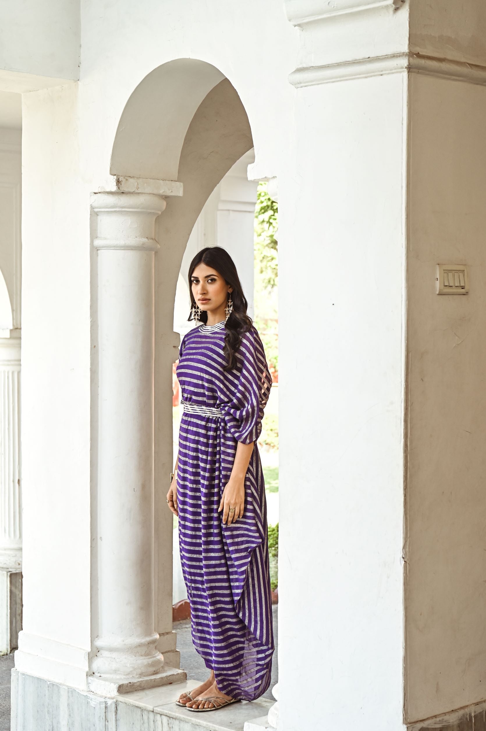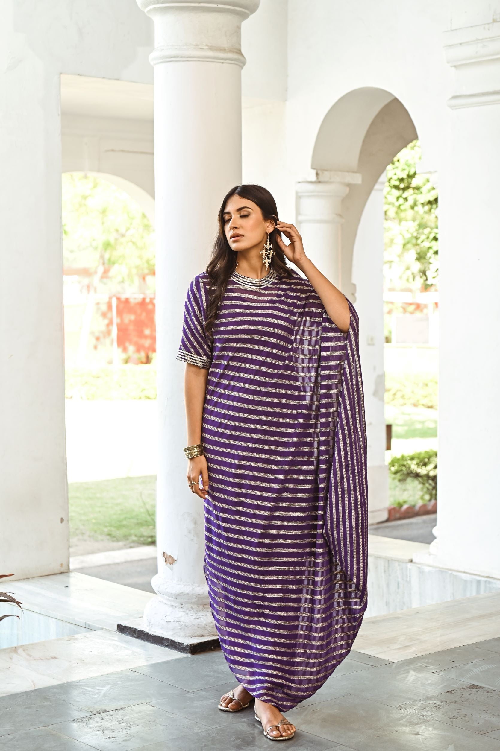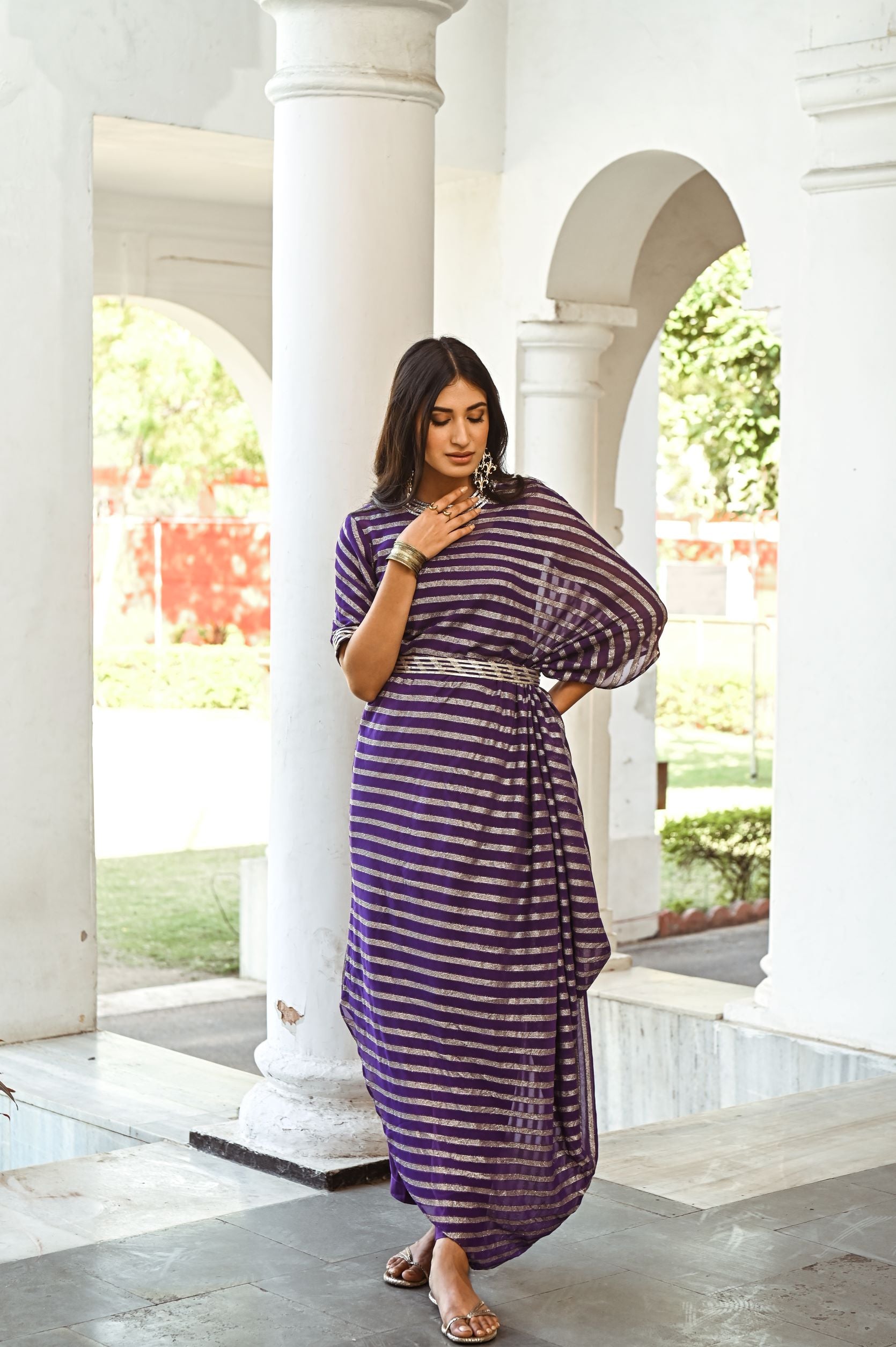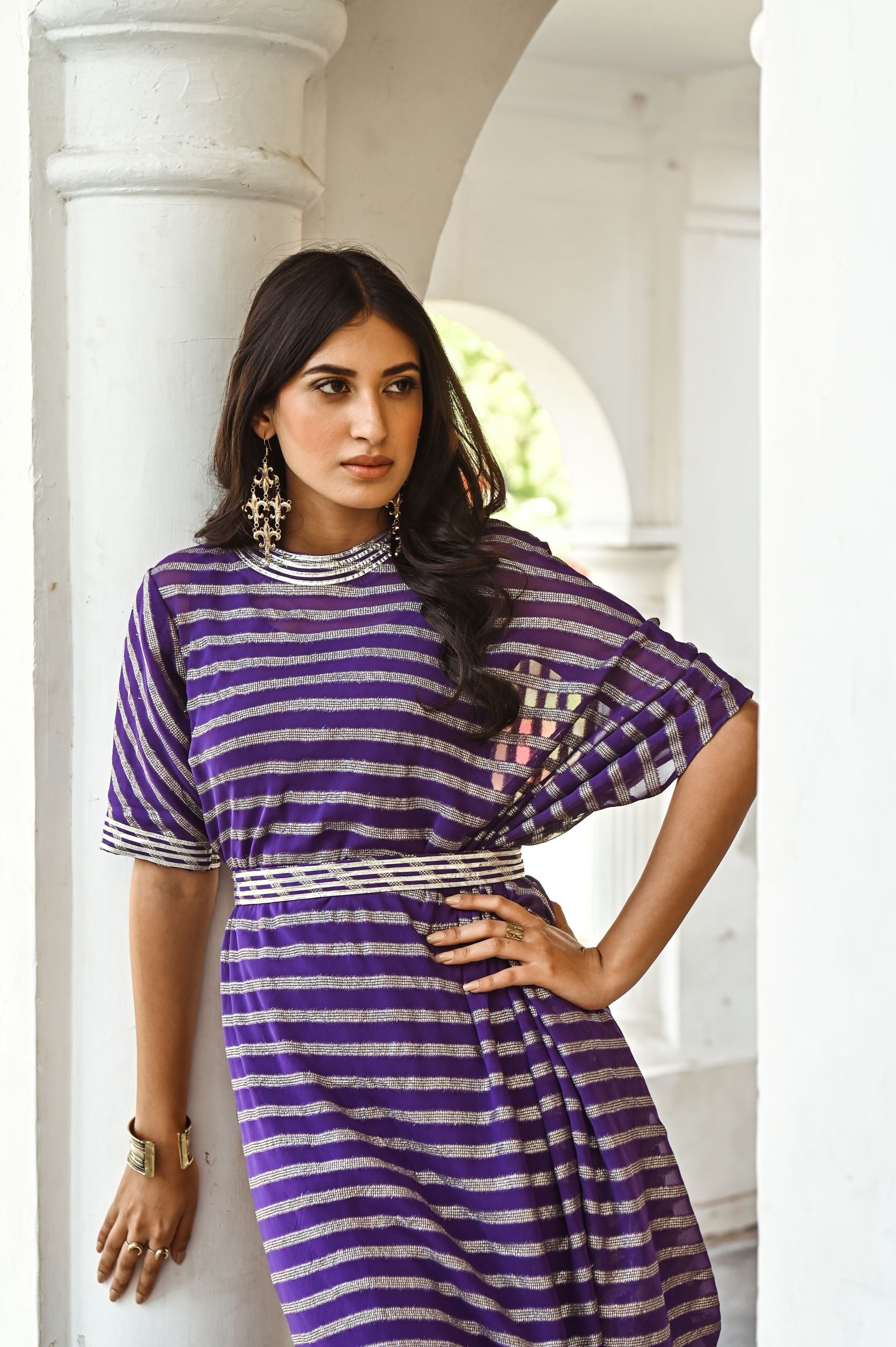 Benarasi georgette cowl dress in a royal purple color. Exquisite silver gota detailing at the neckline. This dress comes with a gota belt. Cinch it to define the waist or leave it flowy.