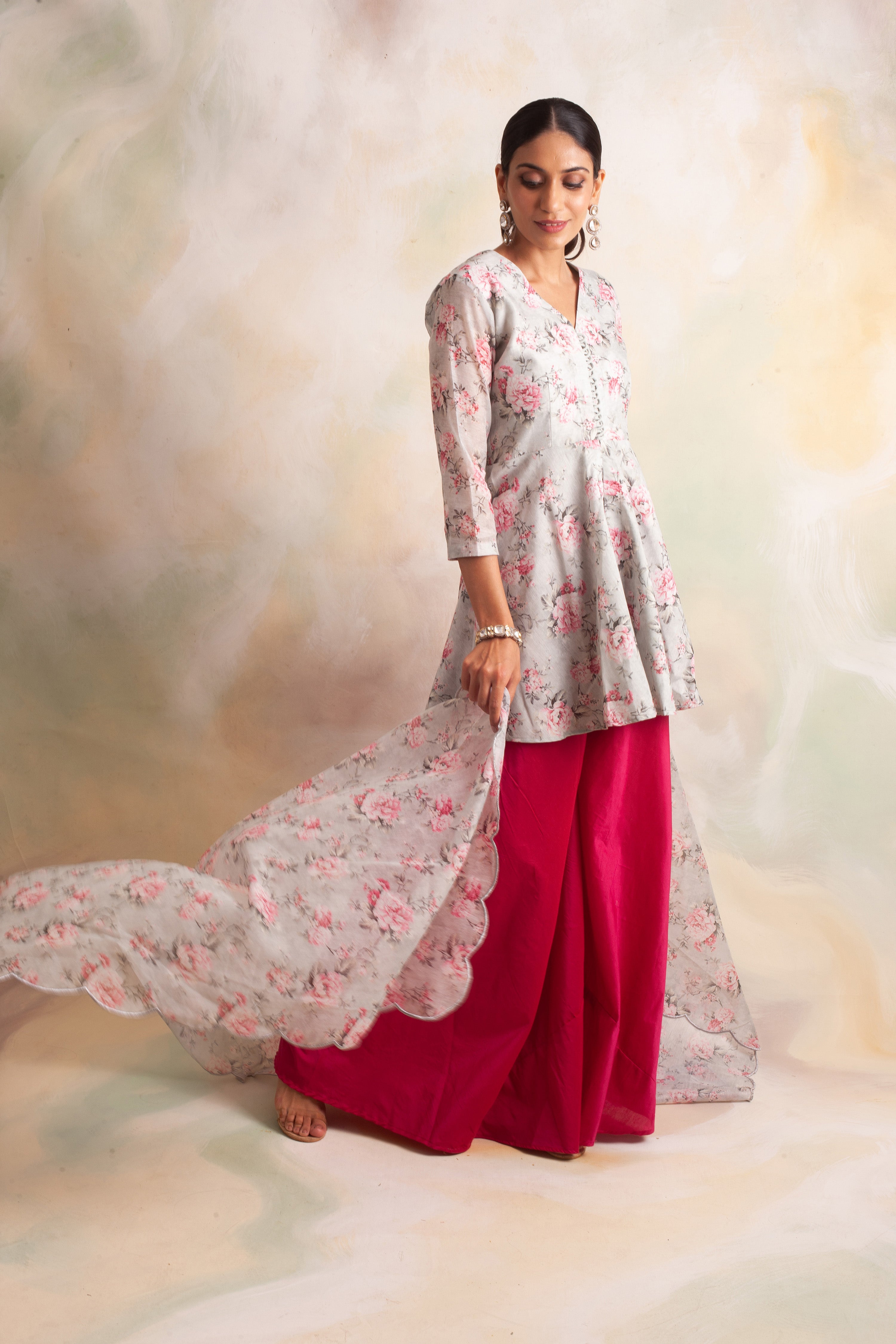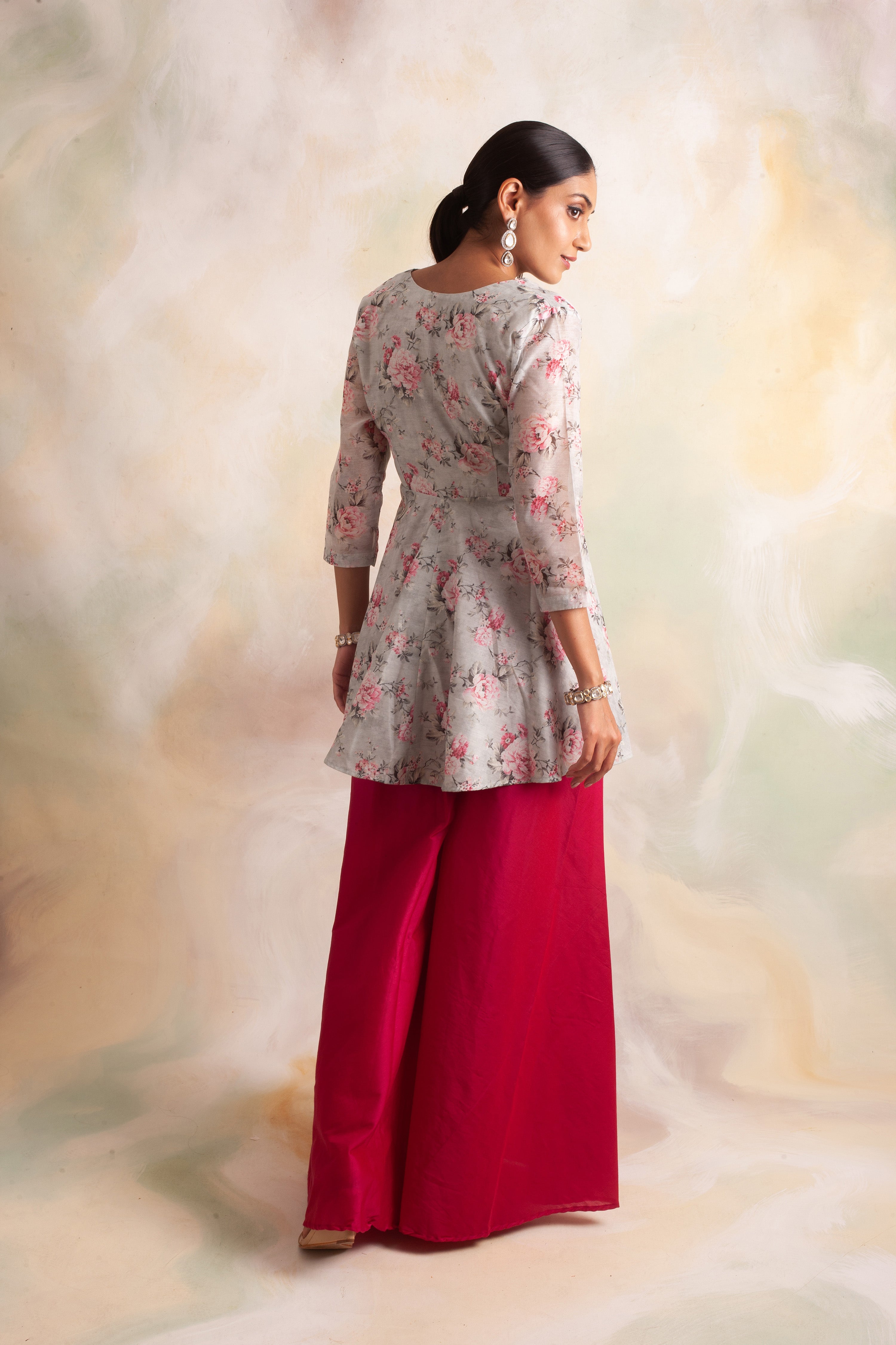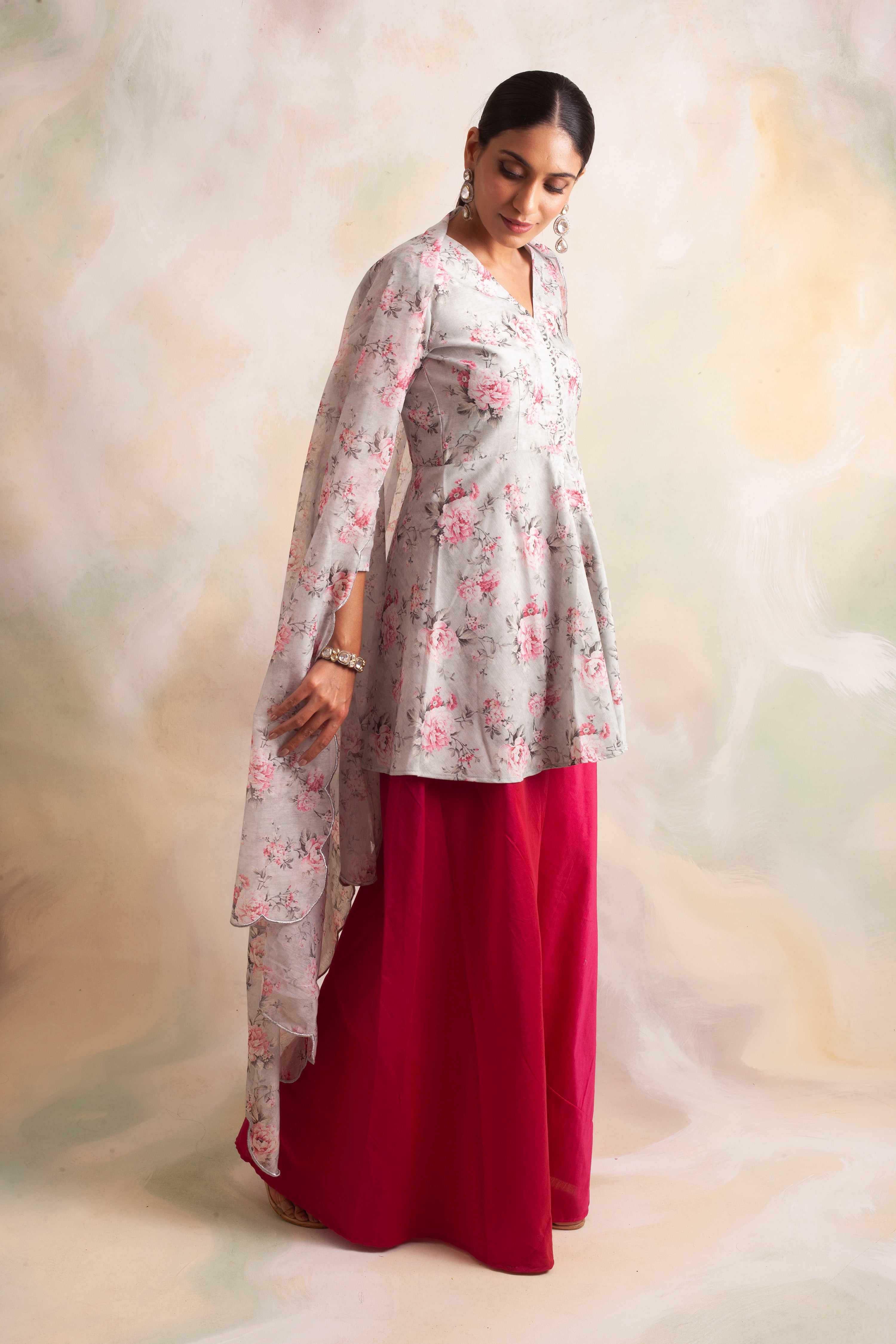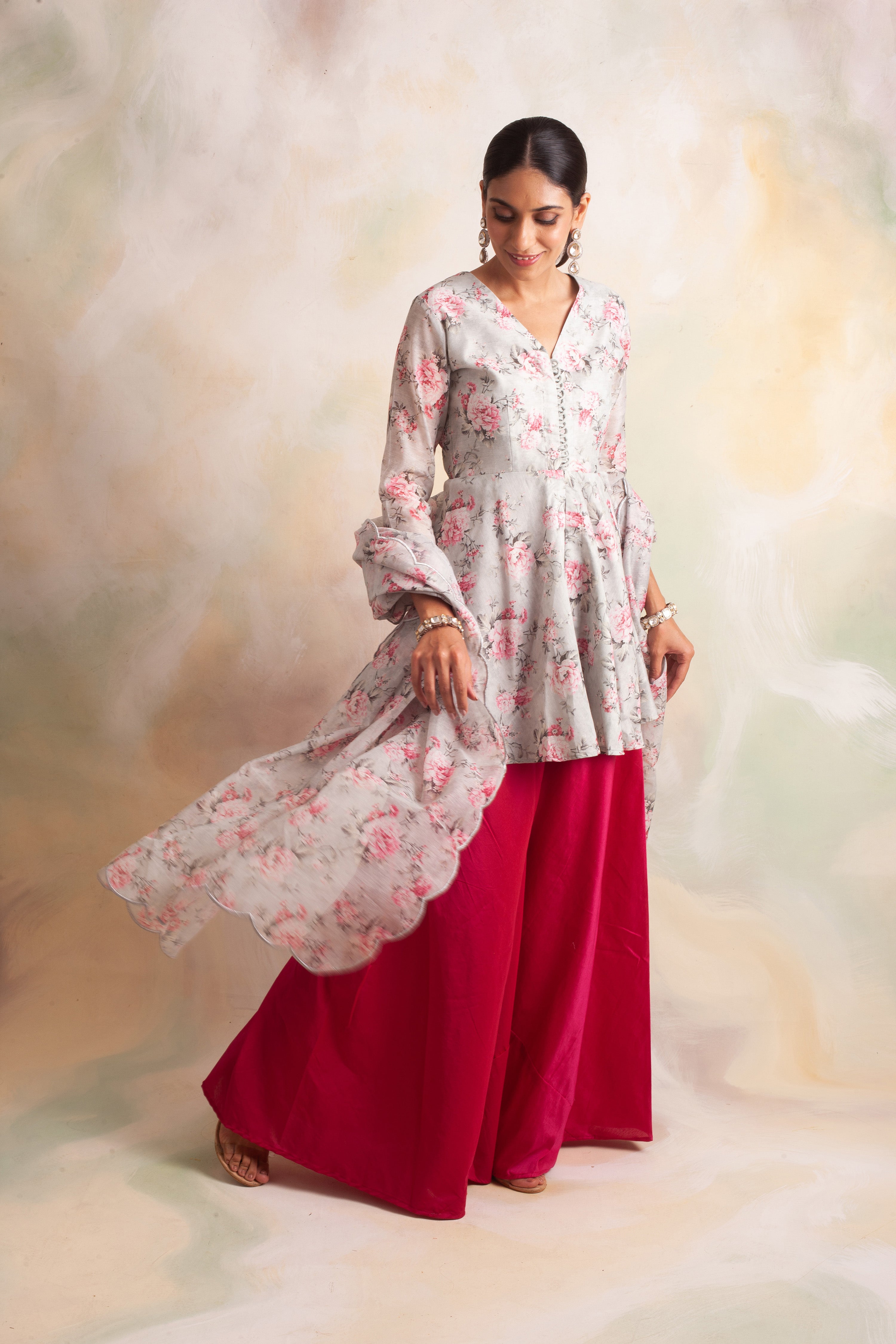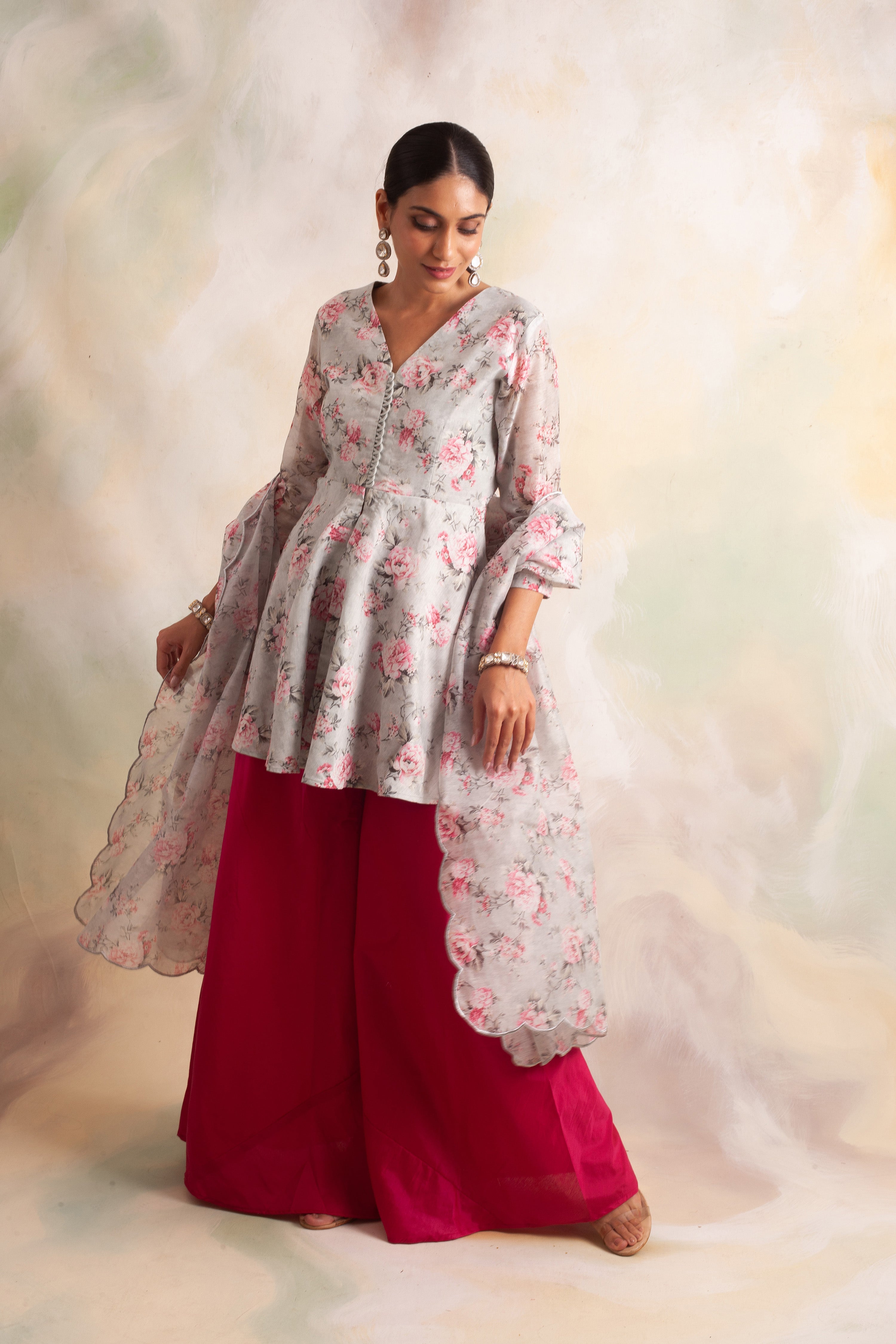 GREY AND RUBY RED SHAINA PEPLUM TOP WITH PANTS AND ODHANI SET