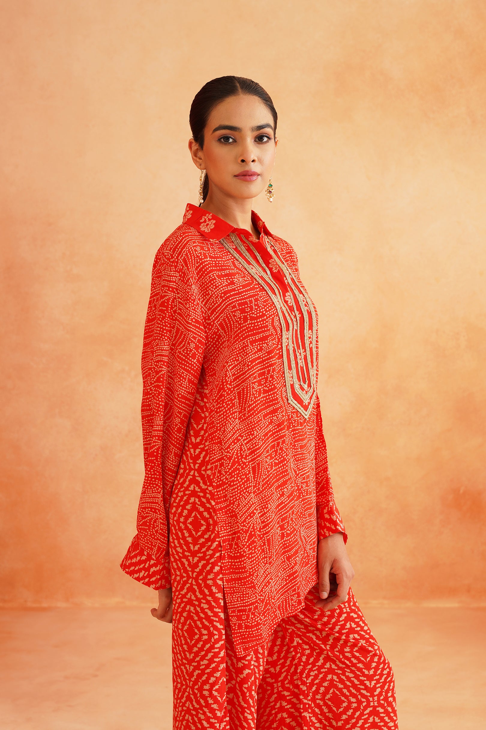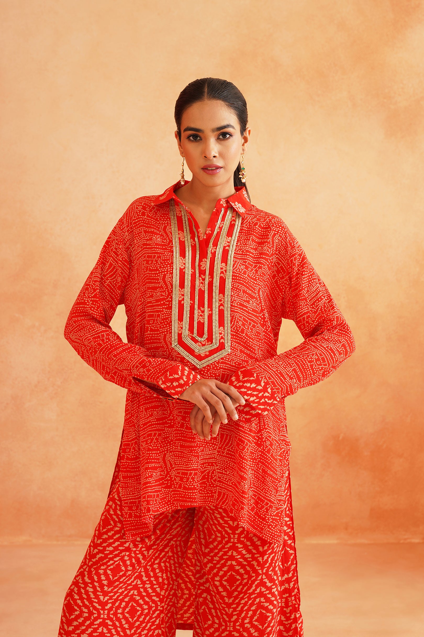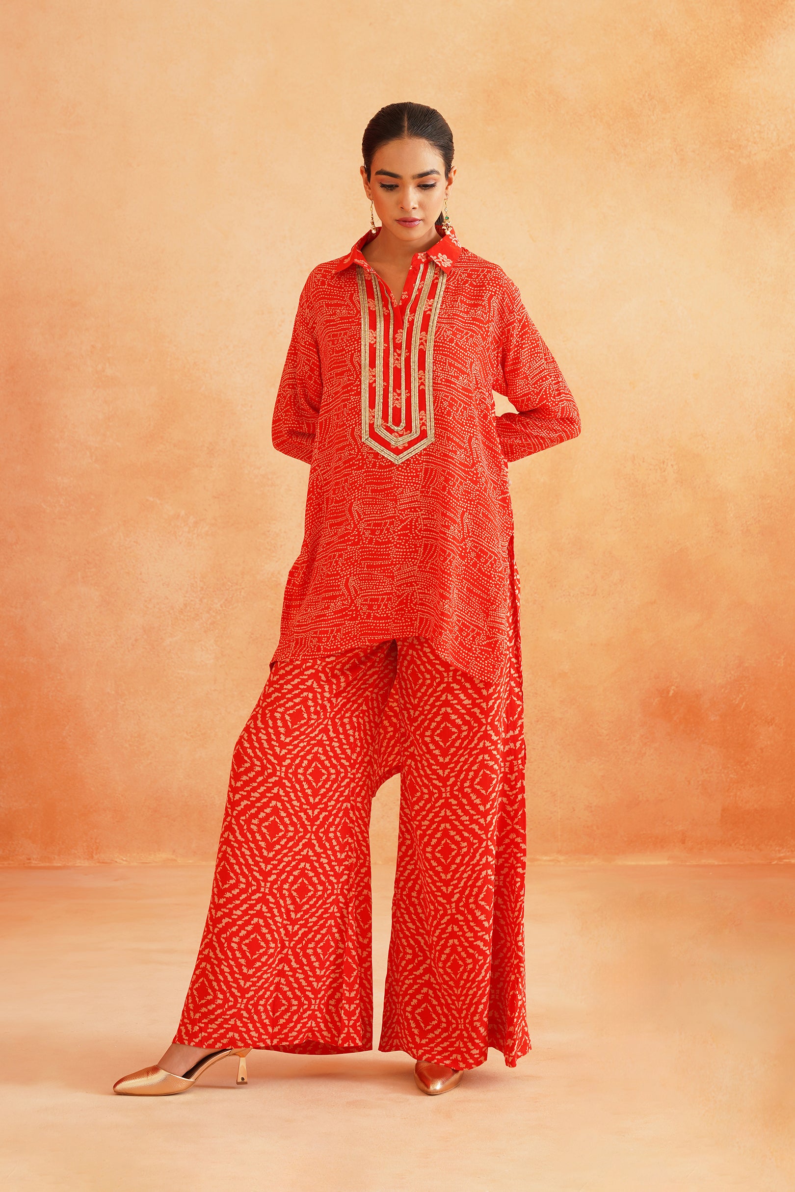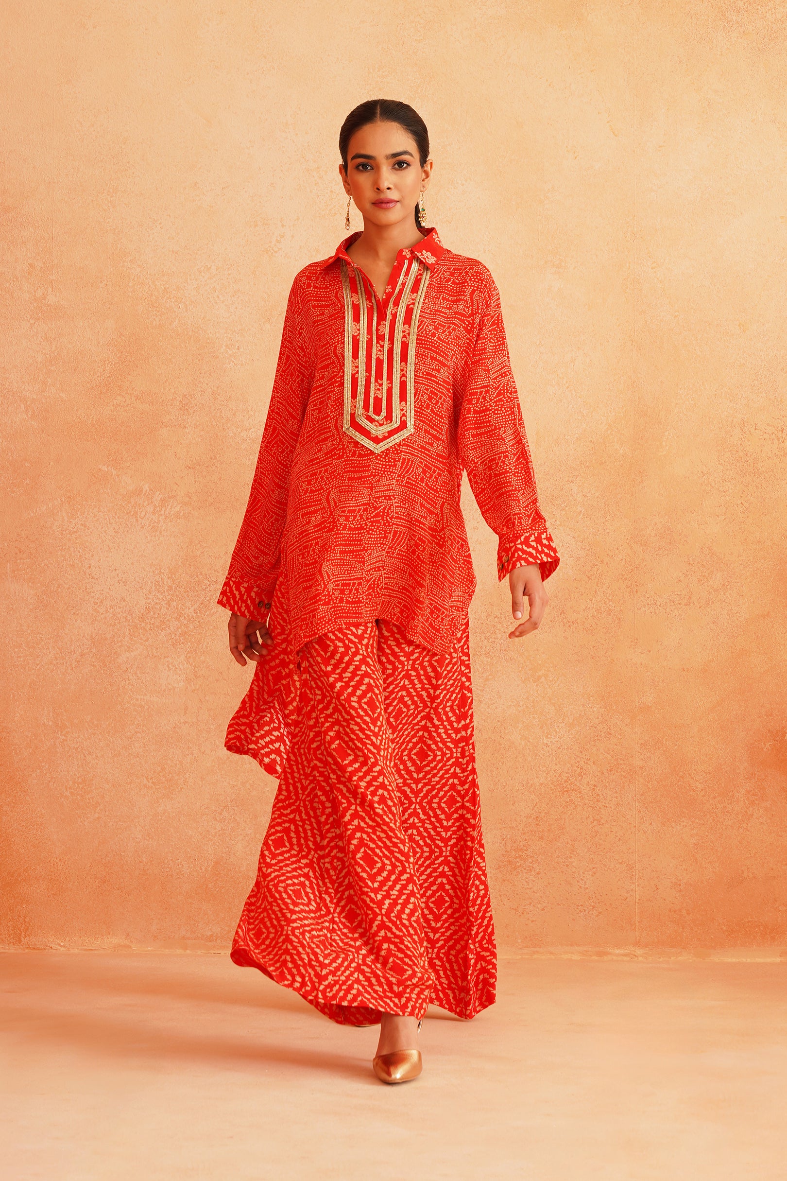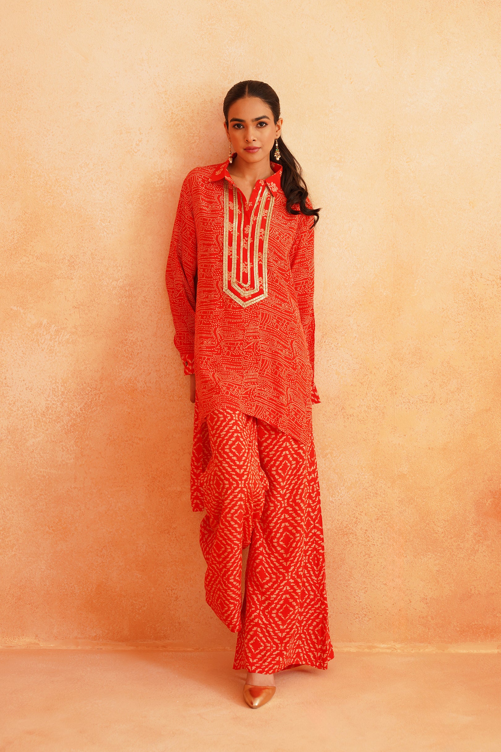 Relaxed fit high low shirt with dull gold accents on the neck with a contrast print for that easy boho chic look paired with comfort fit palazzo pants. This silhouette is a must have for the contemporary yet elegant wardrobe.