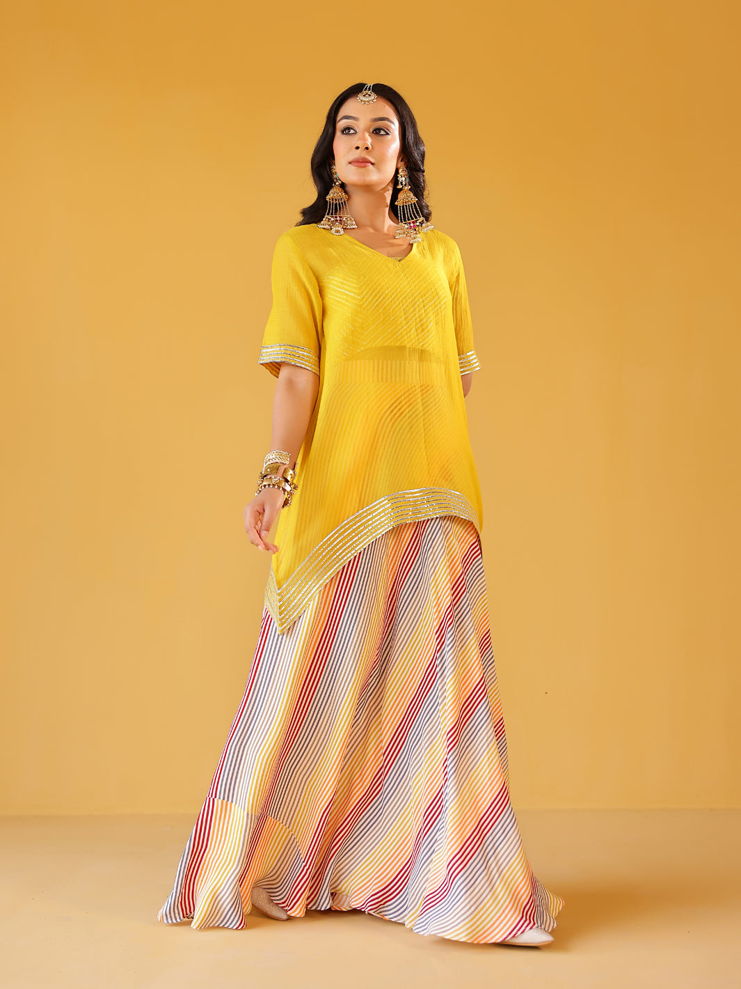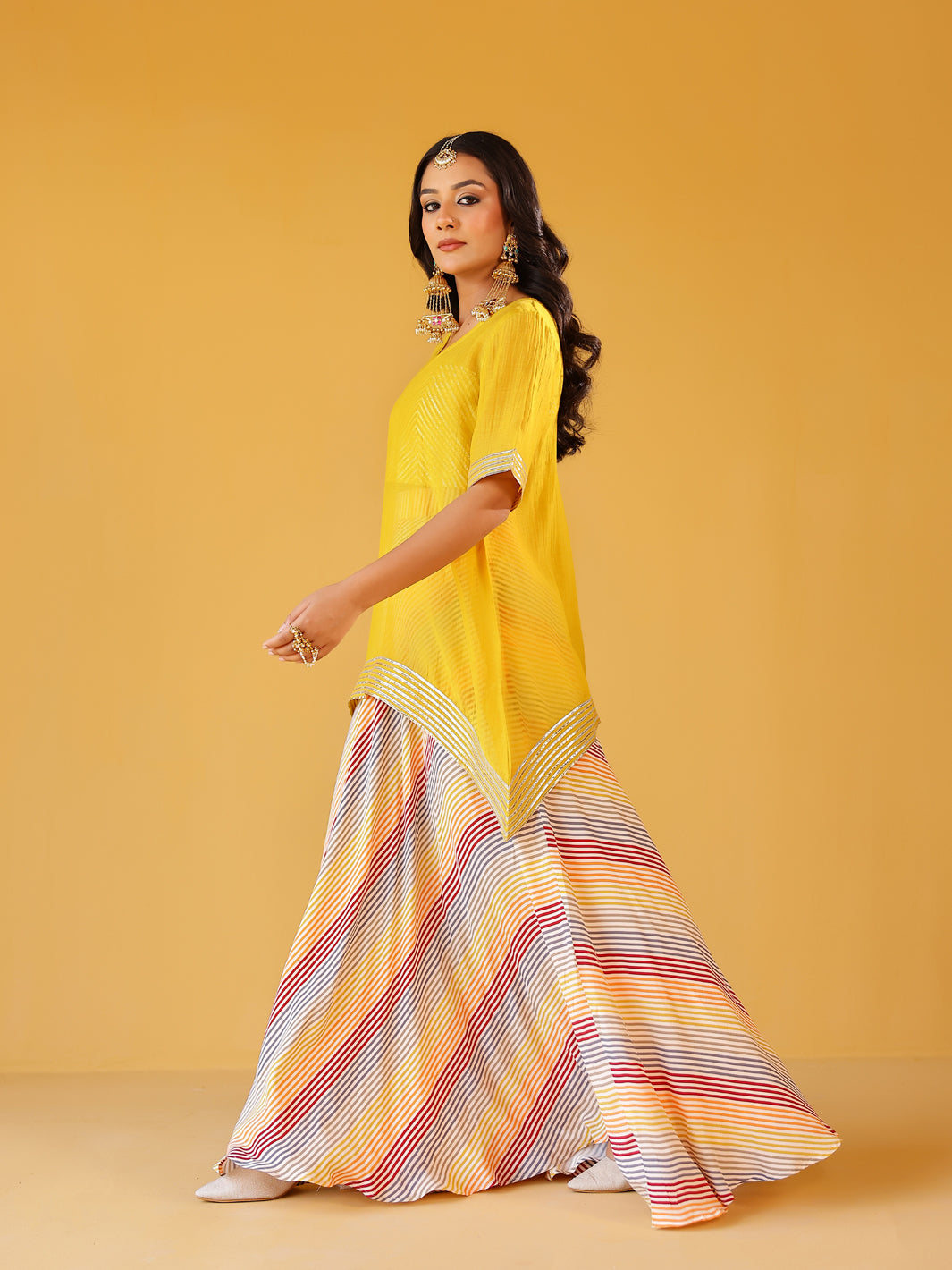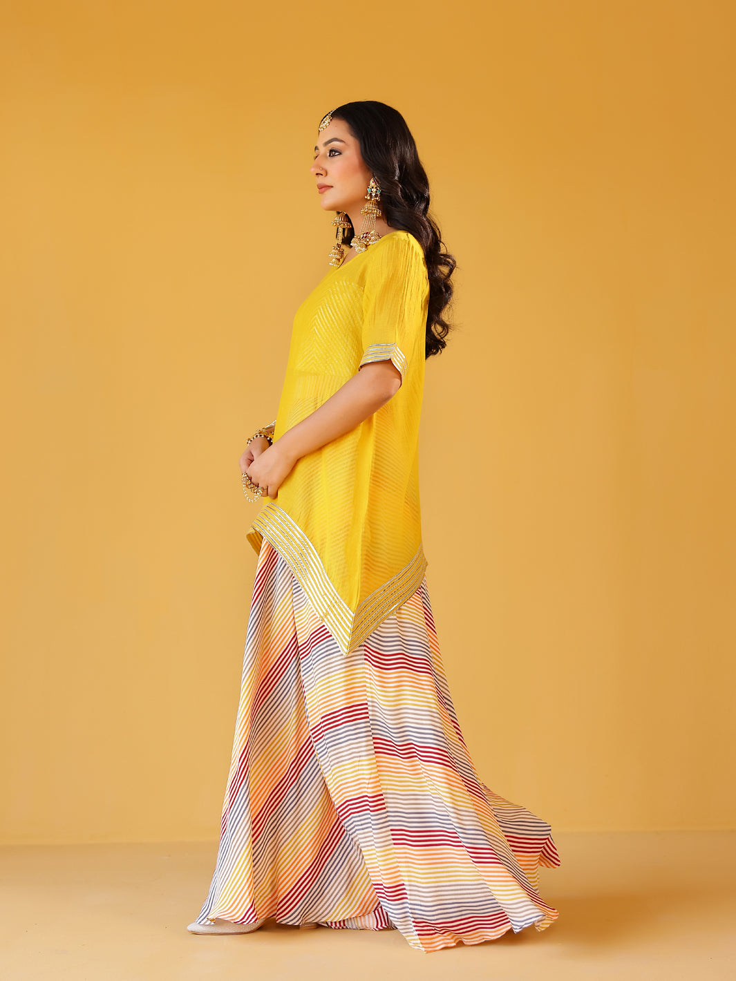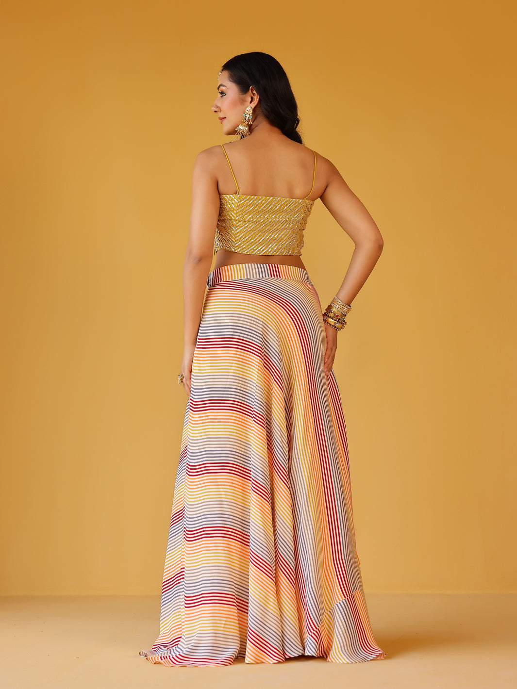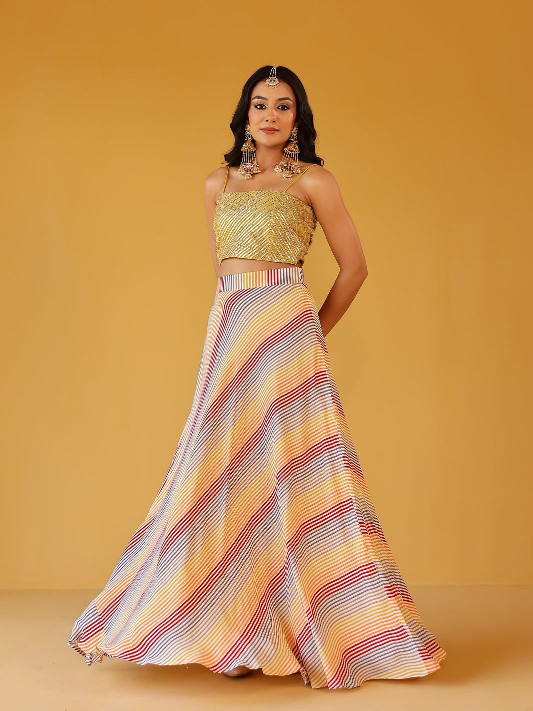 Fine organza blouse with comfortable half sleeves. Gold gota handwork at the hem and sleeves. Intricate gota embellishments on a noodle strap crop top. Warm rainbow stripes skirt in pure crepe. Style this versatile outfit with statement polki jewllery.
