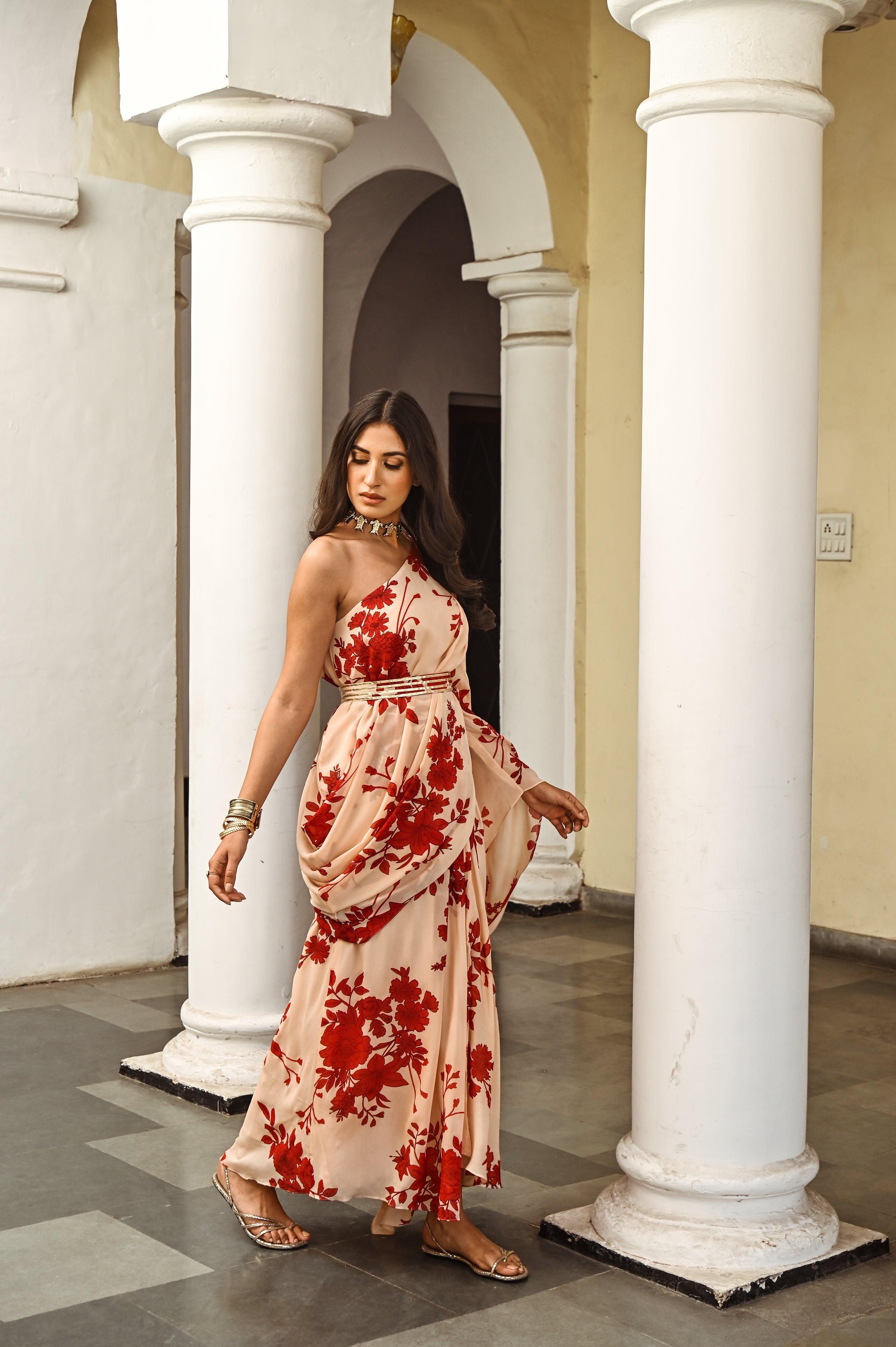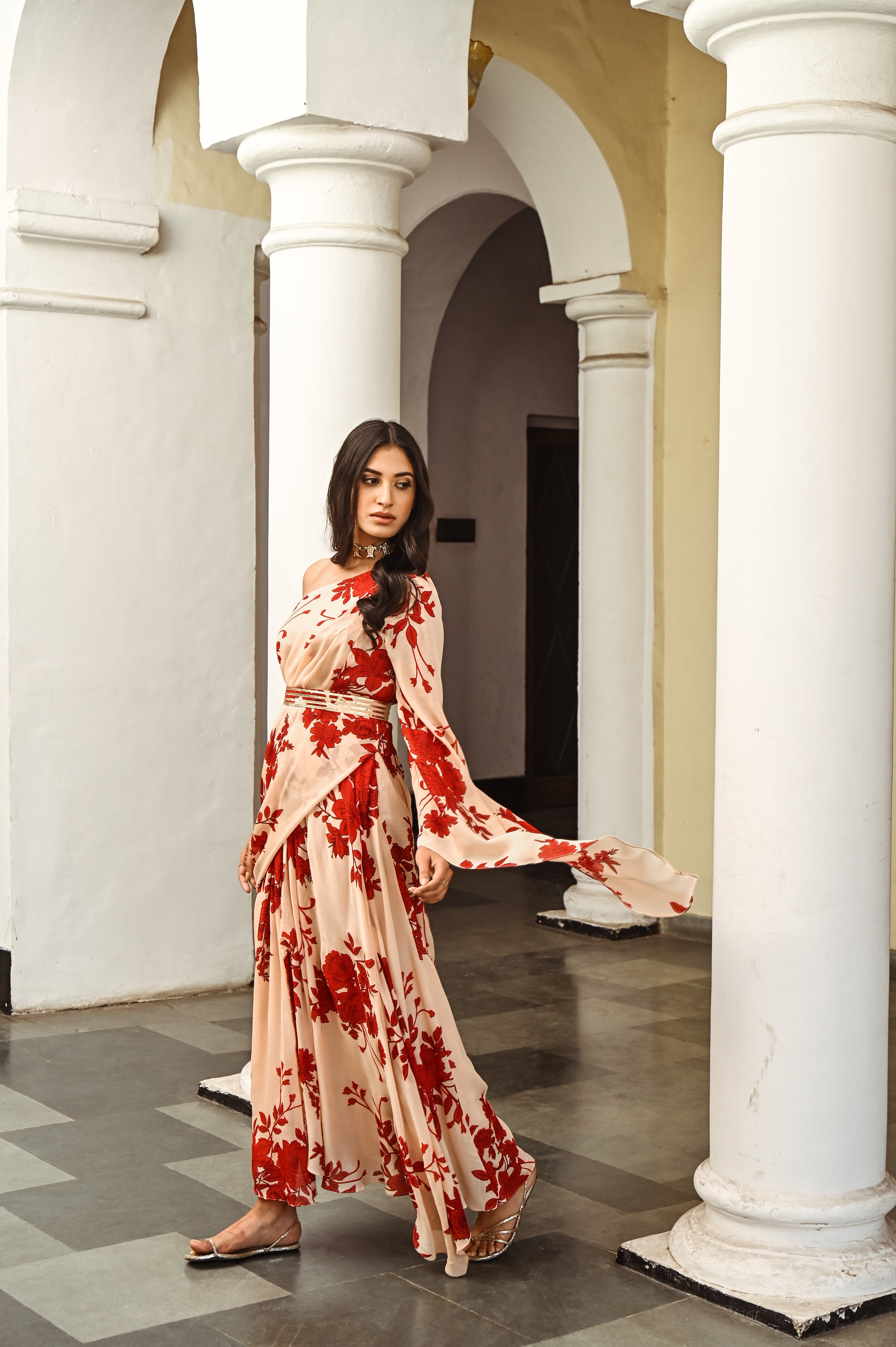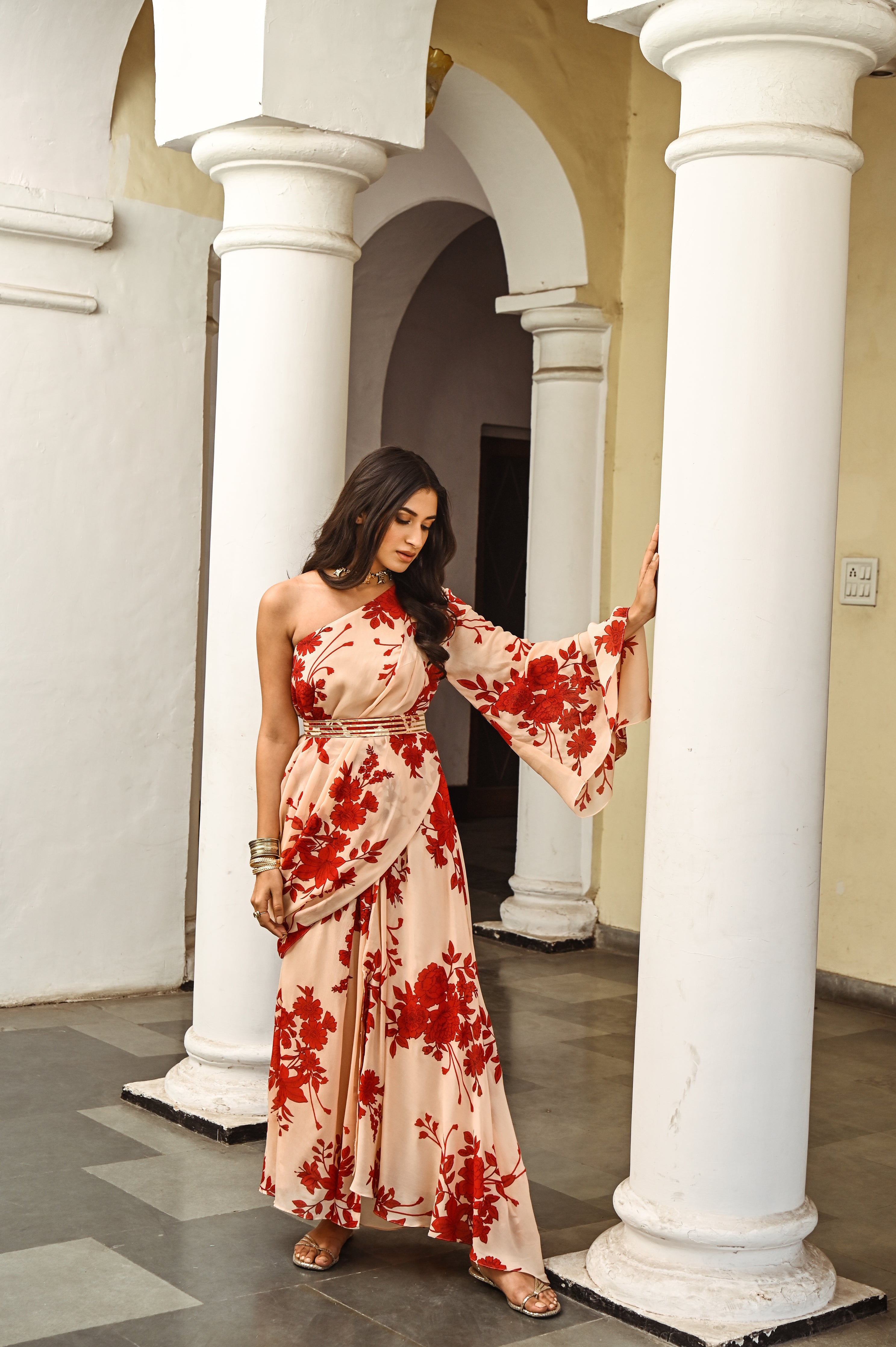 MITALI WADHWA | RED FLORAL SUHANA ONE SHOULDER TOP, SKIRT & BELT SET