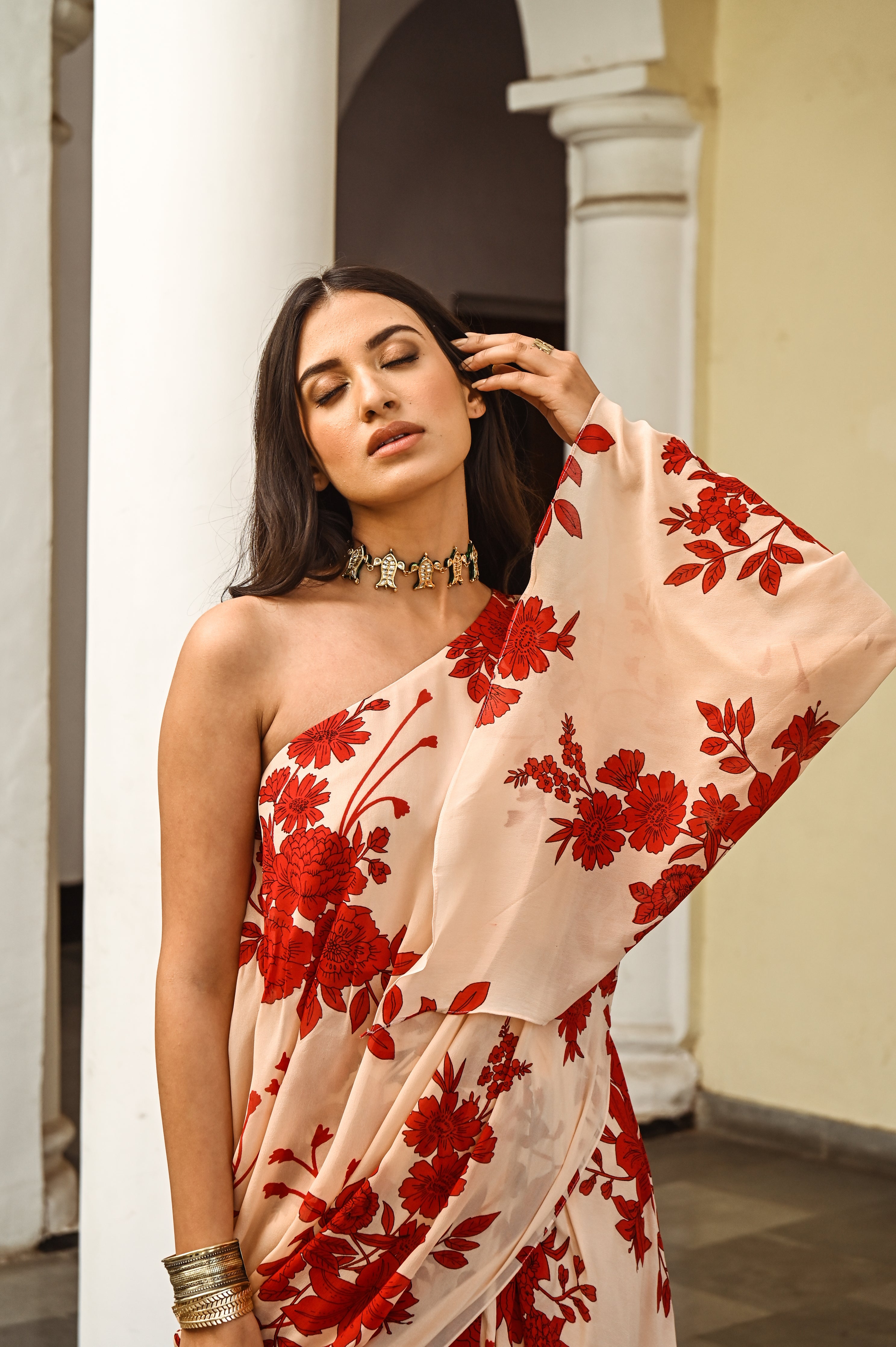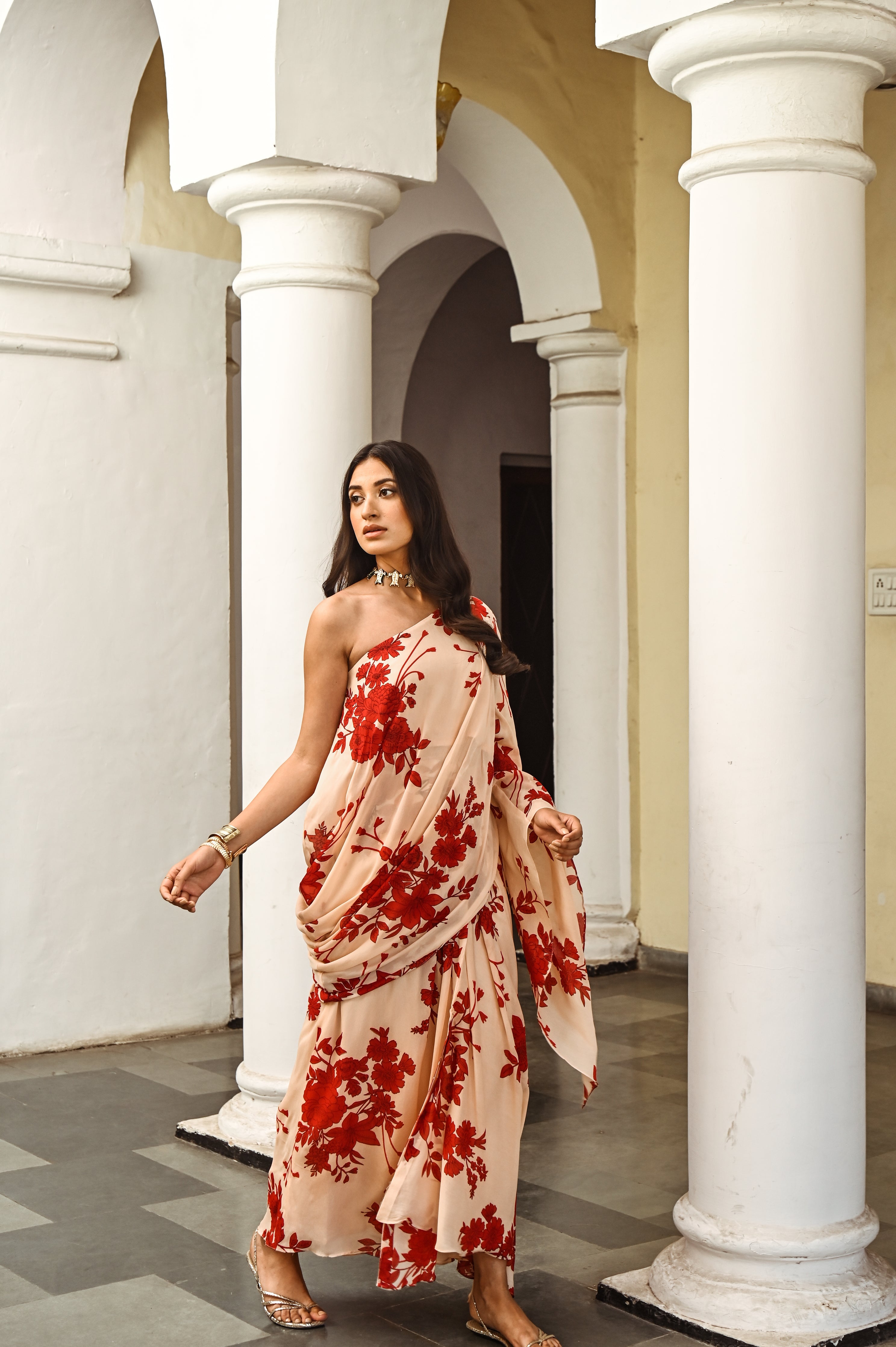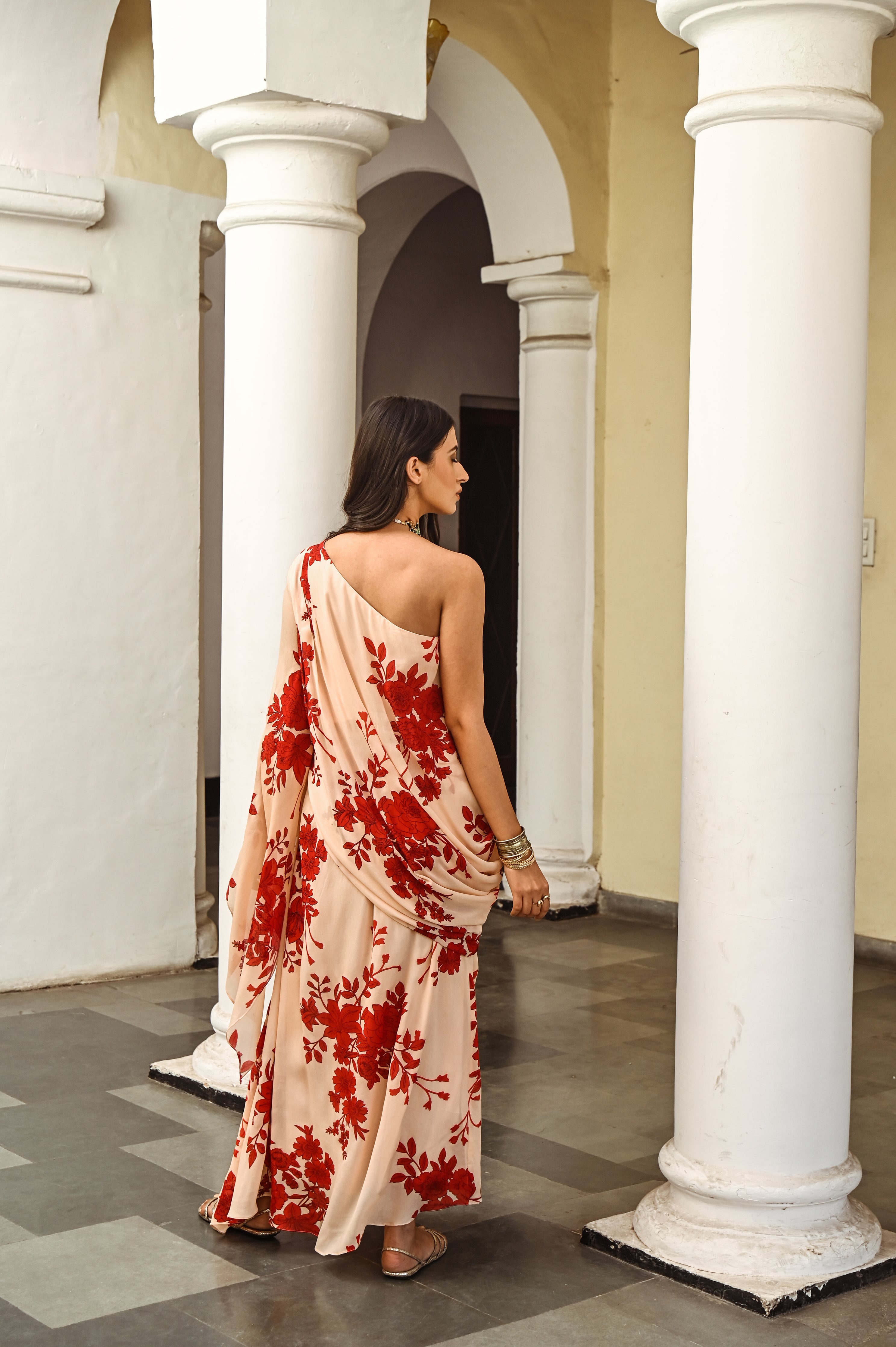 MITALI WADHWA | RED FLORAL SUHANA ONE SHOULDER TOP, SKIRT & BELT SET