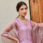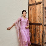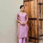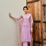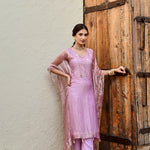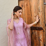 Featuring a lilac tissue kaftan in tissue base with tassels. It is paired with matching cotton pants.