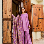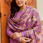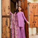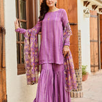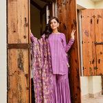 Our signature beautiful short kurtain purple with matching garara finished with antique gold detaling at the edge. It comes with a beautiful floral pure chnaderi odhani for the elegant and royal look