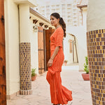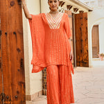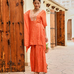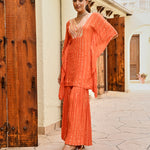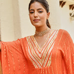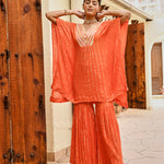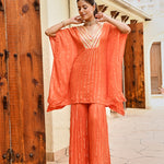 Here comes our signature orange lurex fabric in the most versatile Kaftan silhouette. complete with intricate gotta work; this soft cotton lurex kaftan is as comfortable as its stylish. It come with ivory lurex sharara