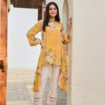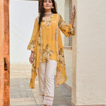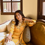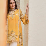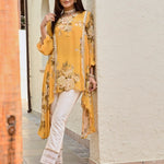 Top in soft crepe with intricate hand embroideries with gold gota and thread at the neckline and sleeve end along with delicate pearl work.Trousers in soft crepe and contrast organza and lace details at the edge.