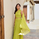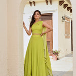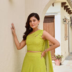 Details: lime green bandhani lehenga in crepe base with a crop top .The classic one shoulder crop top comes with an attached half dupatta for the look and ease. Hem of the lehenga is a beautiful silver and gold thick gotta