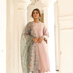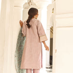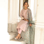 A line kurta with straight pants in a soothing lilac colour. Mint printed organza dupatta with intricate gold scalloped. Exquisite benarasi detailing on the sleeves cuff. The Diya set is festive must have in all its grace and glory. The kurta & pants is lined with soft cotton.