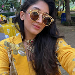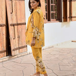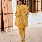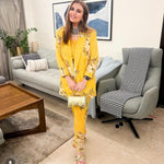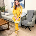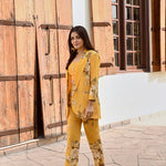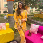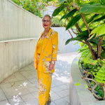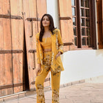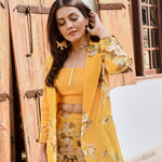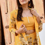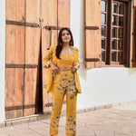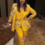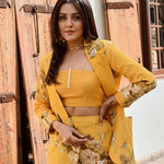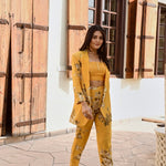 Make heads turn in this bold and structured statement making piece. Soft pure crepe blazer , crop top and  flair pants with intricate silver coin detailing. This outfit is the epitome of style, glamour & comfort.Style this outfit with statement earrings .