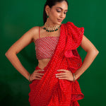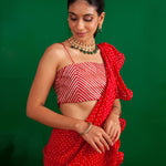 SHAHEEN ABBAS | TOMATO RED BANDHNI DRAPED RARA SAREE, GOTA CROP TOP AND BELT