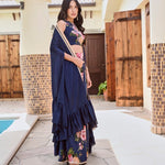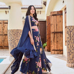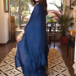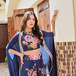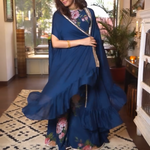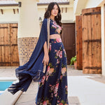 Powder Blue silver detailing at the edges. Blue and ivory  printed crop top with flared pallazo trousers. The ruffle detail on the cape add to the romance of this easy breezy outfit. A comfortable and elegant outfit, cut a striking picture in our Zeeba set.