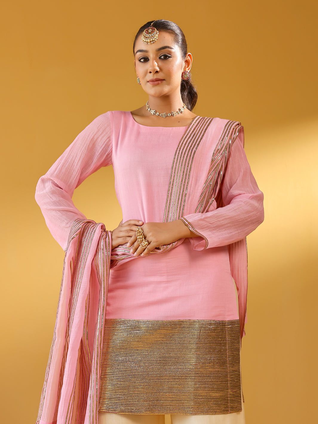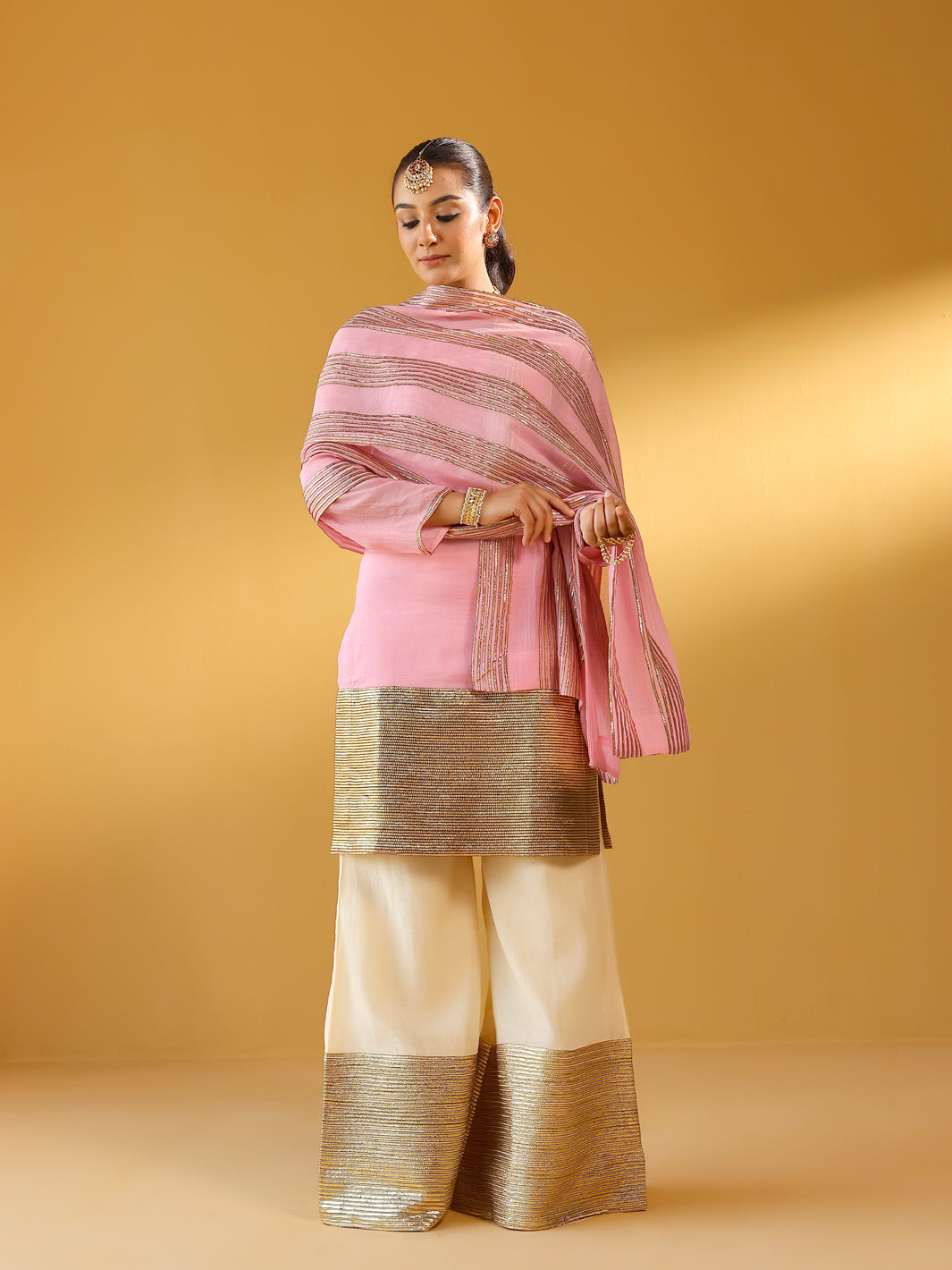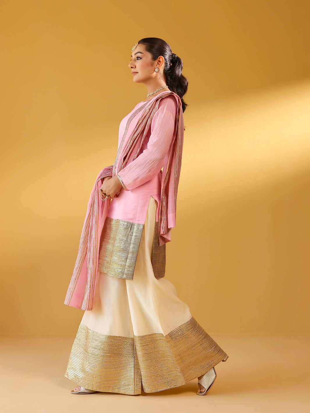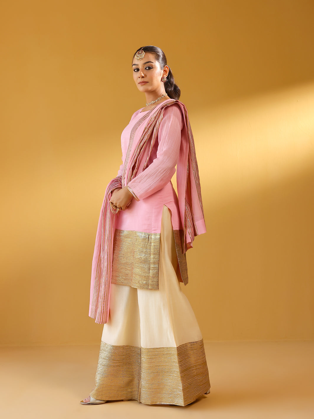 Pure soft chanderi kurta with extremely fine and intricate dull gold gota embroidery at the hem. This kurta set comes with a pure chanderi odhani with intricate gold detailing. The sharara is warm offwhite with a matching dull gold embroidery .This simple yet classic sharara set is a must have for every wardrobe. Pair it with polki or gold jewellery for an exquisite royal look.