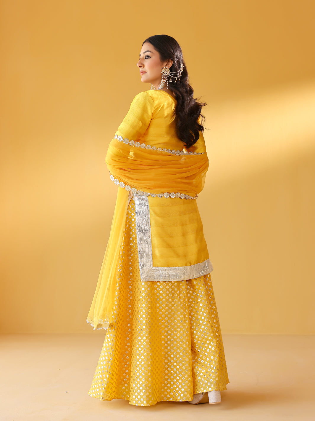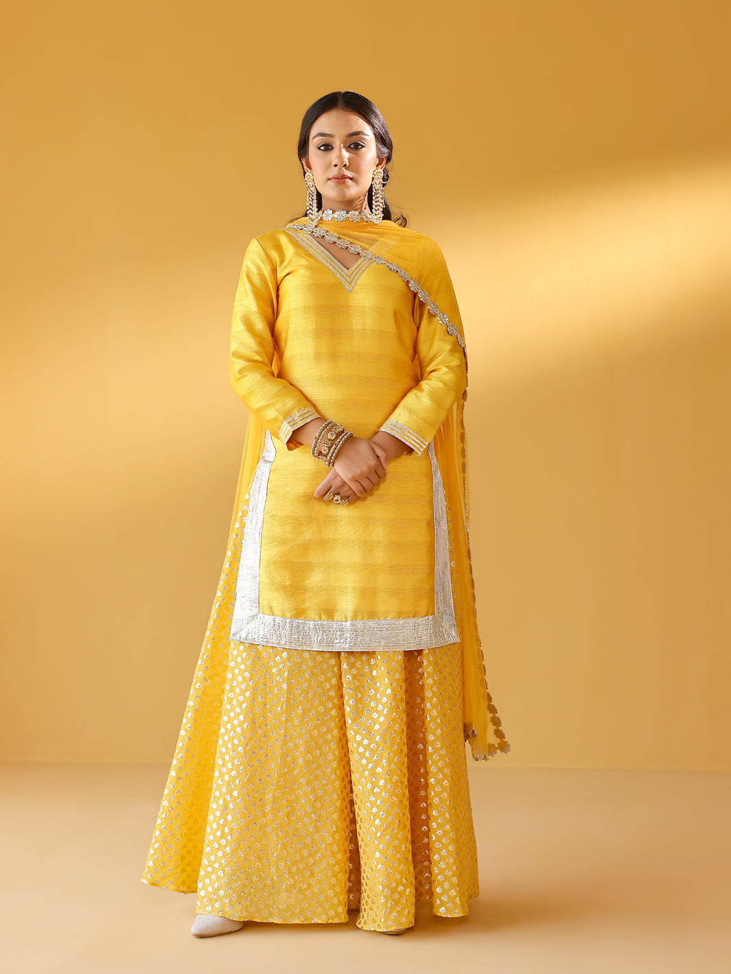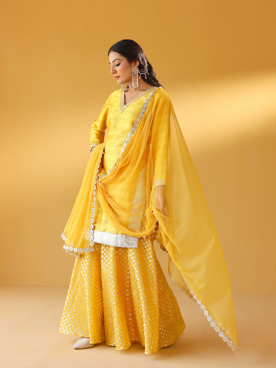 Dupion silk kurta with intricrate gota emboidery at the hem. Benarasi sharara & net odhani complete this sunshine yellow set. Style it with pointy pumps & statement earrings.