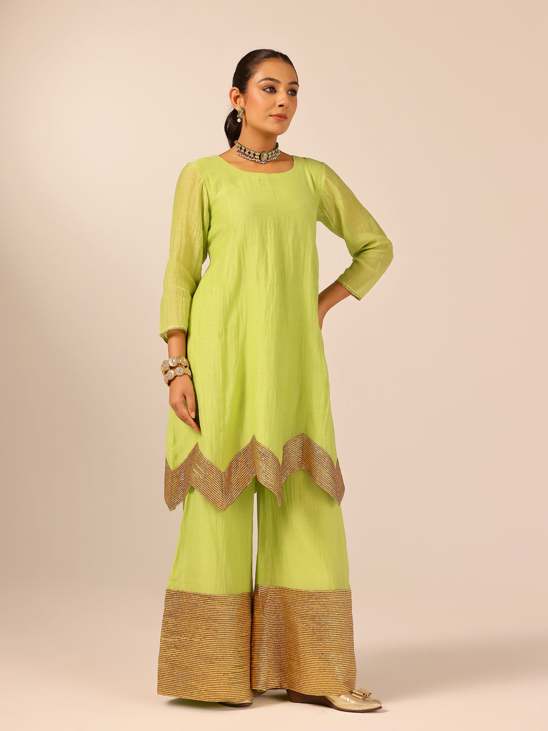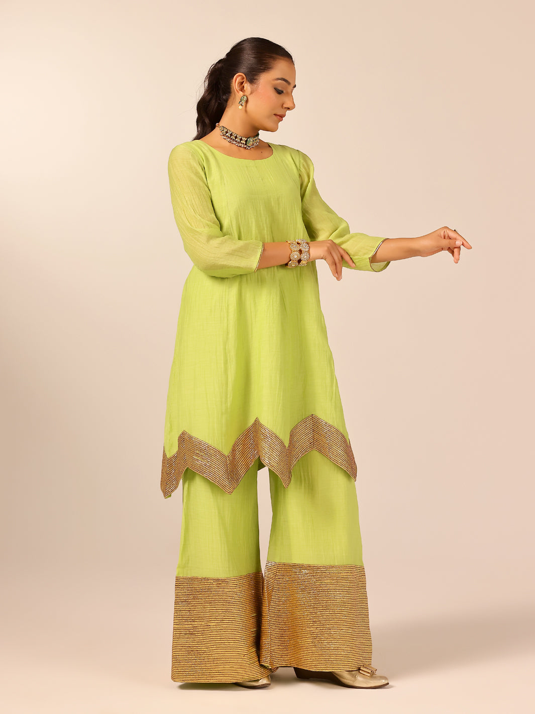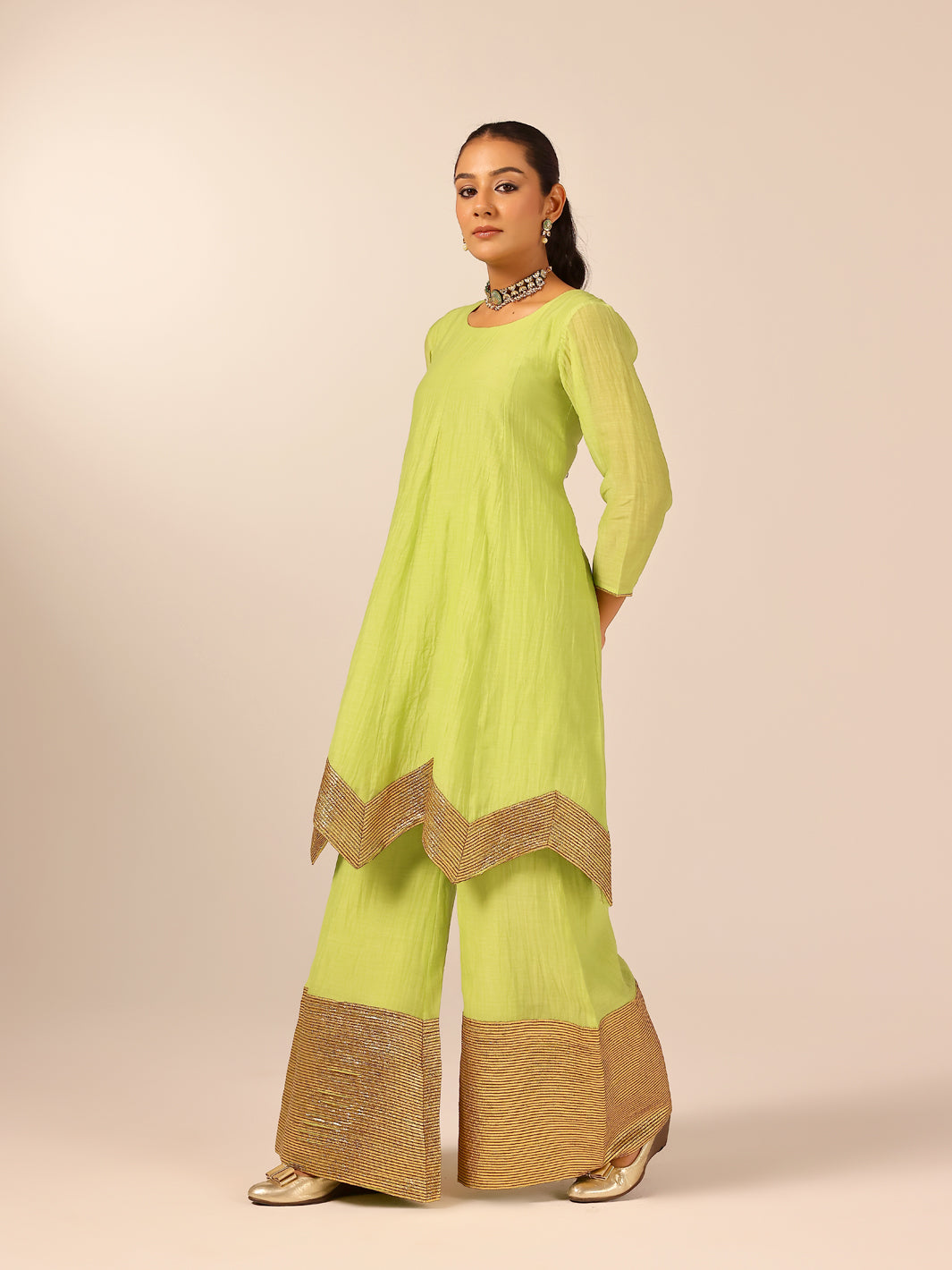 Pure soft chanderi kurta with extremely fine and intricate dull gold gota embroidery at the hem. This kurta set comes with a pure chanderi odhani with intricate gold detailing & matching sharara with a gold enhanced hem. A must have this festive season.