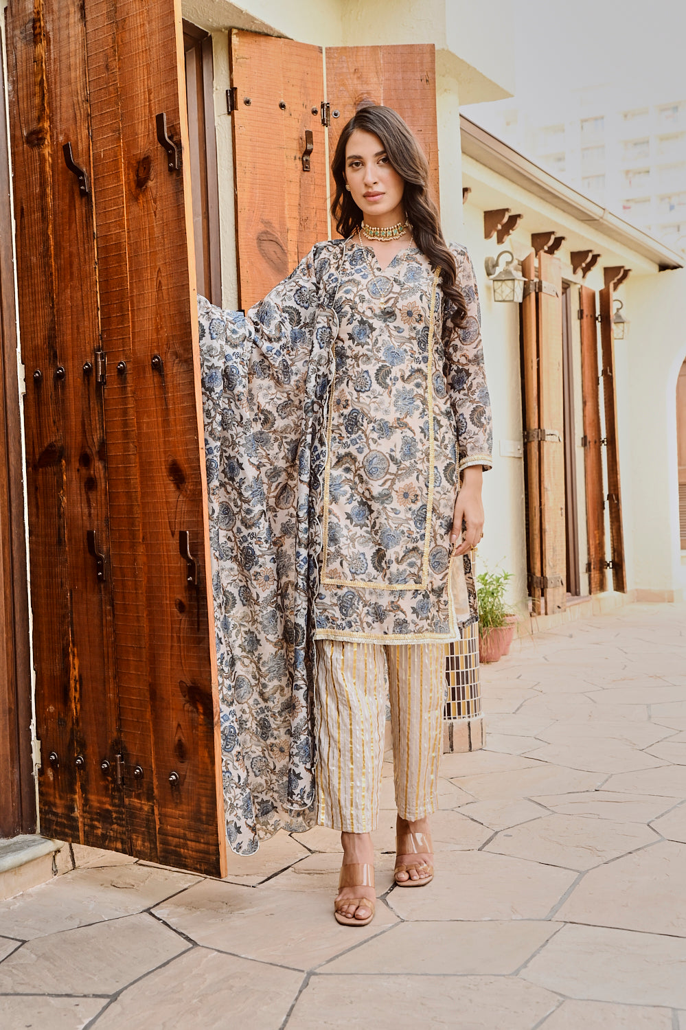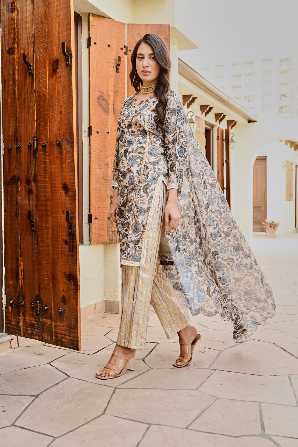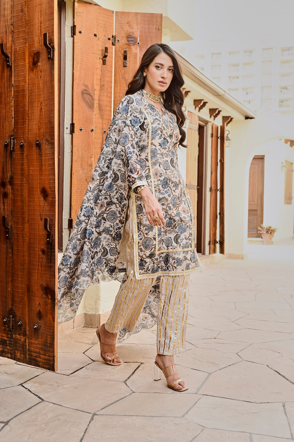 BEIGE & NAVY NURA CHANDERI KURTA, GOTA PANTS AND ODHANI SET OF THREE