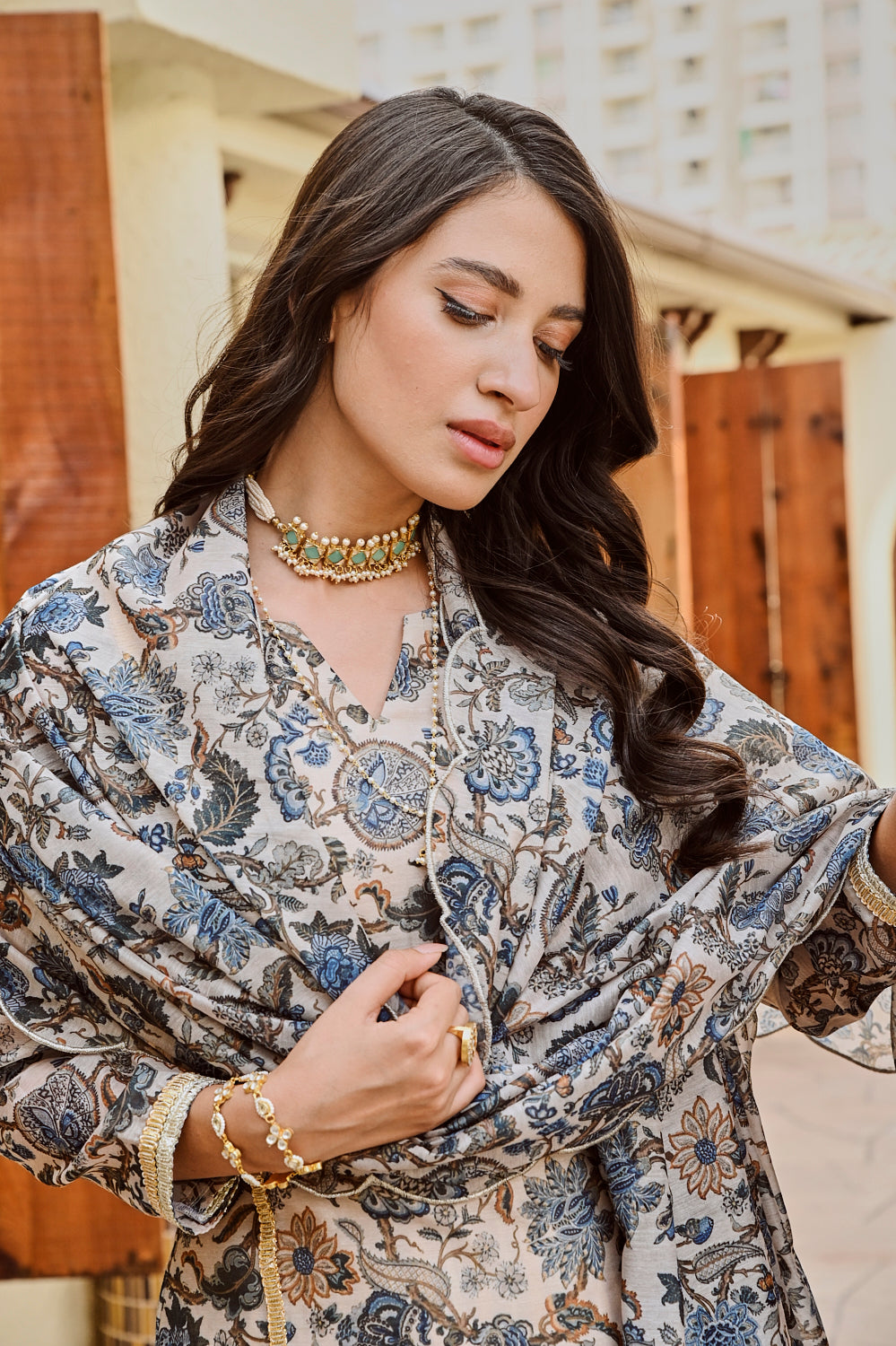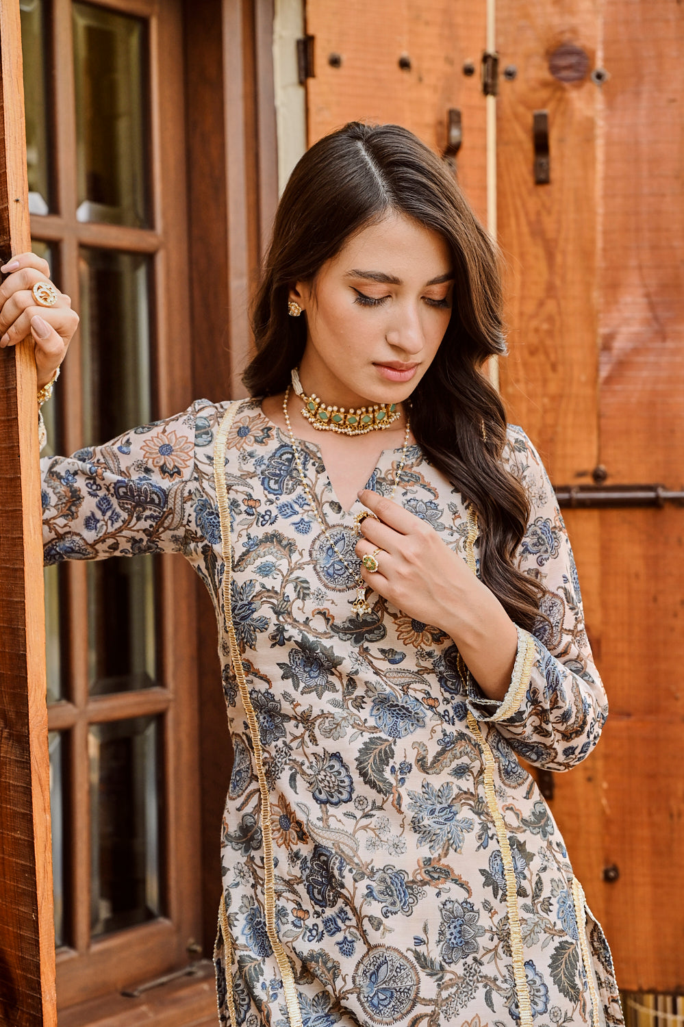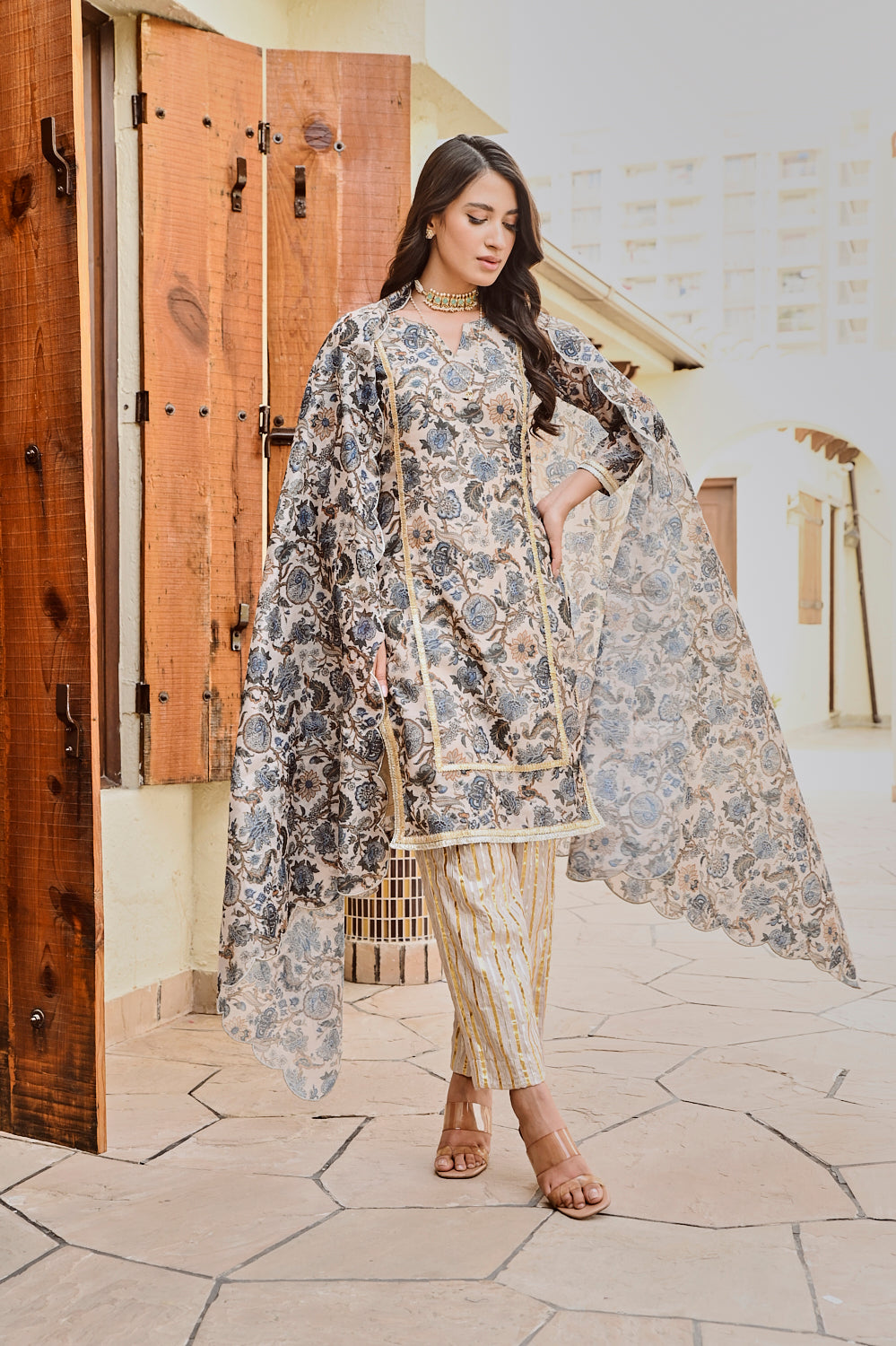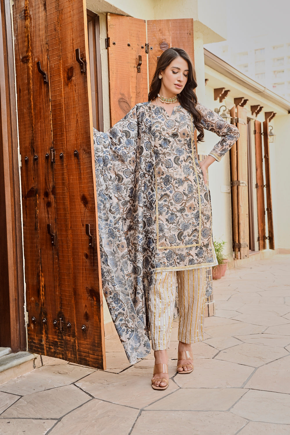 BEIGE & NAVY NURA CHANDERI KURTA, GOTA PANTS AND ODHANI SET OF THREE