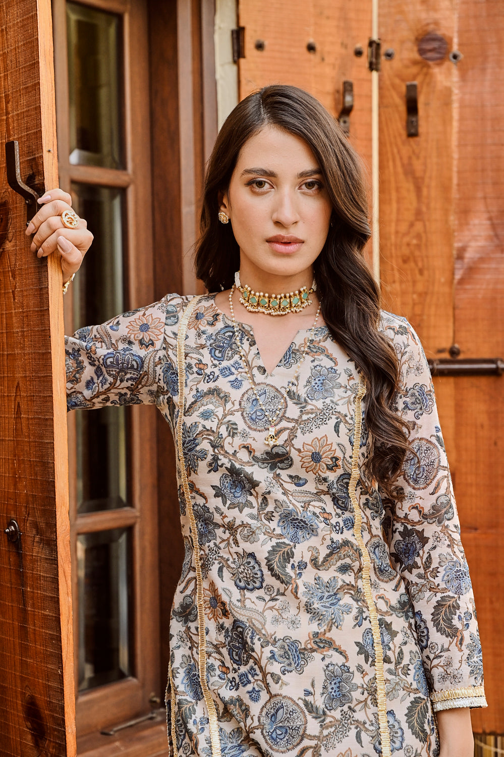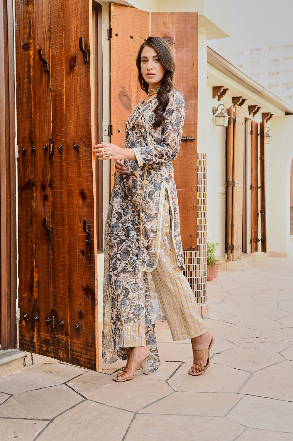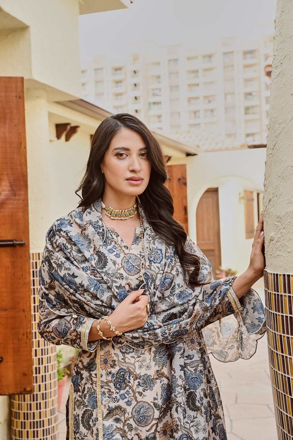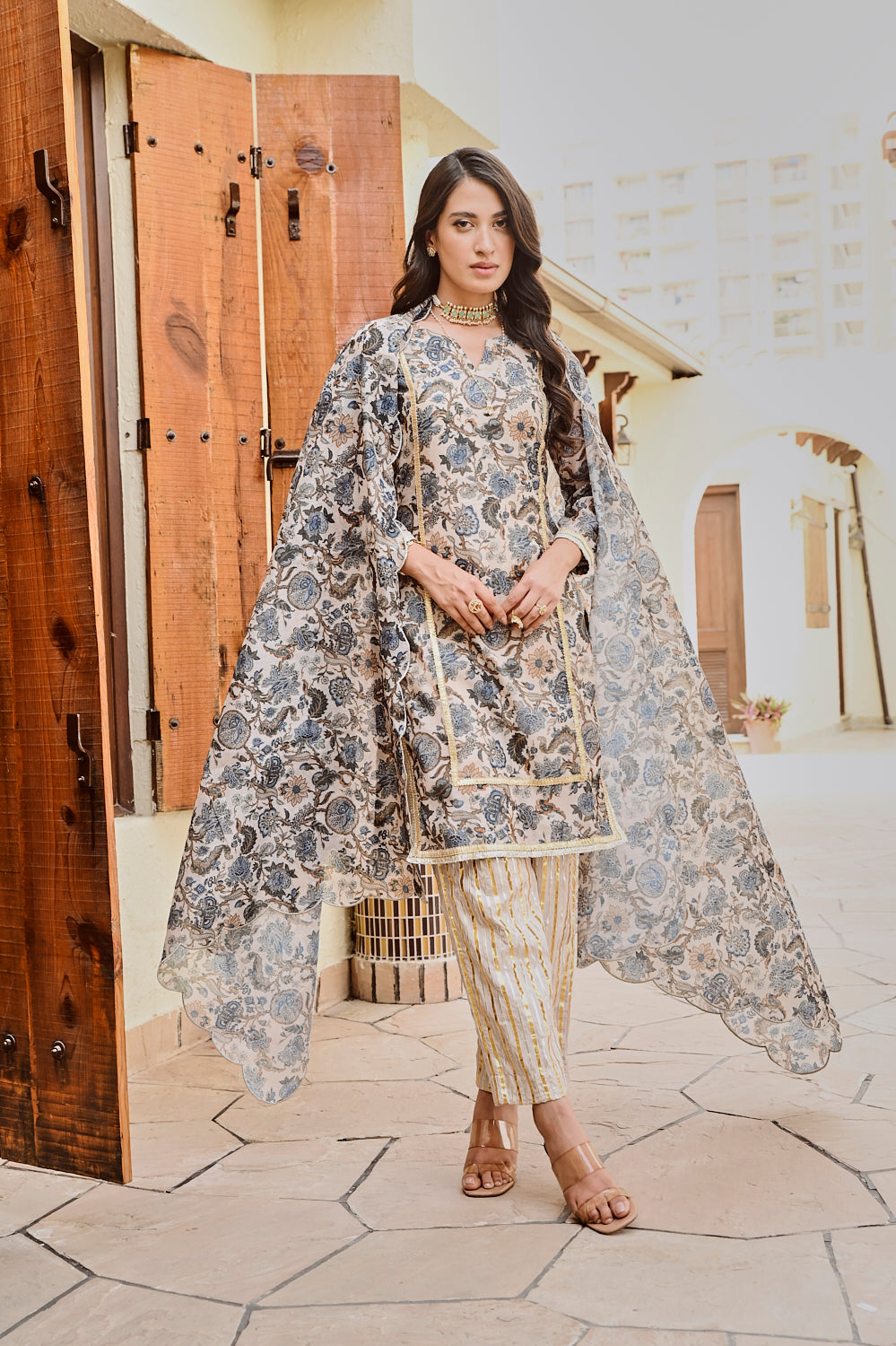 Pure chanderi staraight kurta in pastel grey and blue floral , intricate antique gold gota detalinng with matching grey floral chanderi odhani. This set is paired with chanderi straight pants with heavy intrictae gold gota hand work along for that fuss free festive look .