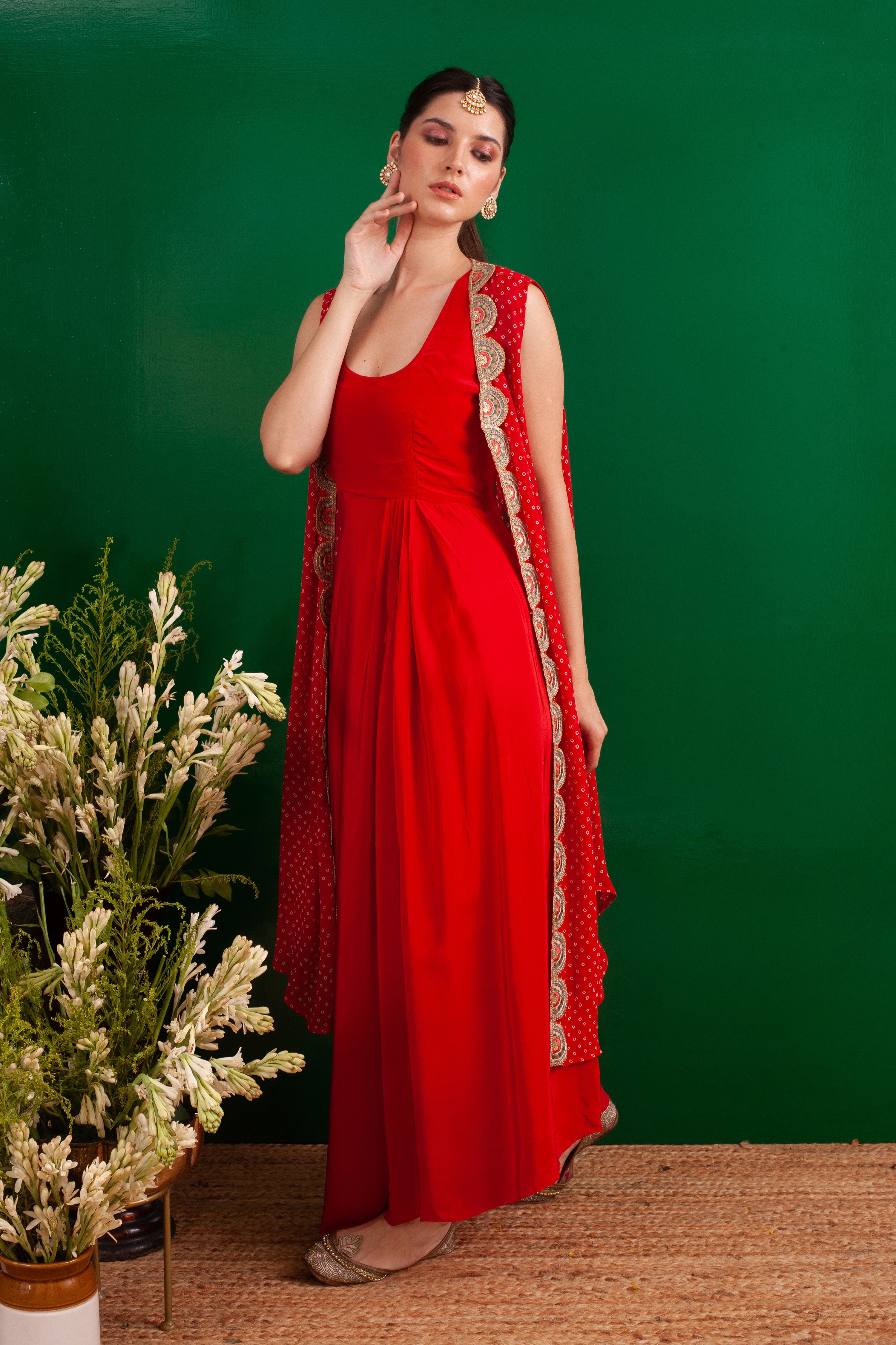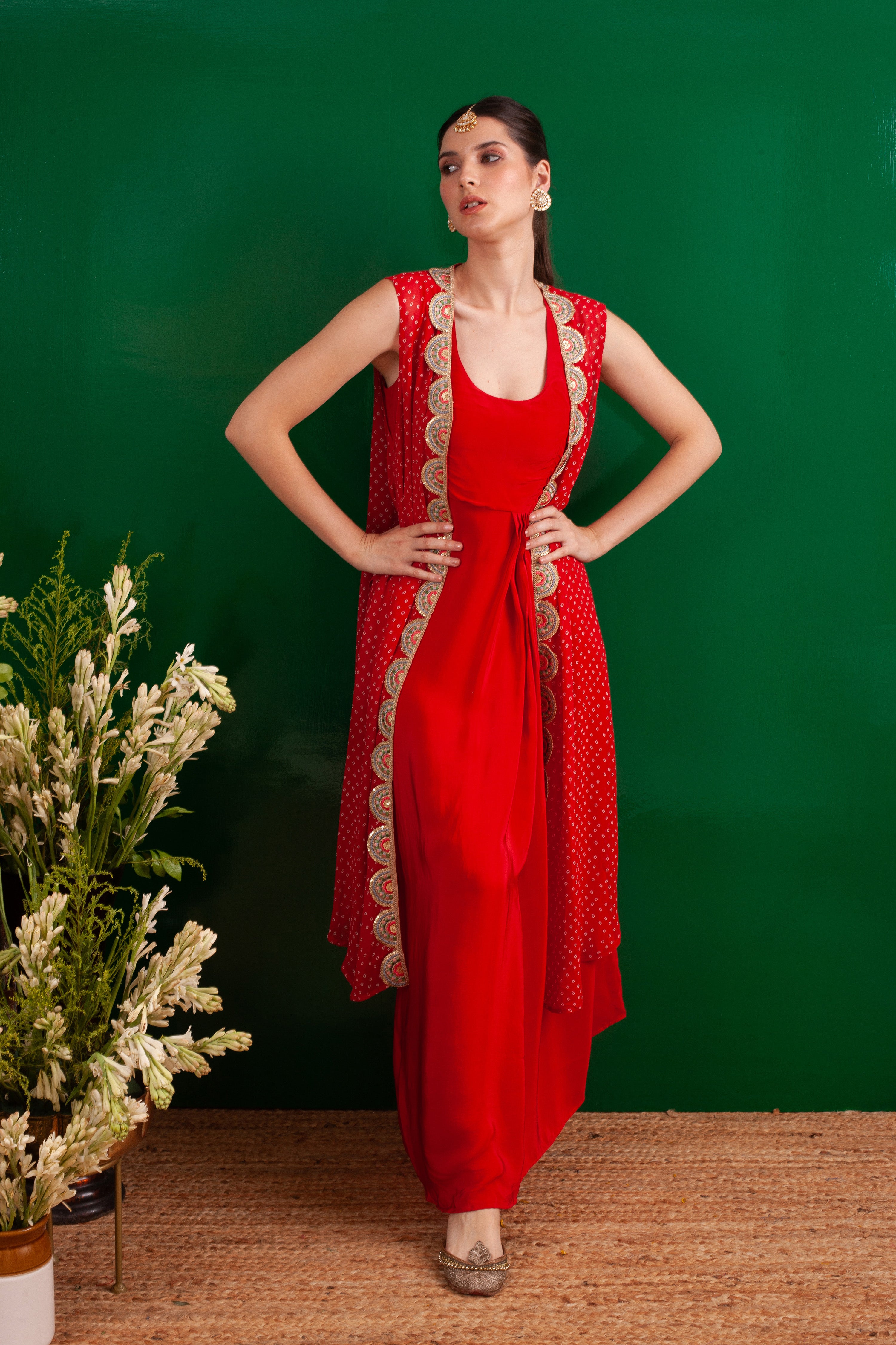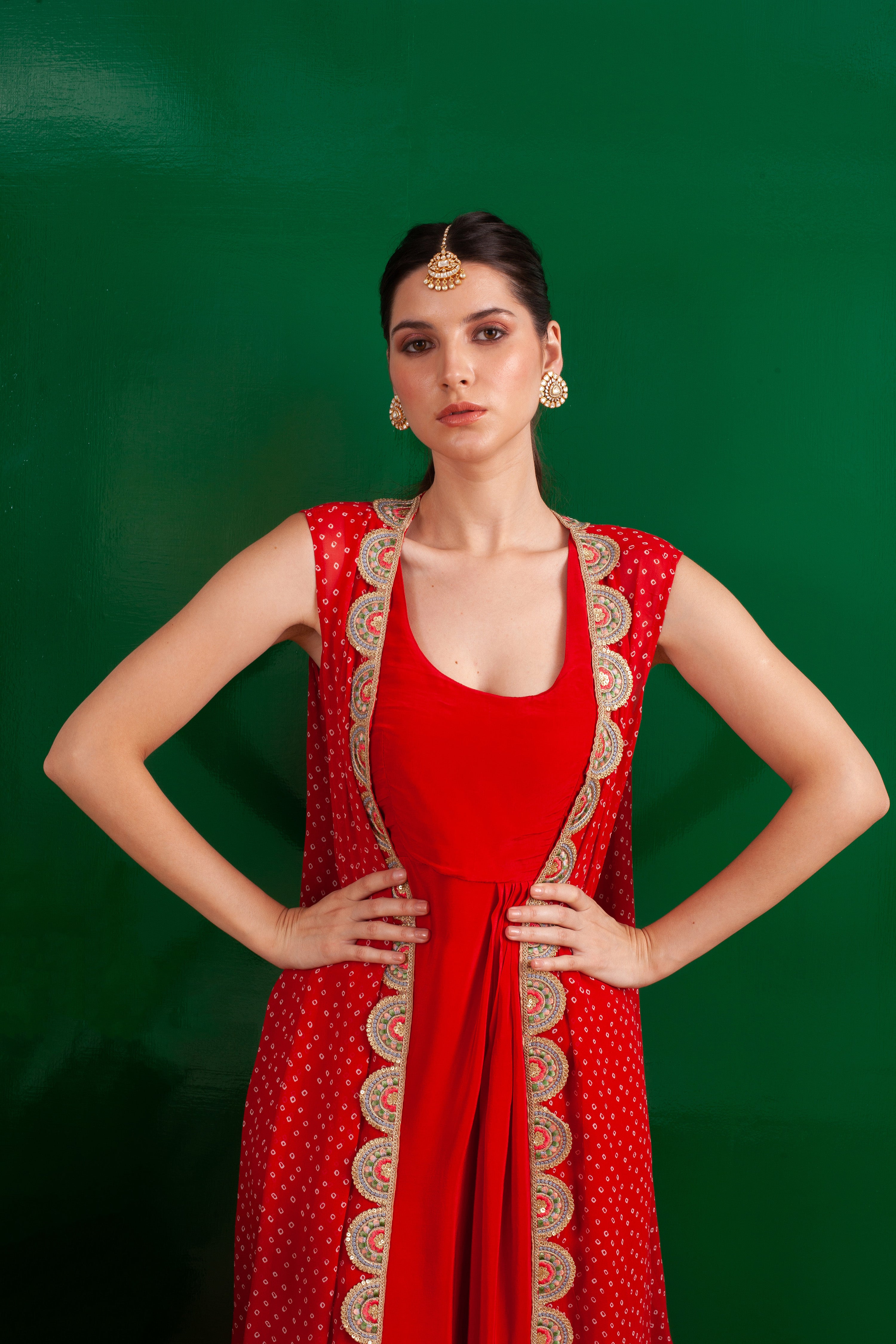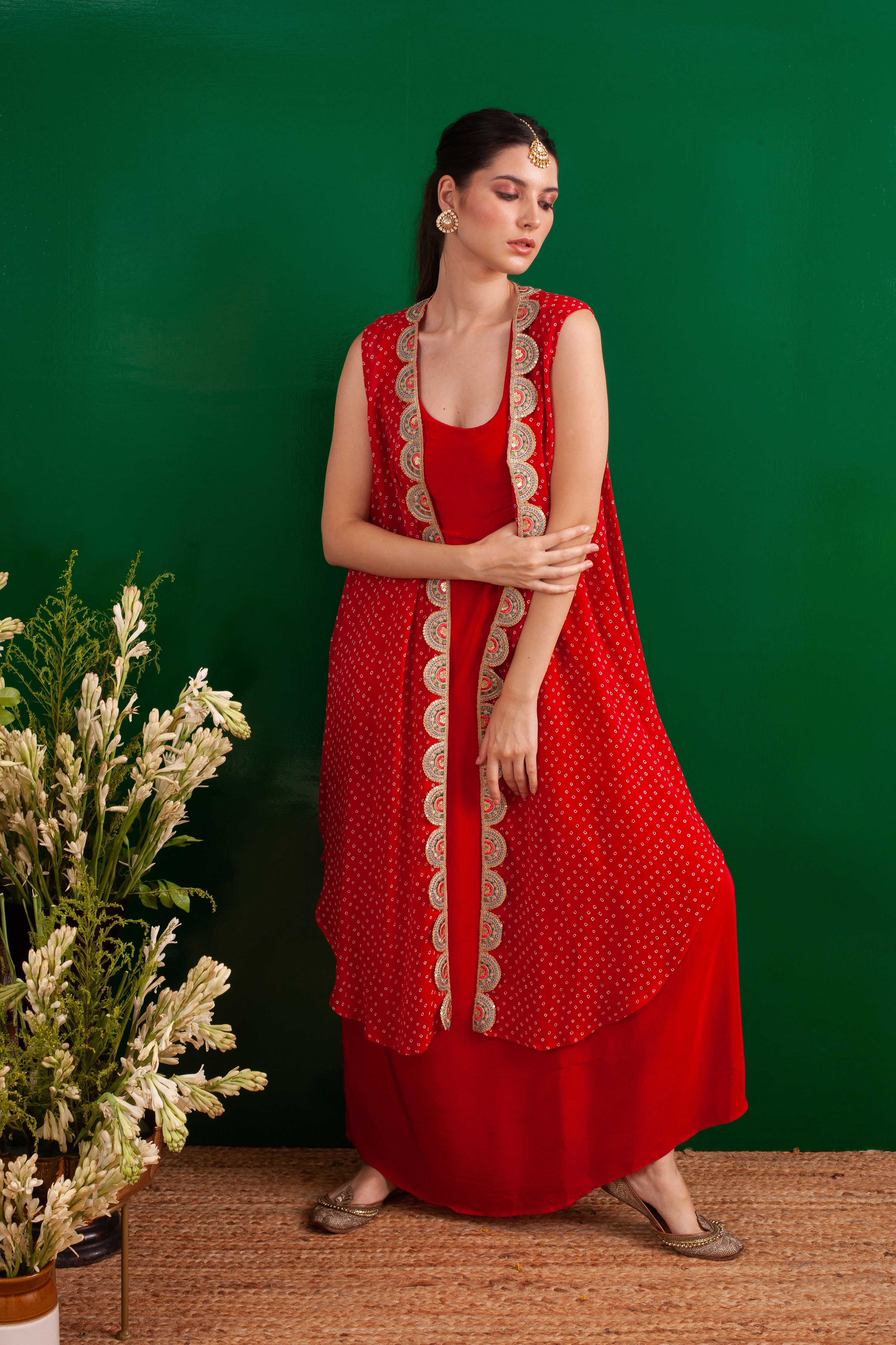 RED BANDHANI TASHA CAPE AND DRESS SET