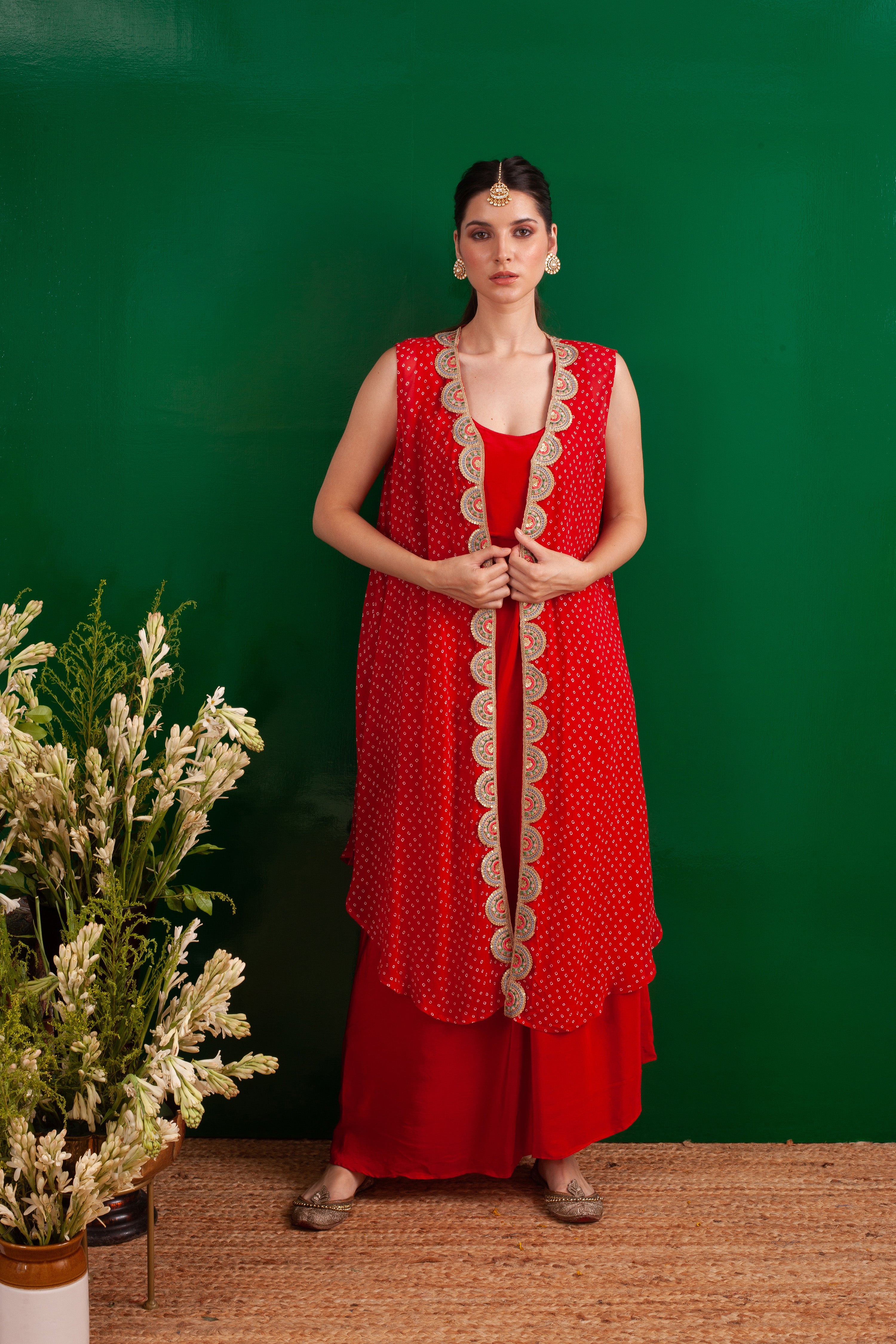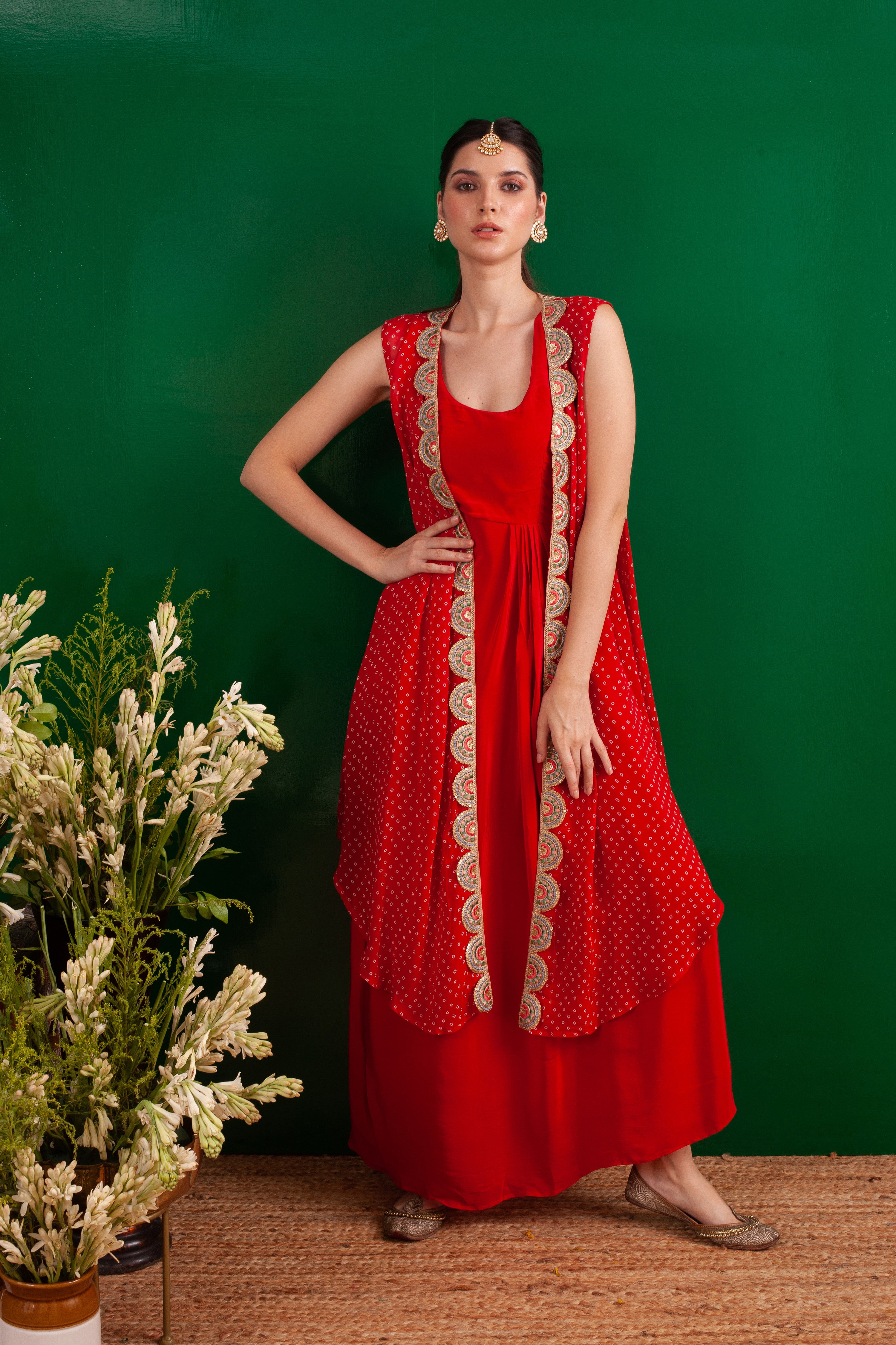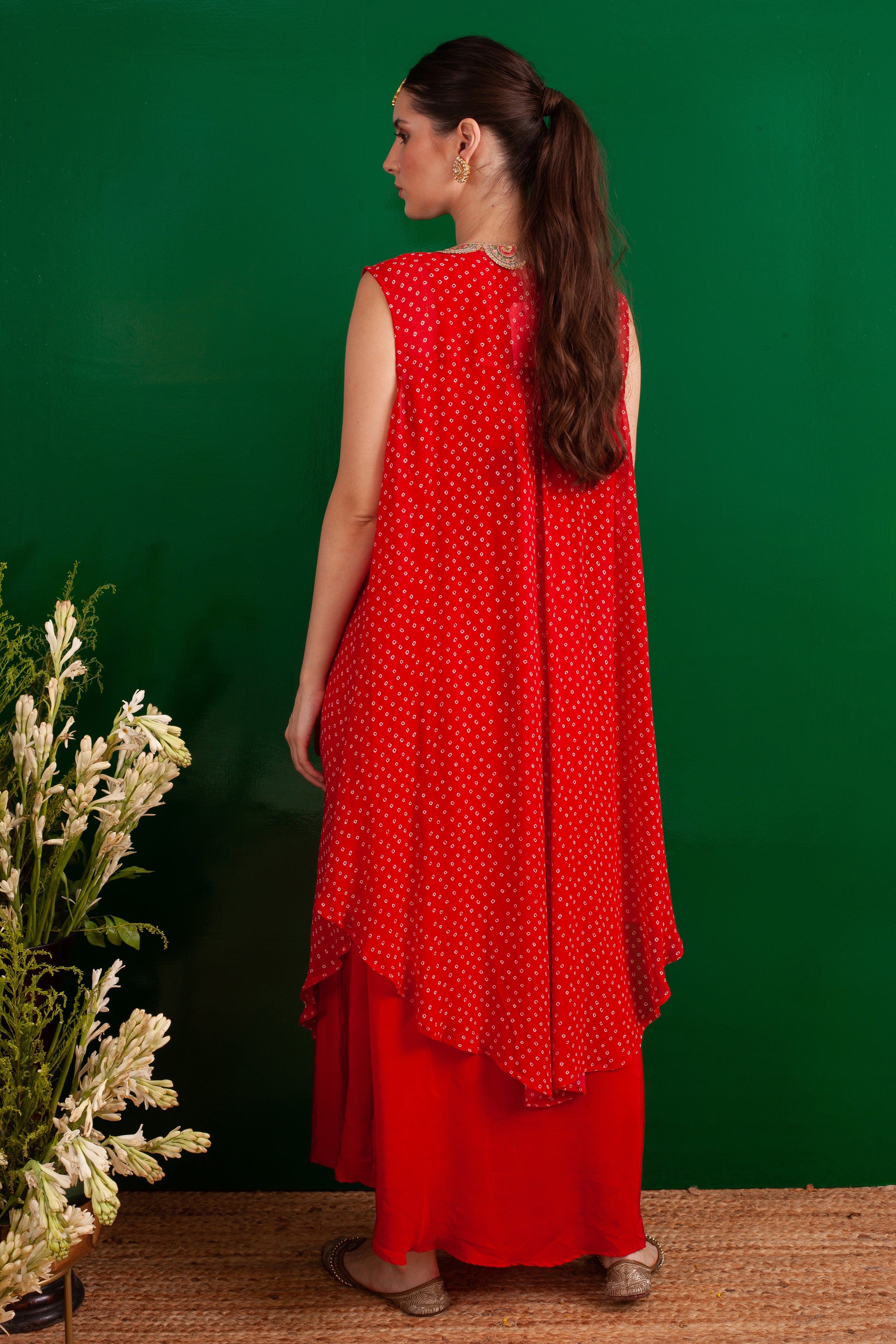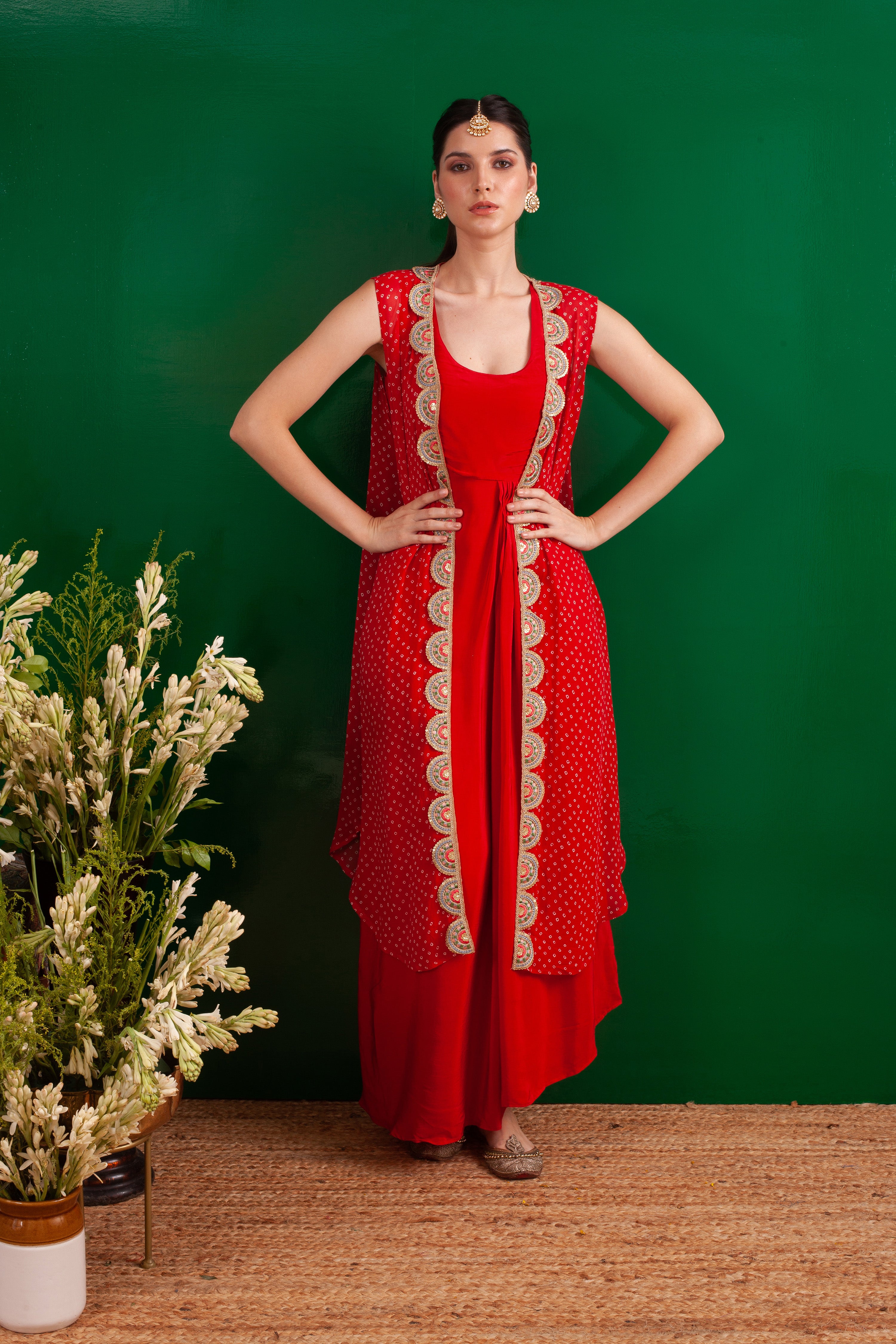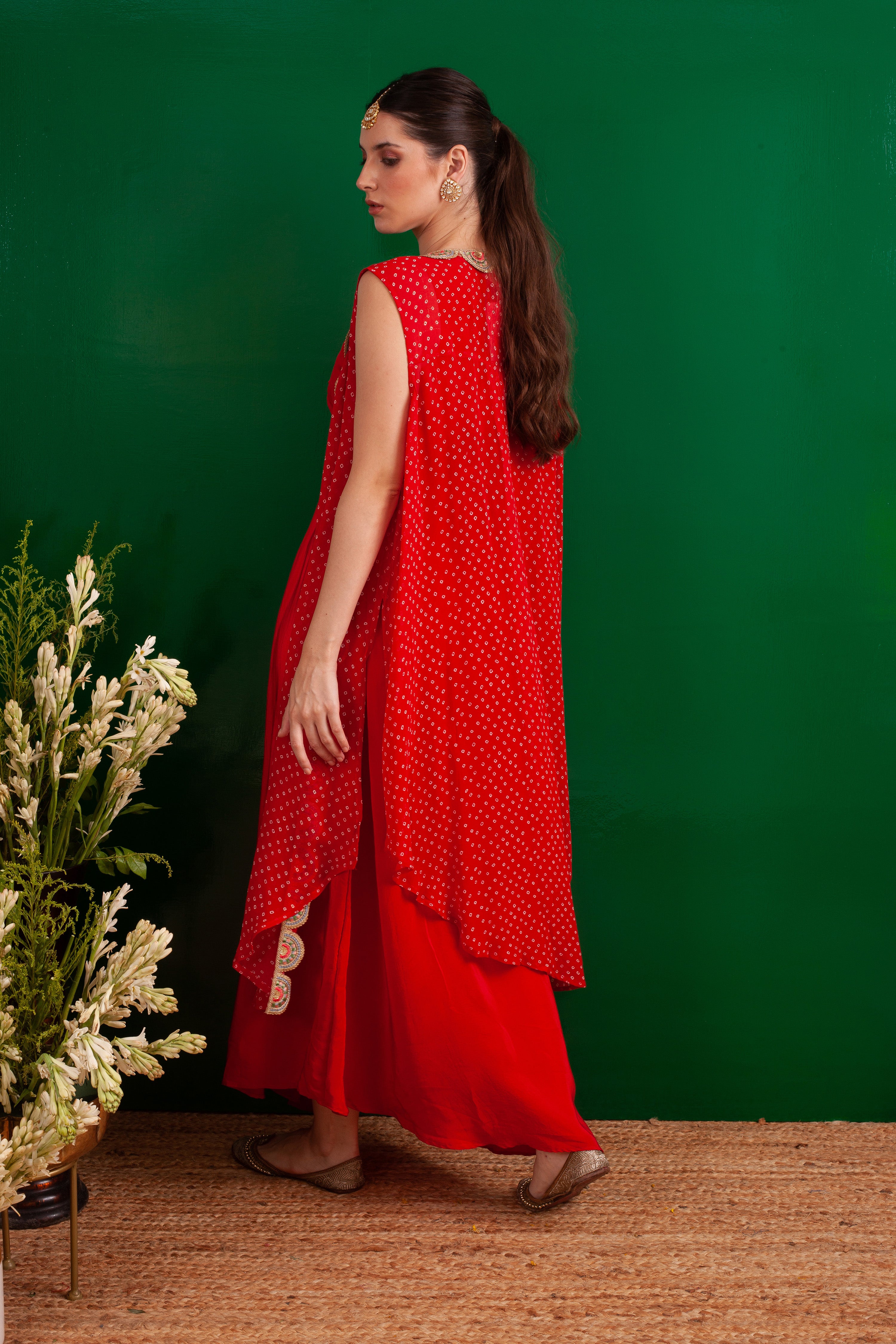 RED BANDHANI TASHA CAPE AND DRESS SET