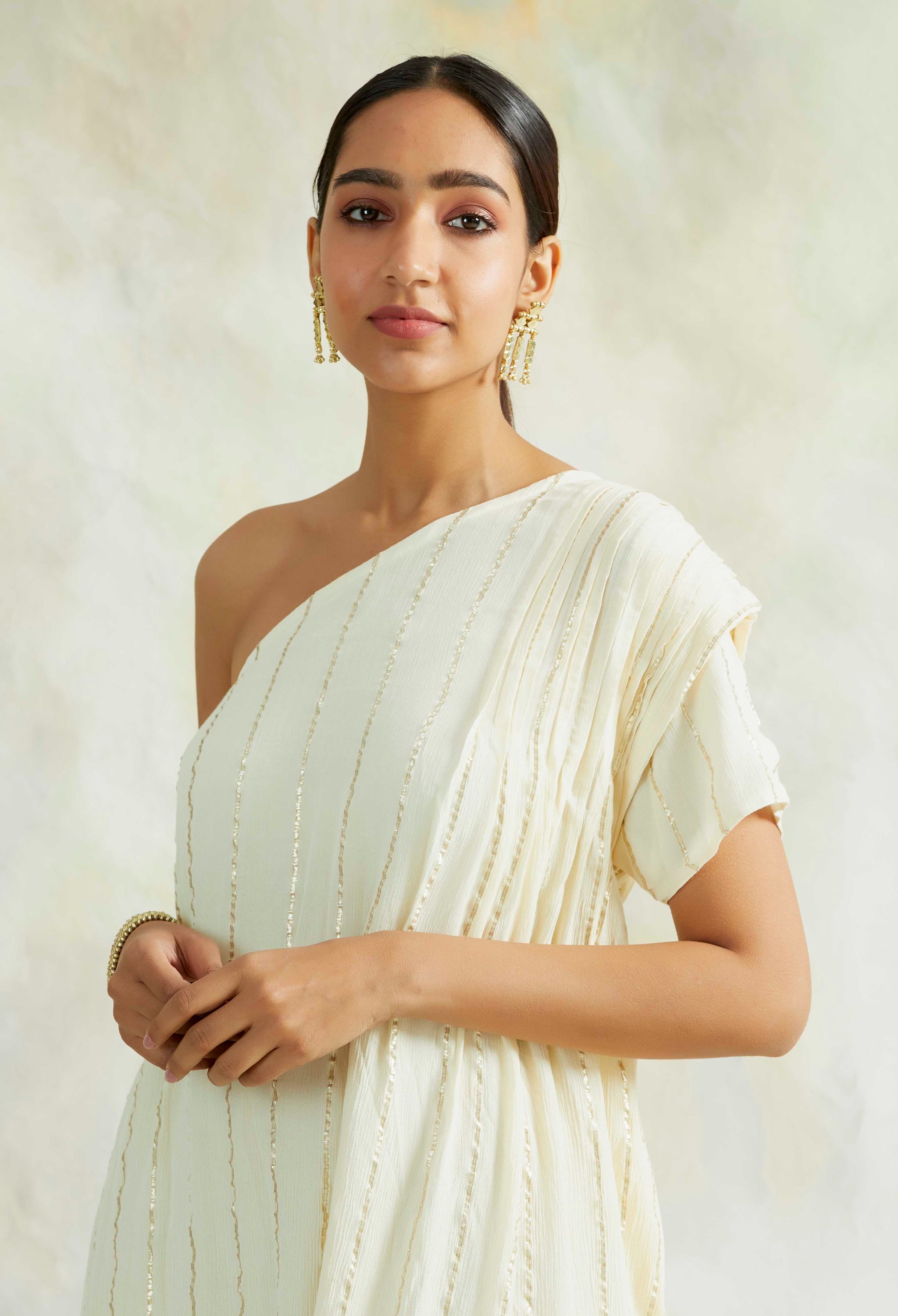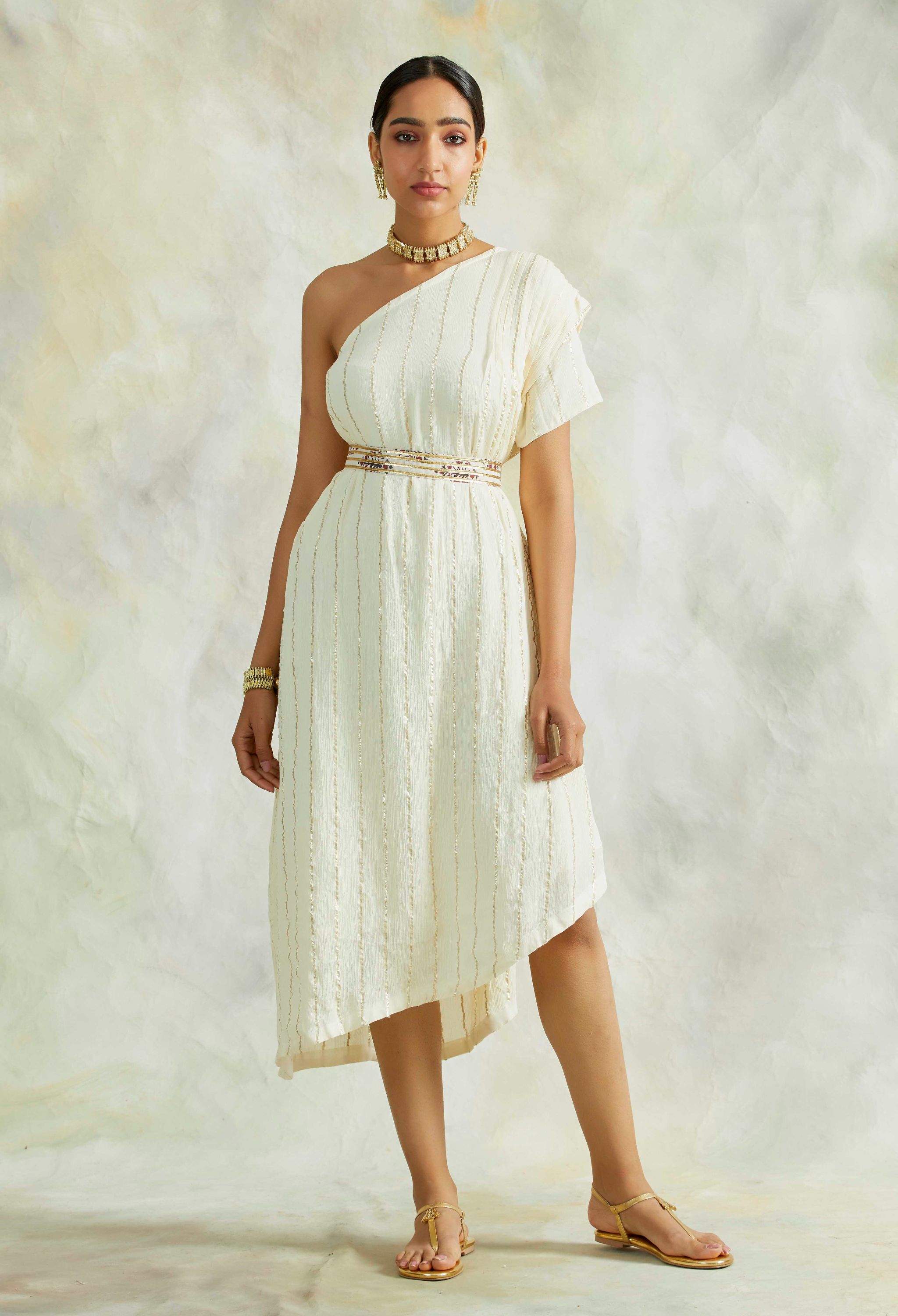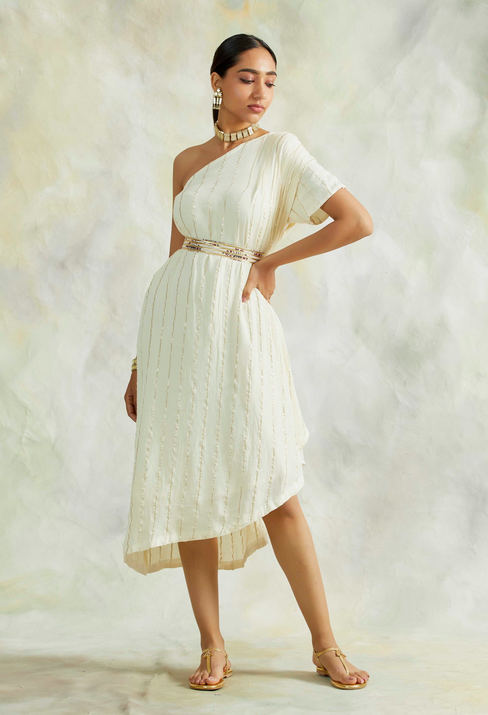One shoulder dress in soft crepe fabric. Delicate gold threads to accentuate the outfit. Cinch it at the waist with a belt or wear it free flowing. Belt is highlighted with gold thread and gota embroidery.