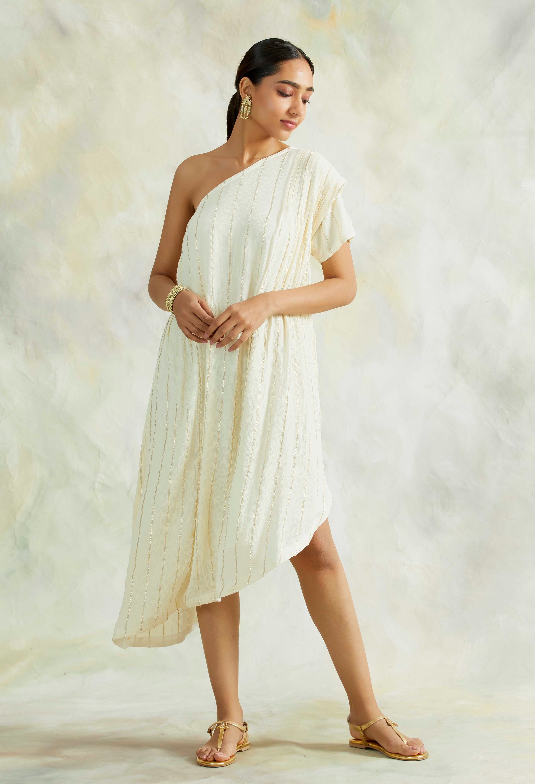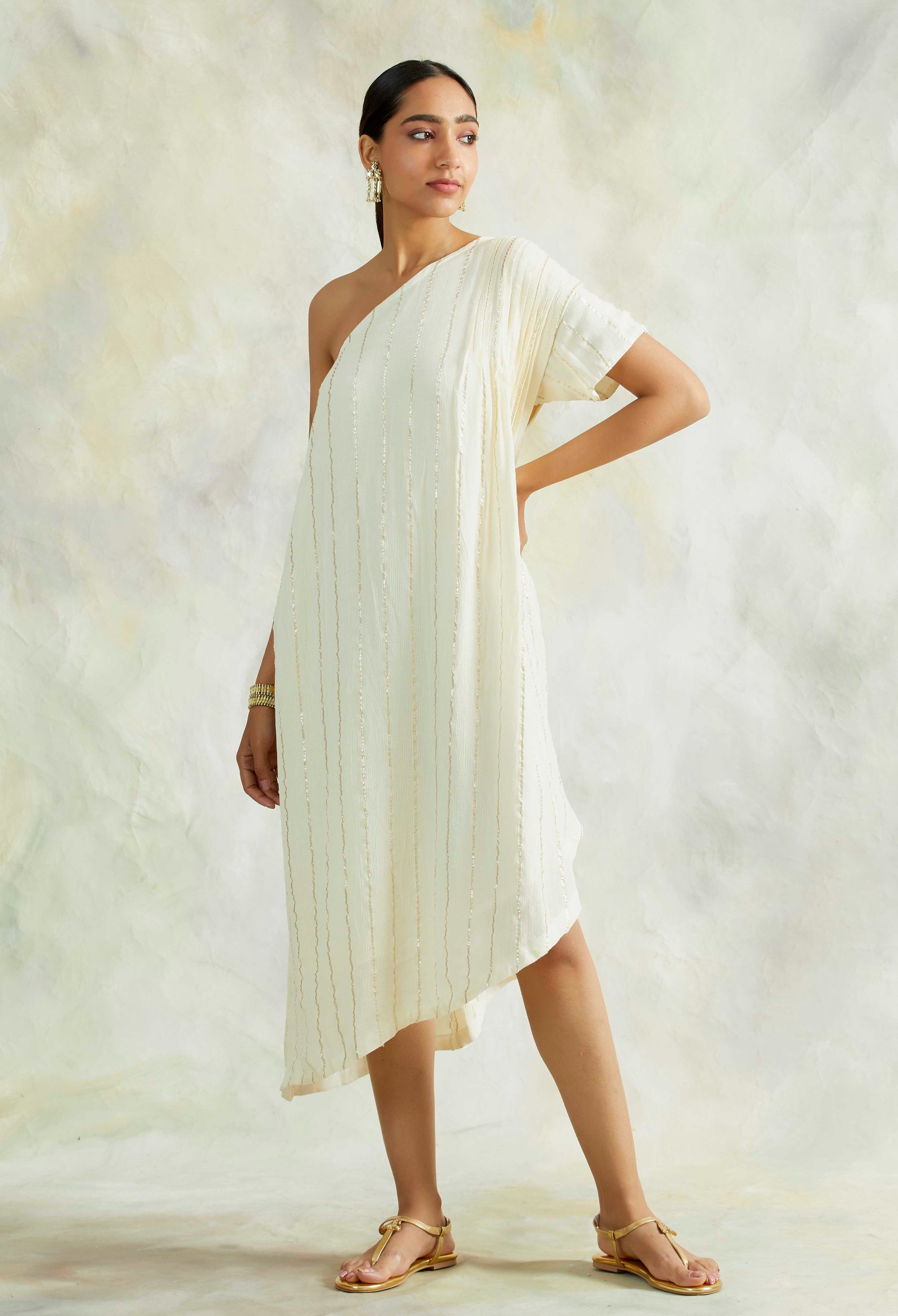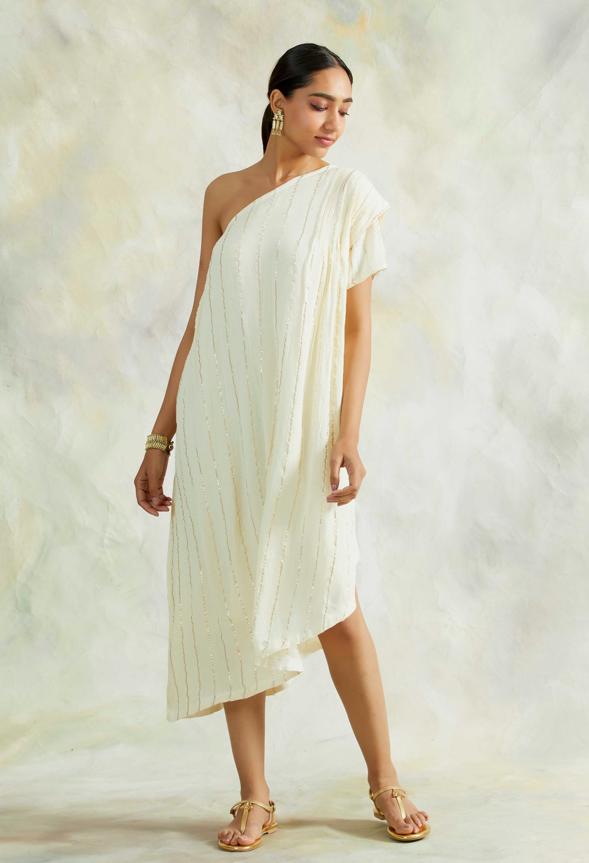 One shoulder dress in soft crepe fabric. Delicate gold threads to accentuate the outfit. Cinch it at the waist with a belt or wear it free flowing. Belt is highlighted with gold thread and gota embroidery.