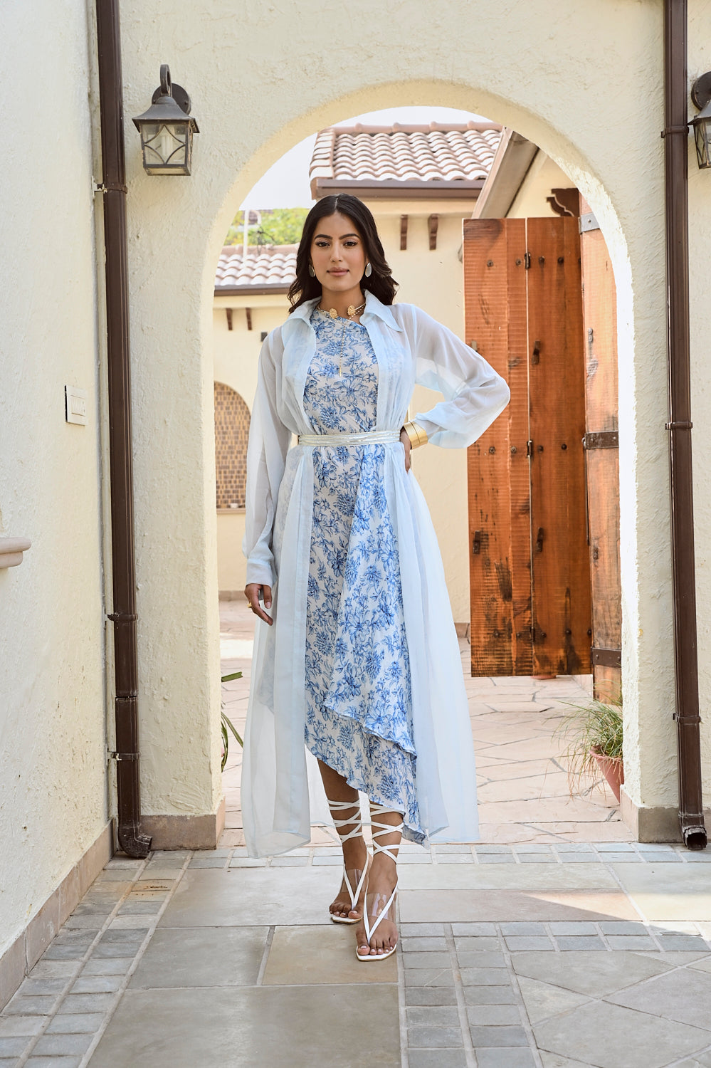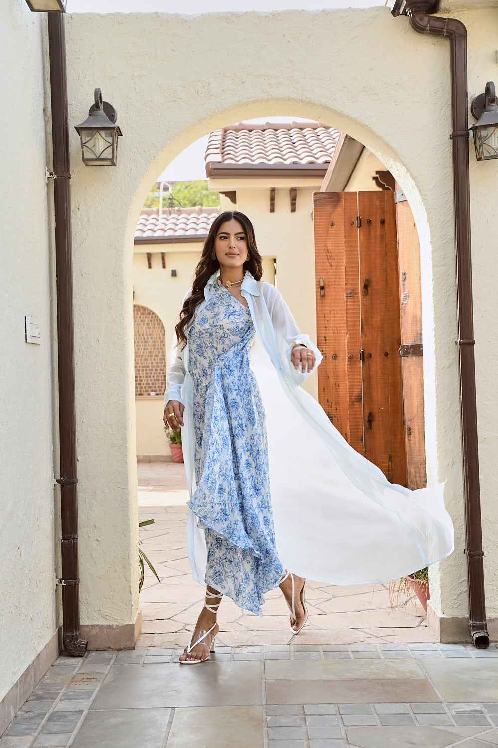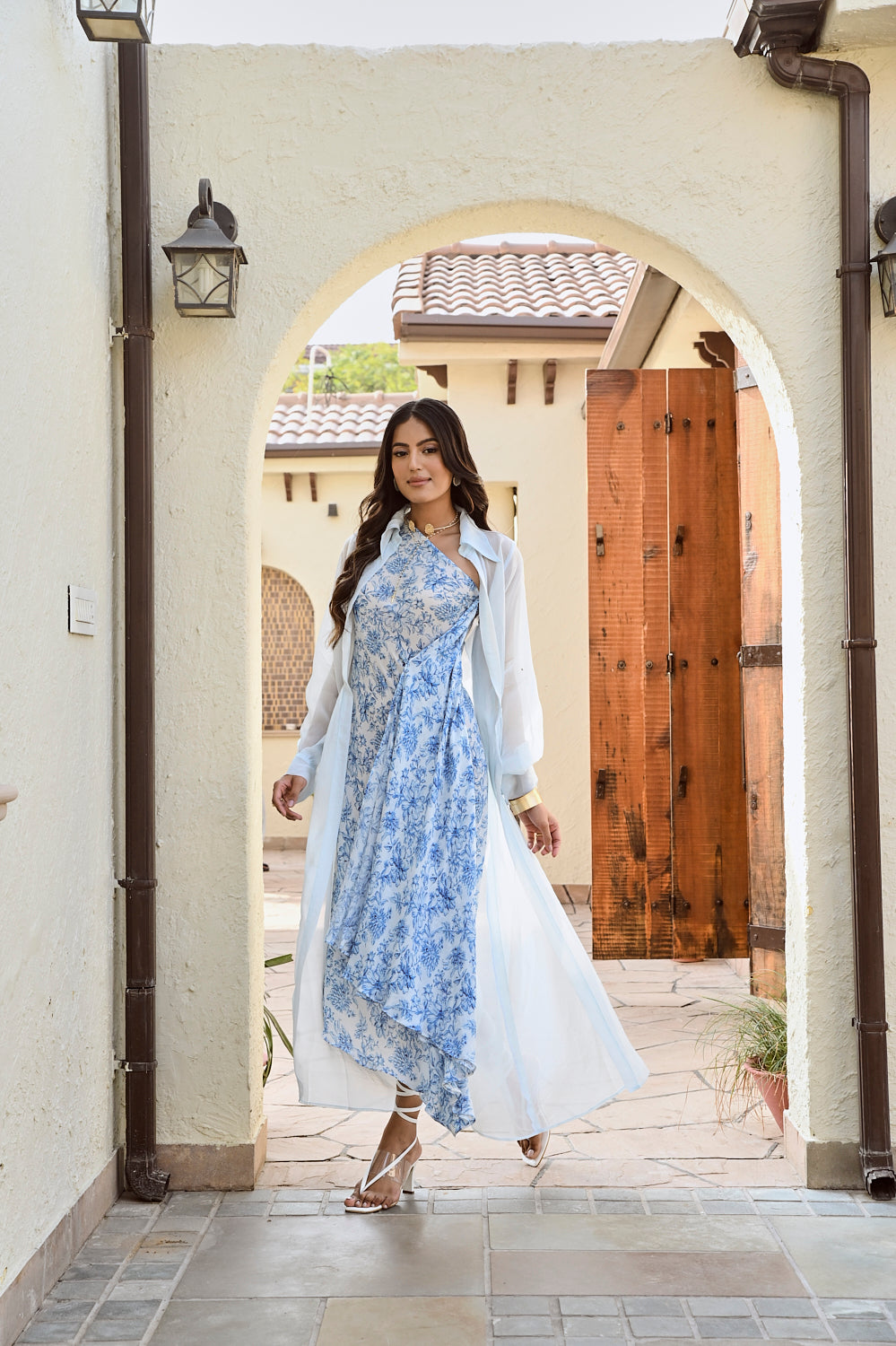 Printed blue and ivory  floral one shoulder dress and delicate organza jacket  Intricate pleated detailing at the waist. A silhouette so stunning, comfortable & stylish, its bound to make heads turn. Style this outfit with a statement gold earrings and pointy pumps.