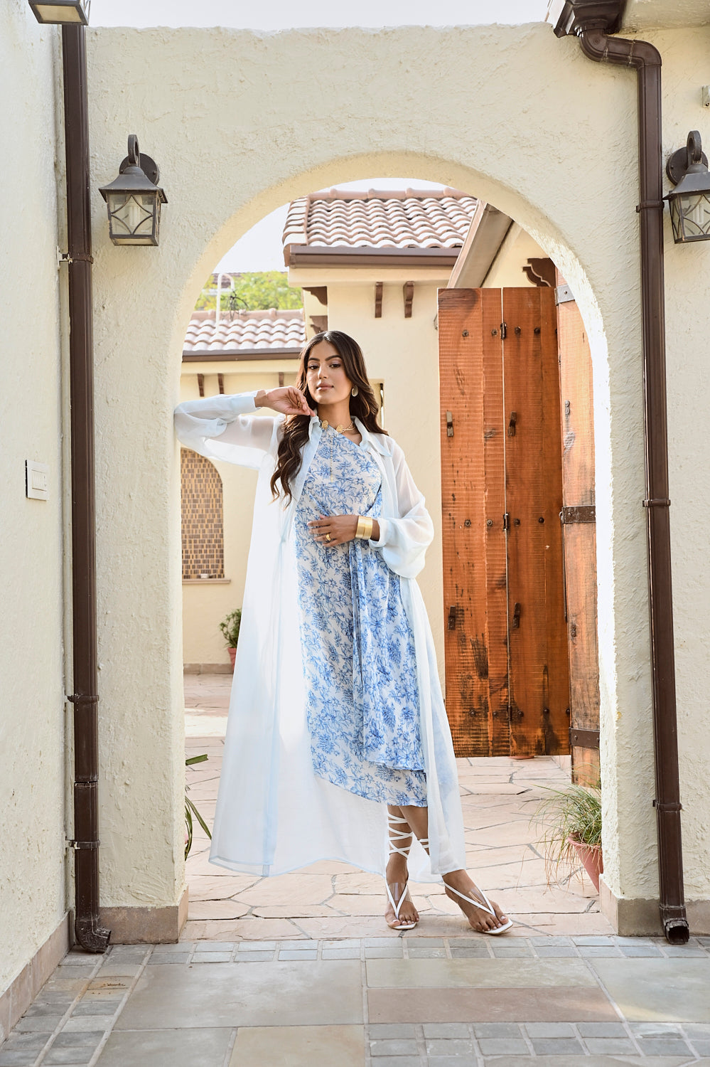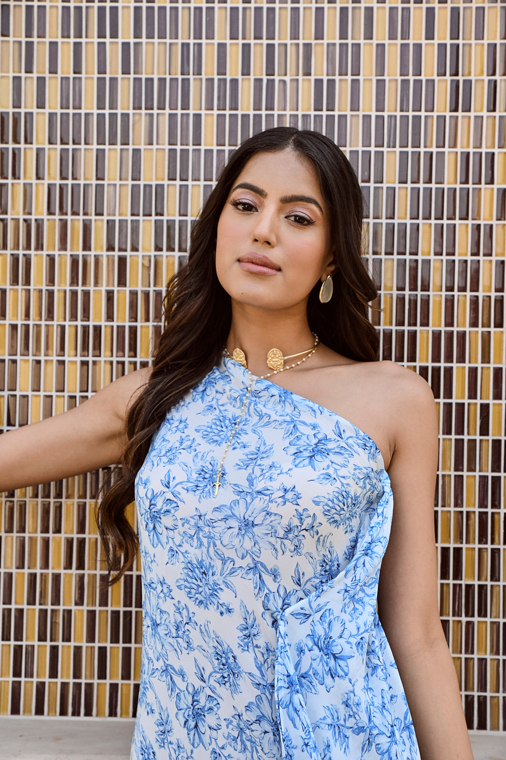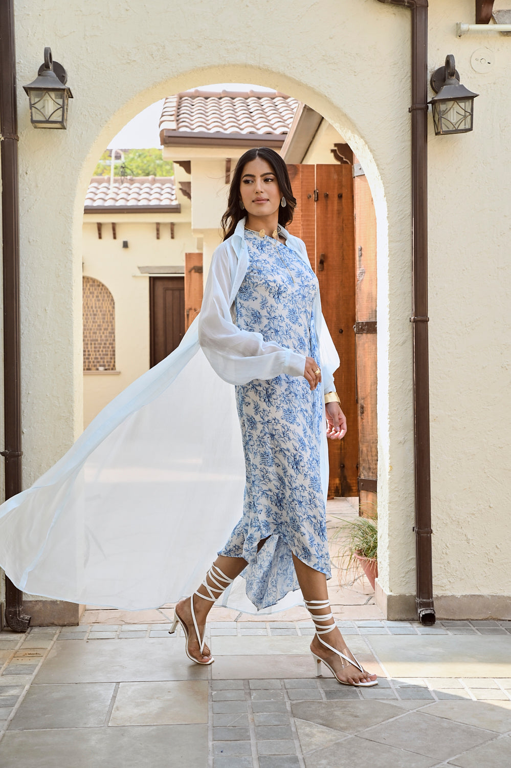 Printed blue and ivory  floral one shoulder dress and delicate organza jacket  Intricate pleated detailing at the waist. A silhouette so stunning, comfortable & stylish, its bound to make heads turn. Style this outfit with a statement gold earrings and pointy pumps.