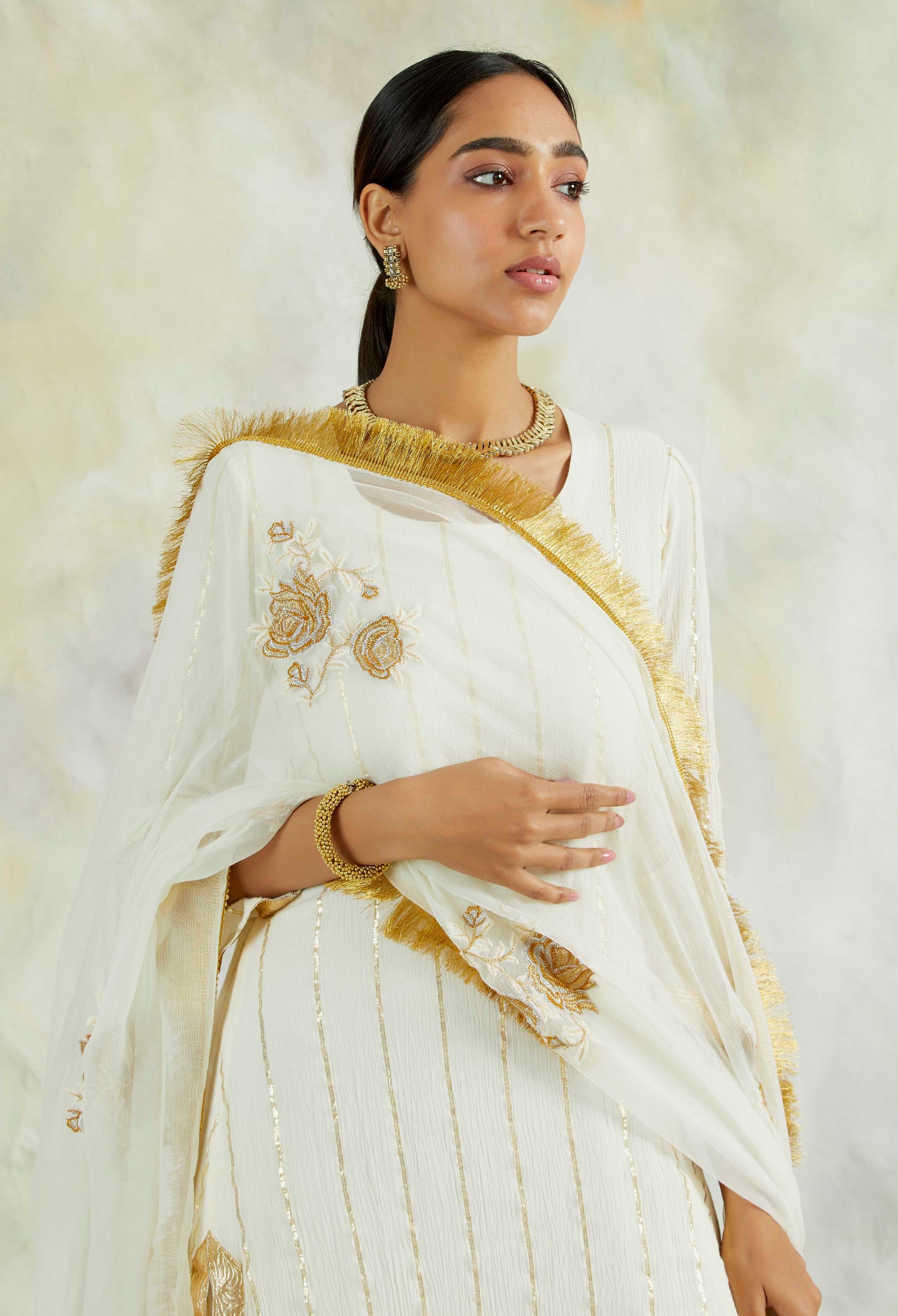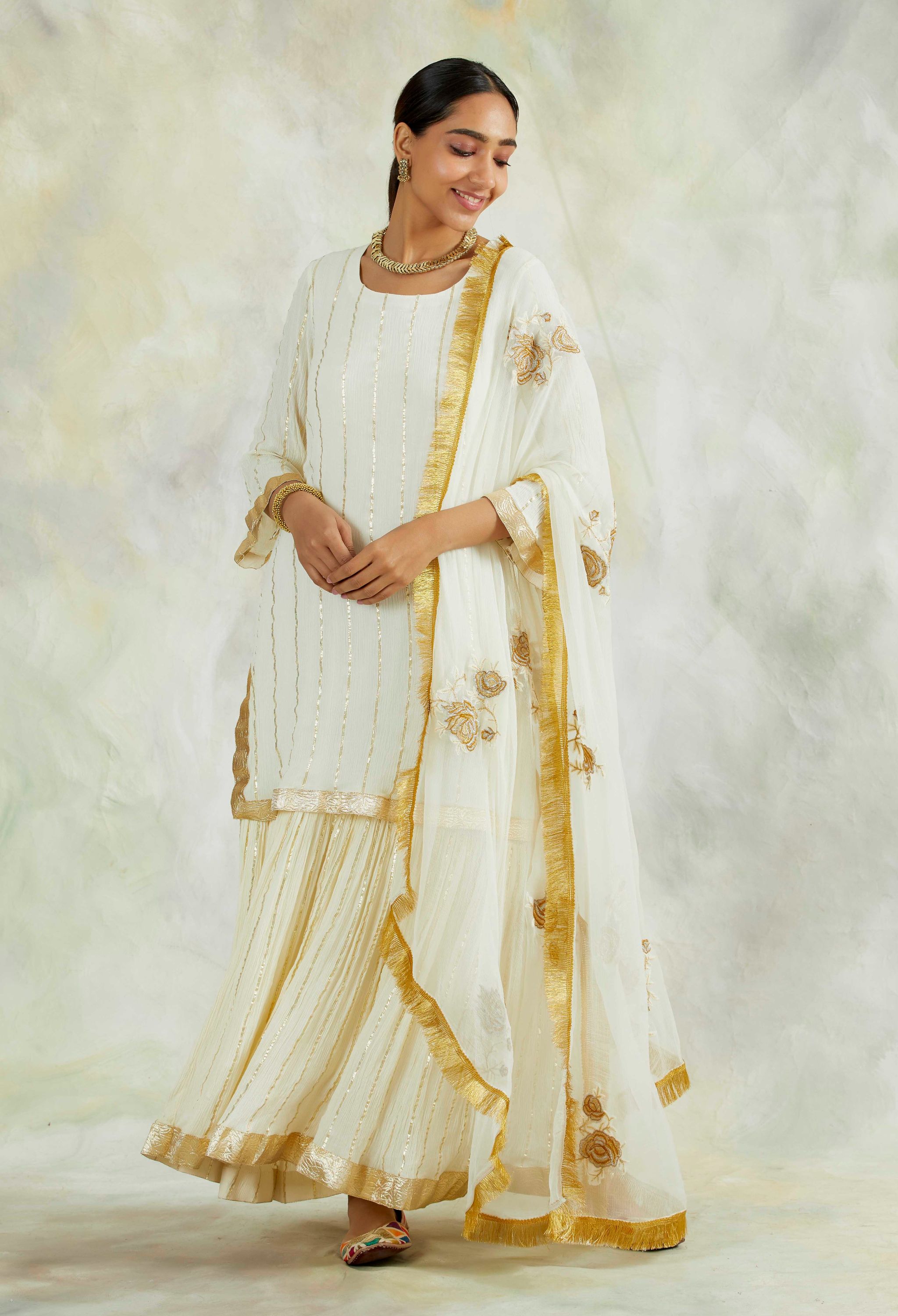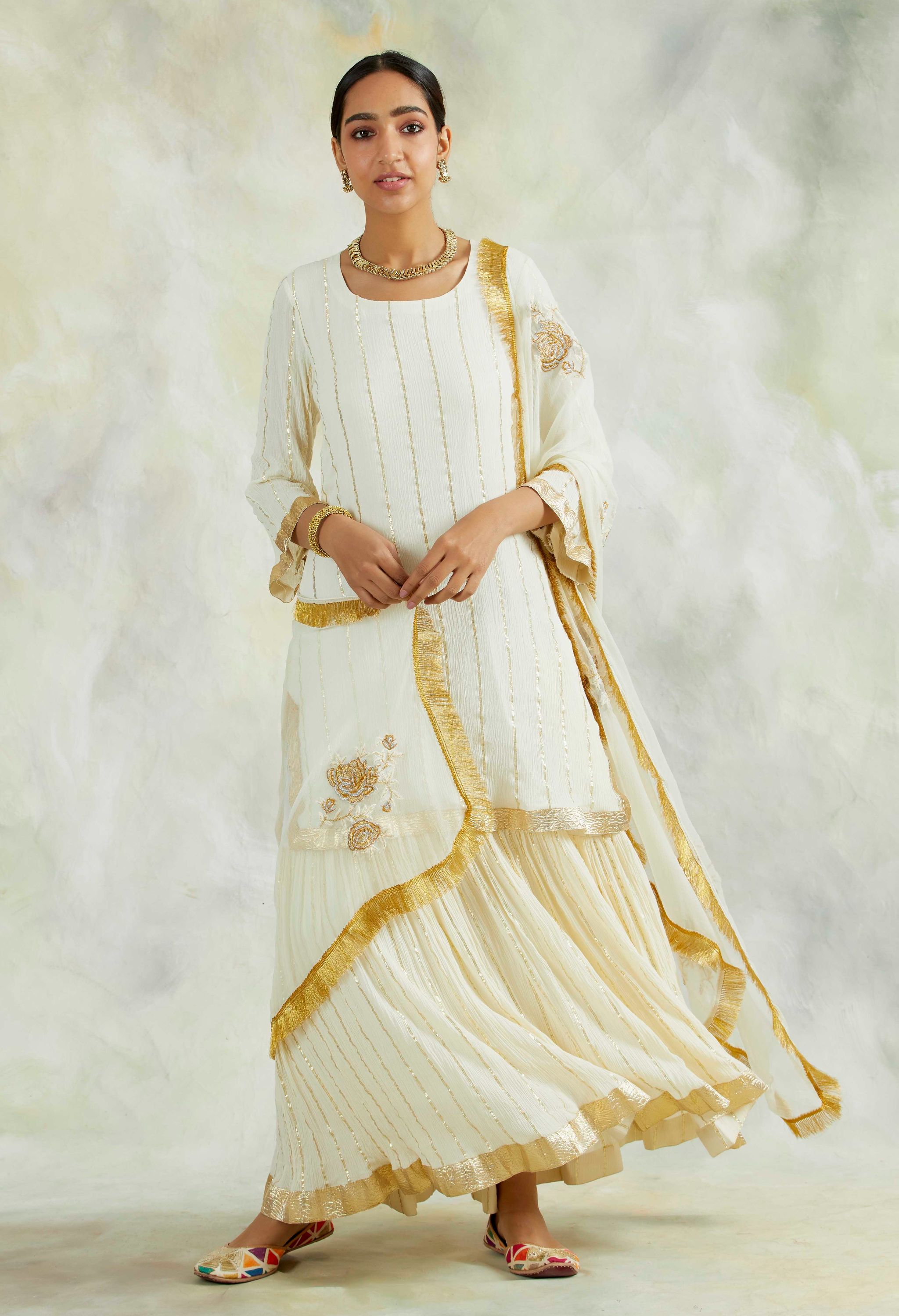 Kurta with attached crushed skirt in soft rayon crepe with gold lurex details , intricate zardozi and gota accents at the neckline, hem and sleeve ends. It has an attached lining in soft cotton voile. Chiffon odhani with intricate thread embroidery and antique gold details at the edge.