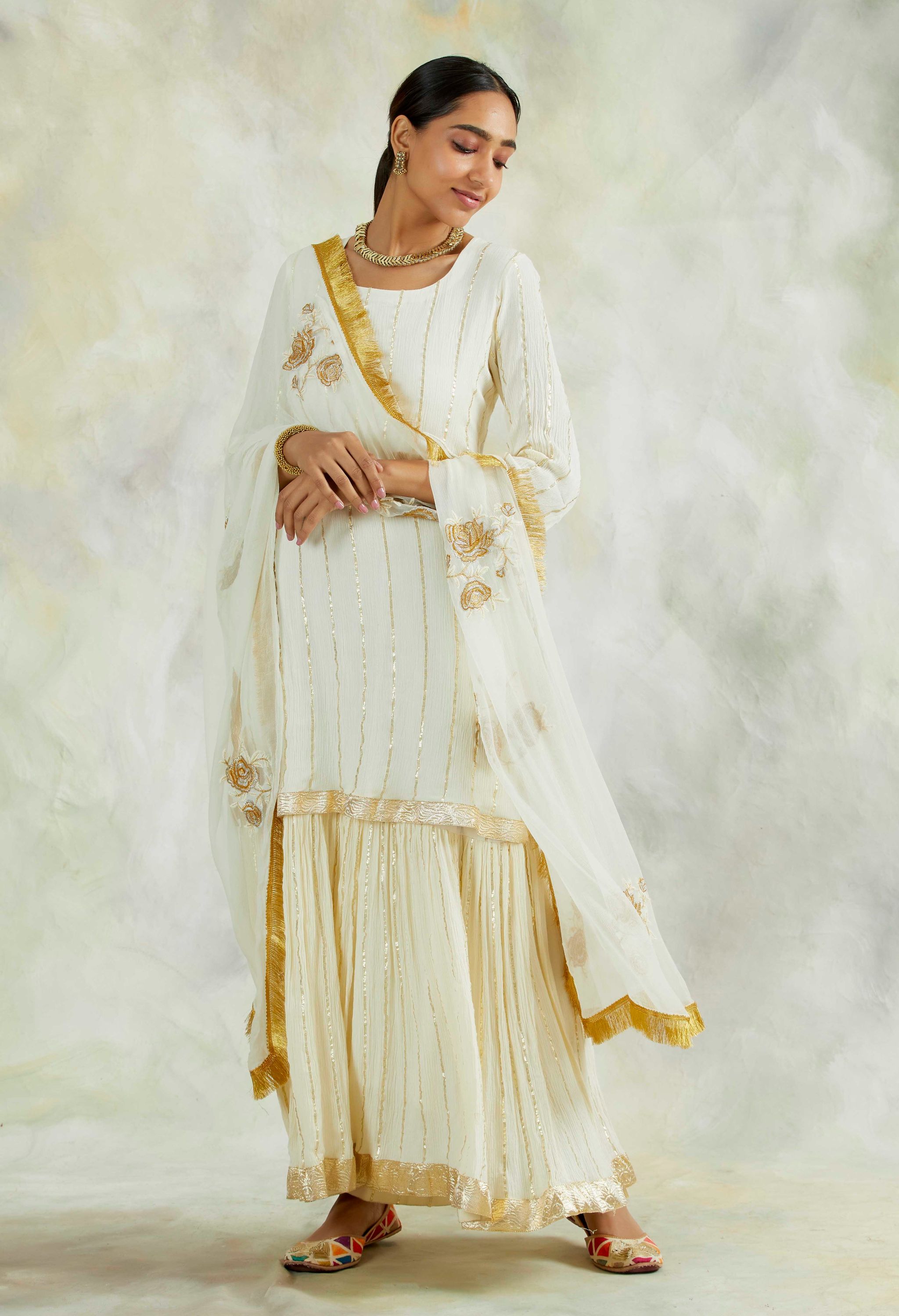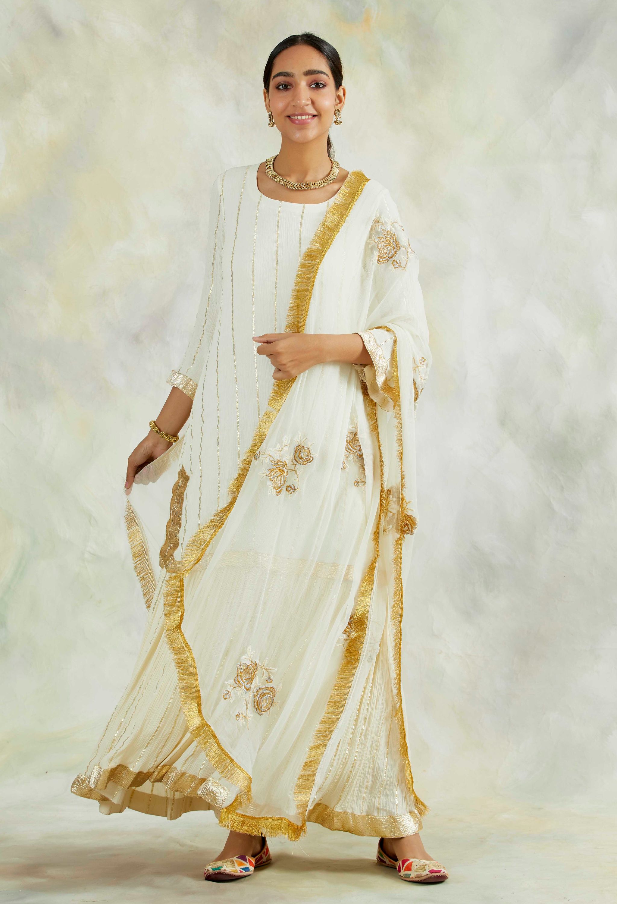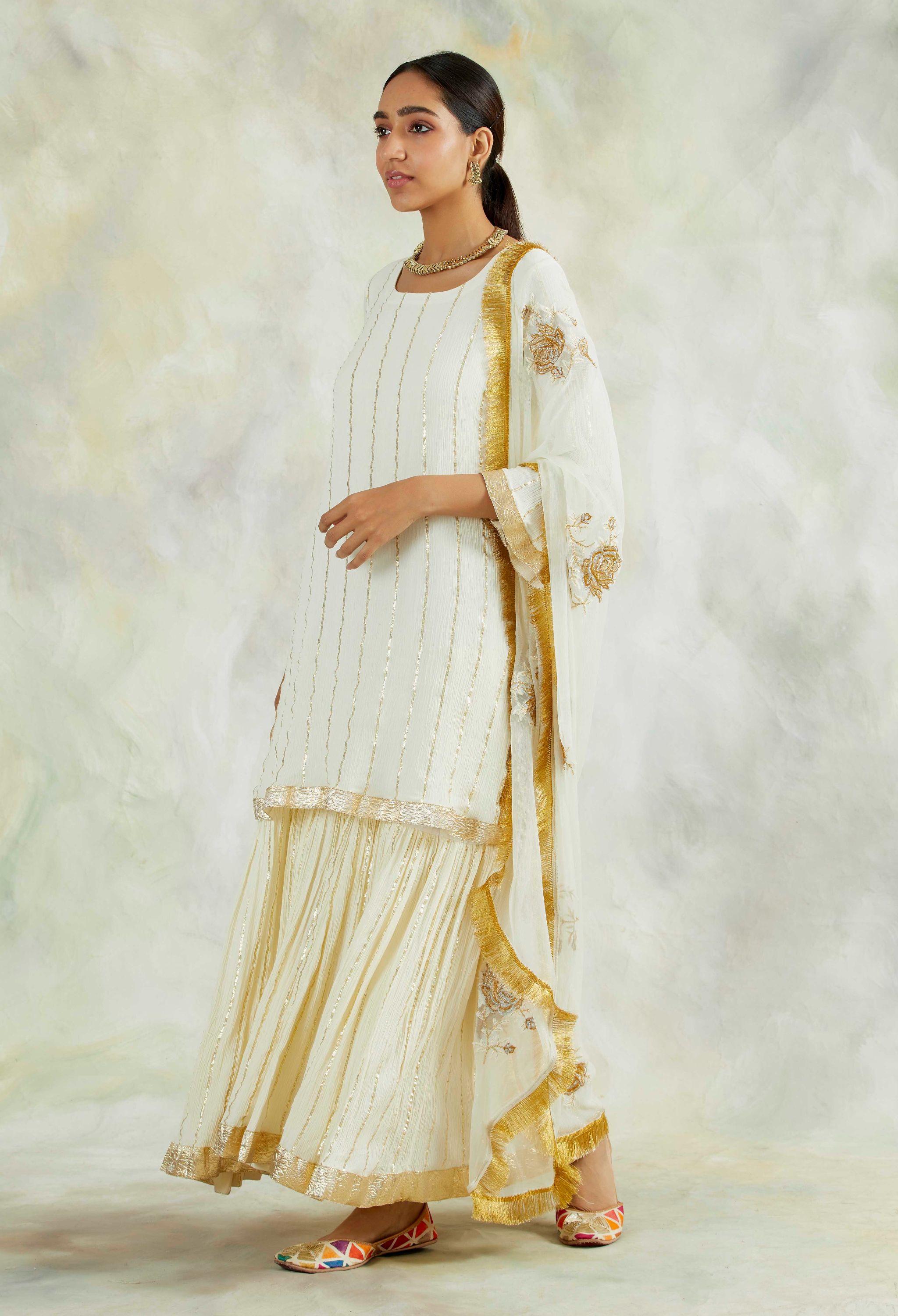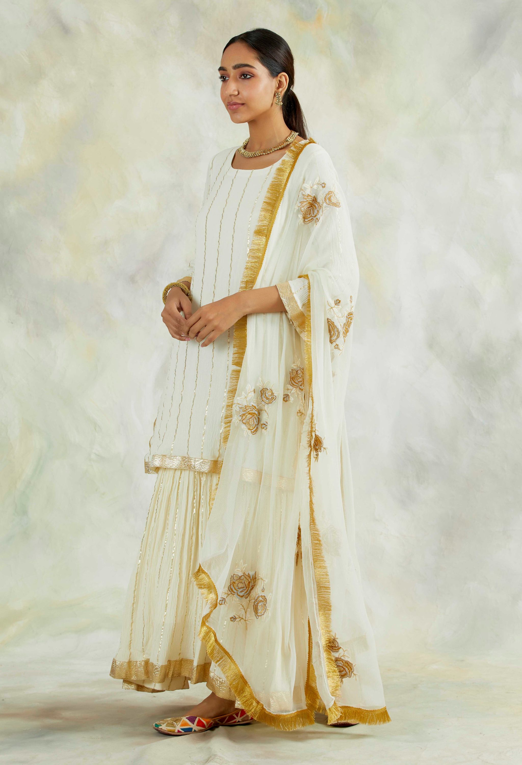 Kurta with attached crushed skirt in soft rayon crepe with gold lurex details , intricate zardozi and gota accents at the neckline, hem and sleeve ends. It has an attached lining in soft cotton voile. Chiffon odhani with intricate thread embroidery and antique gold details at the edge.