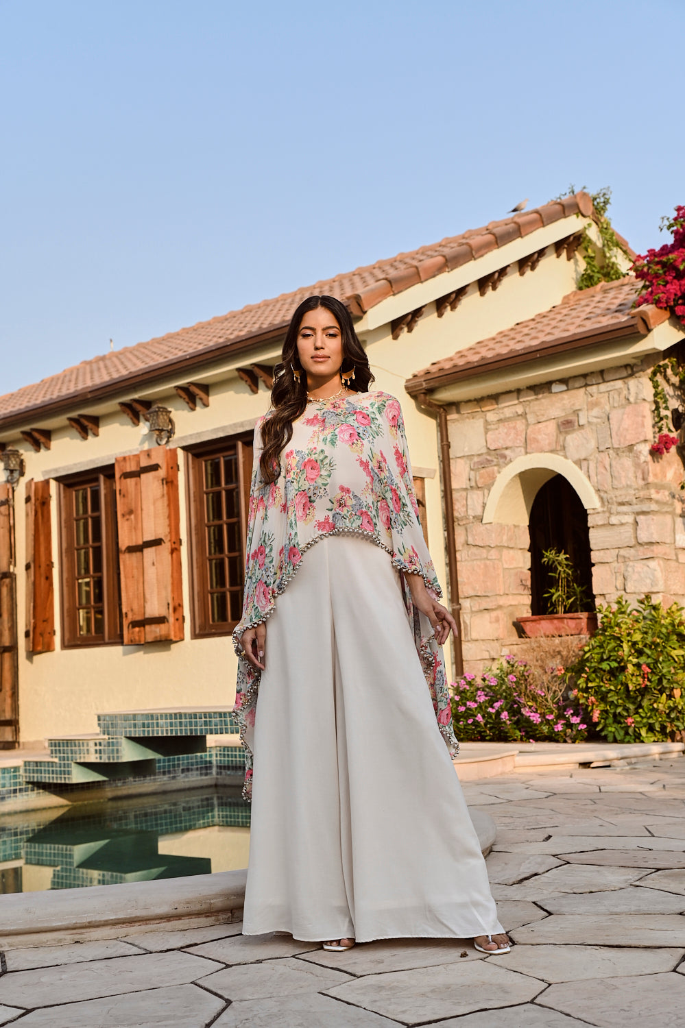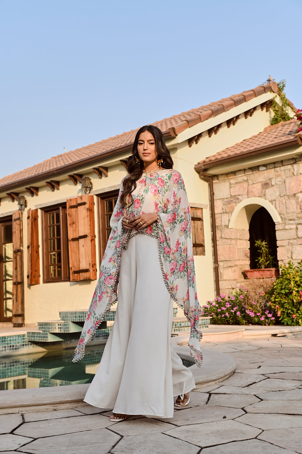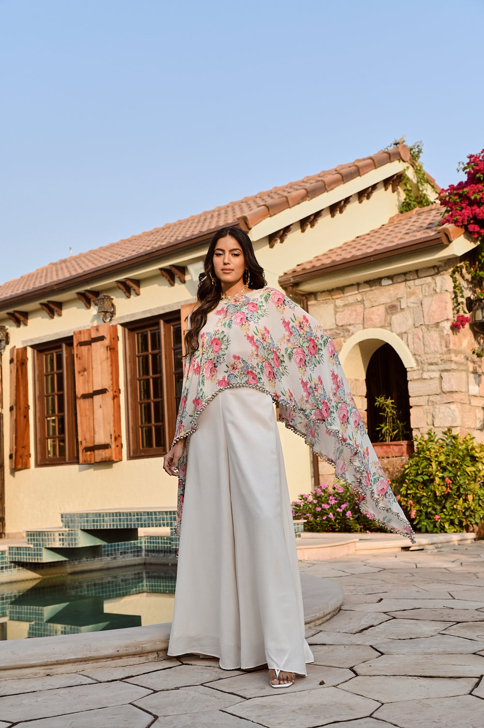 Pure crepe  printed cape with intricate silver detailing. the set includes a plain modal crop top with comfortable flair pants.  A silhouette so stunning, comfortable & stylish, its bound to make heads turn. Must have this festive season and also for fun evenings.