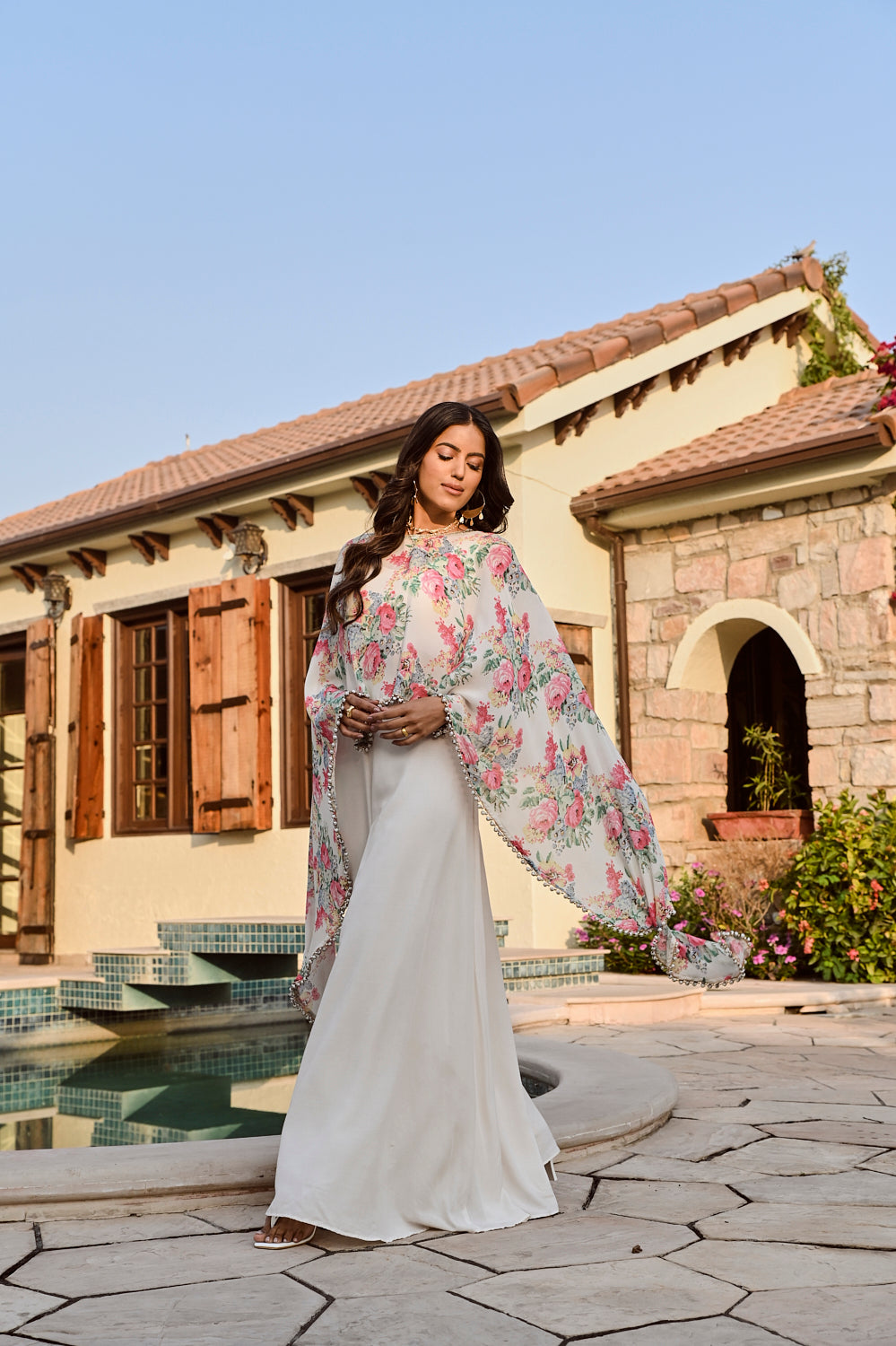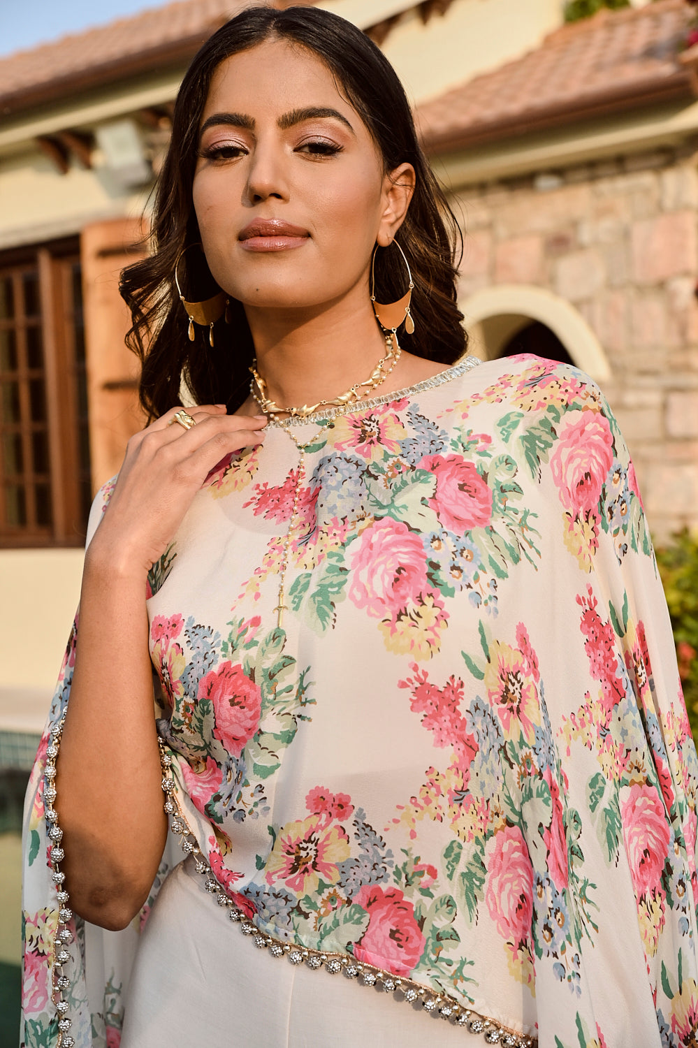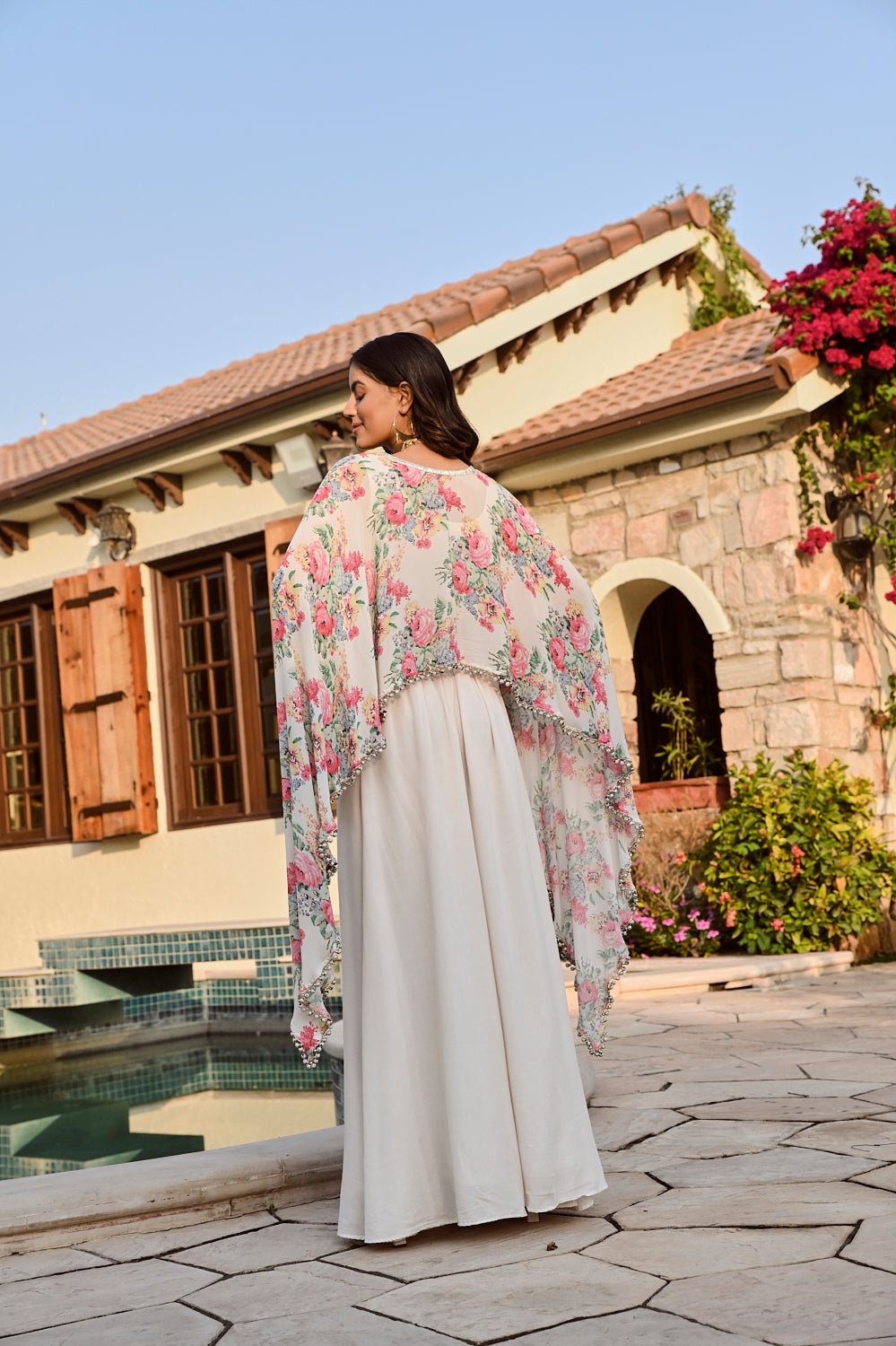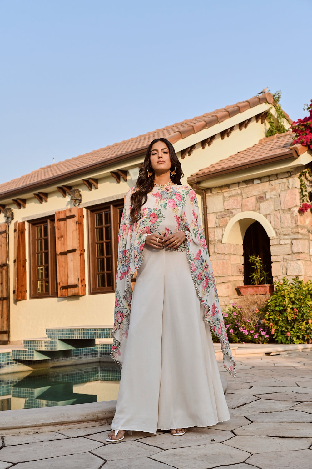 Pure crepe  printed cape with intricate silver detailing. the set includes a plain modal crop top with comfortable flair pants.  A silhouette so stunning, comfortable & stylish, its bound to make heads turn. Must have this festive season and also for fun evenings.