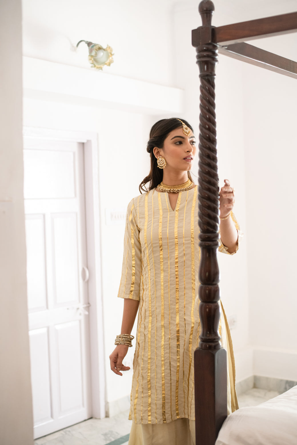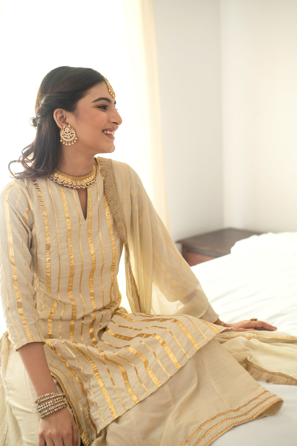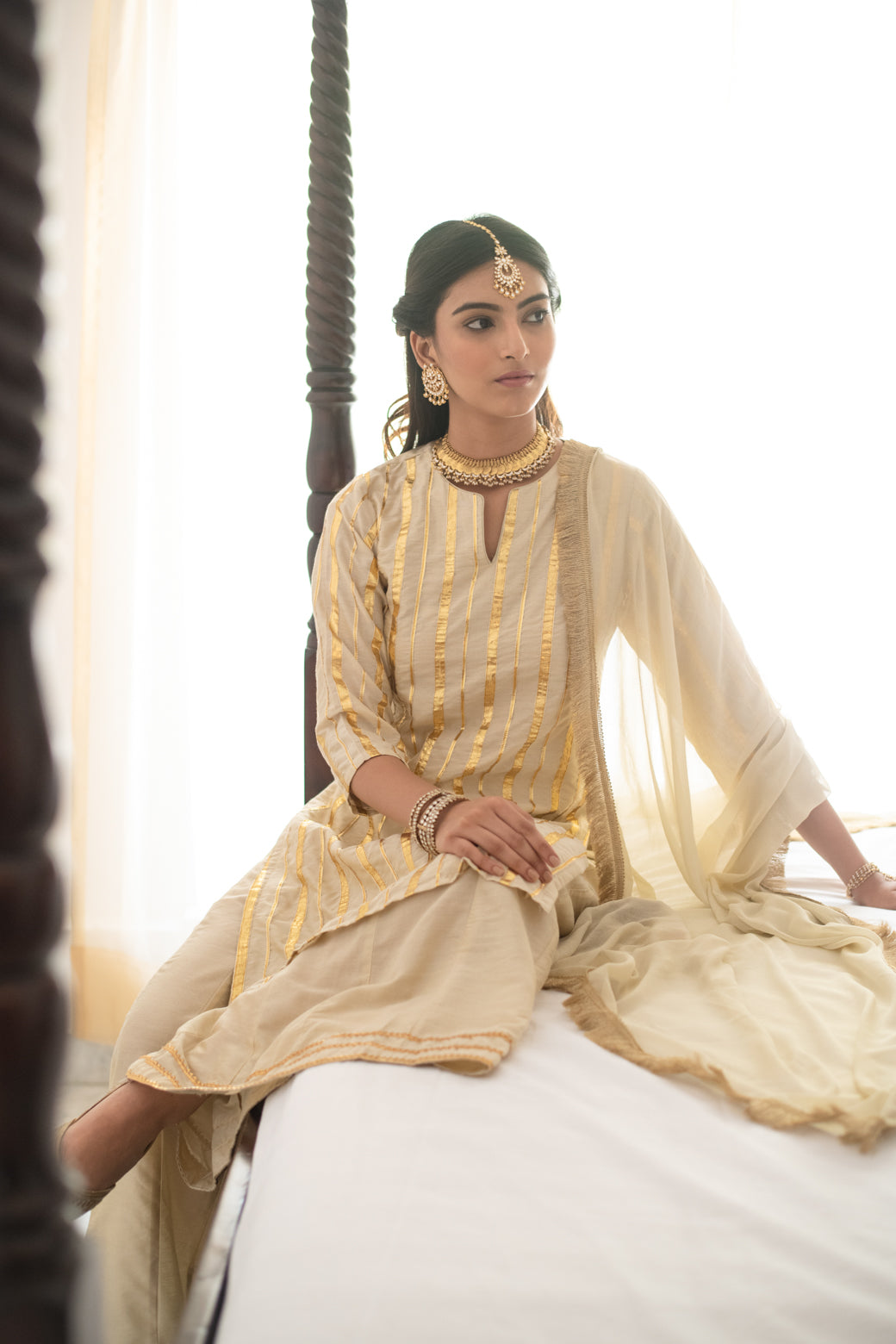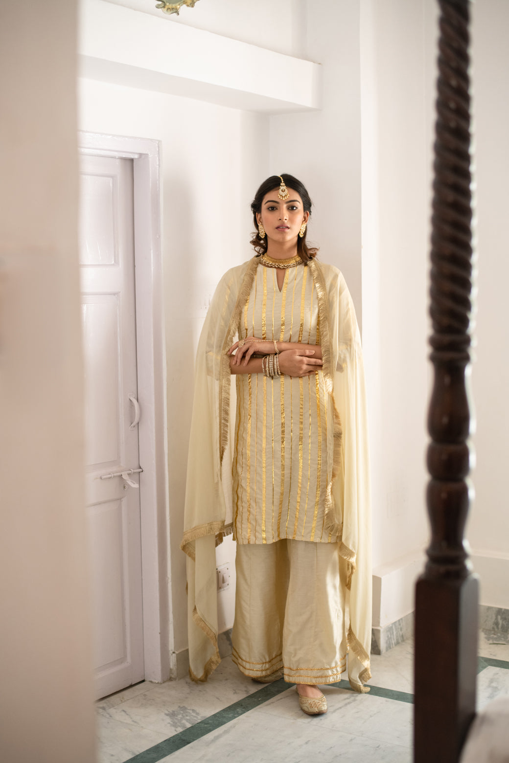 Kurta in soft cotton silk with antique gota details in front and sleeves. Has an attached soft cotton voile lining. Soft cotton satin trousers with antique gold details at the hem with elastic. Chiffon odhani with antique gold accents at the edge.- All Orders are shipped within 3-4 days of placing the order.