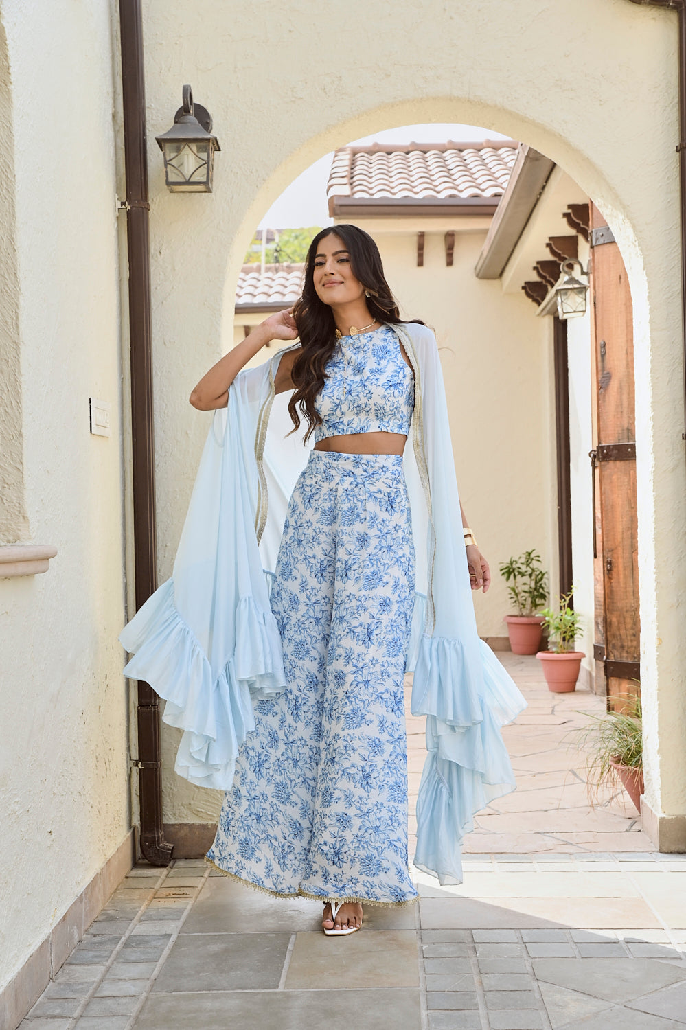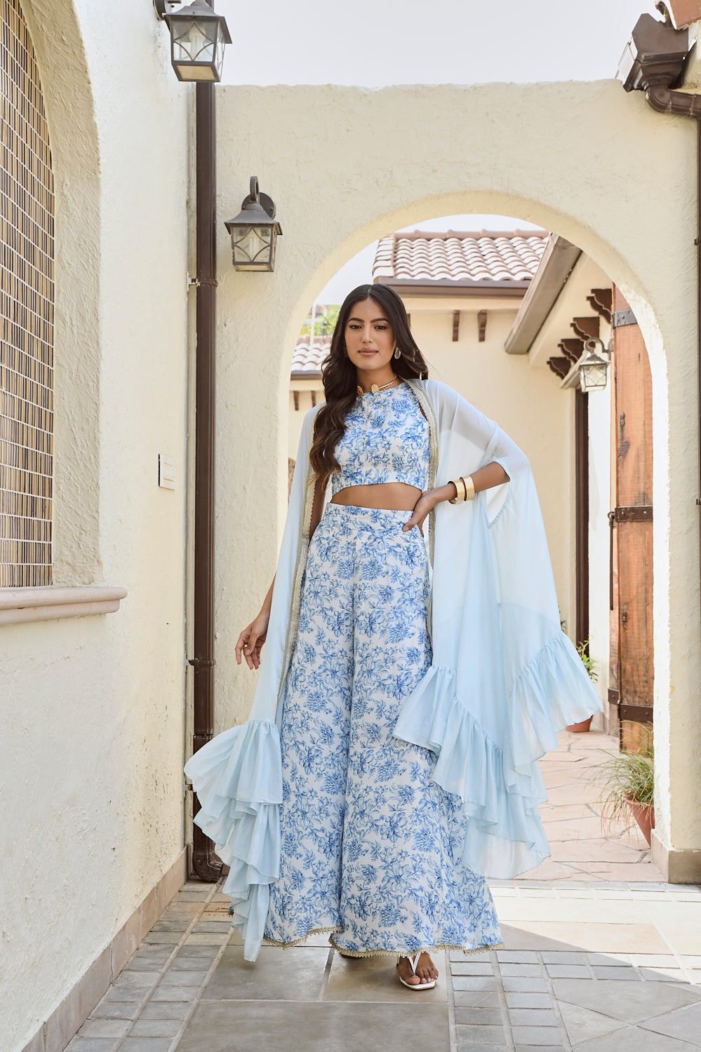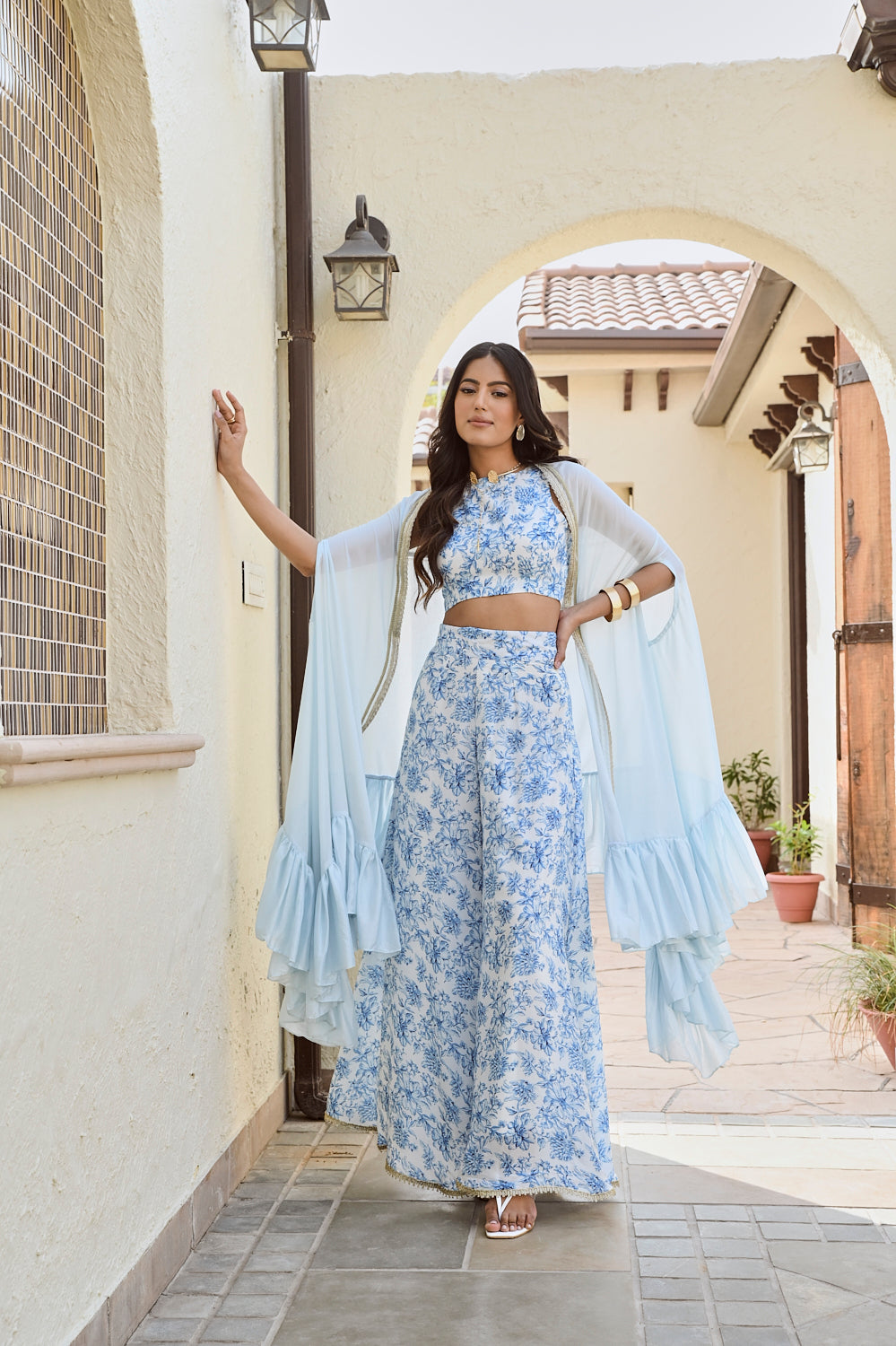 Powder Blue silver detailing at the edges. Blue and ivory printed crop top with flared pallazo trousers. The ruffle detail on the cape add to the romance of this easy breezy outfit. A comfortable and elegant outfit, cut a striking picture in our Zeeba set.