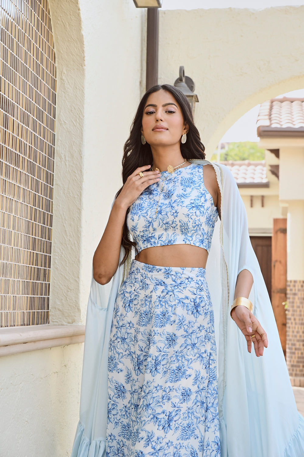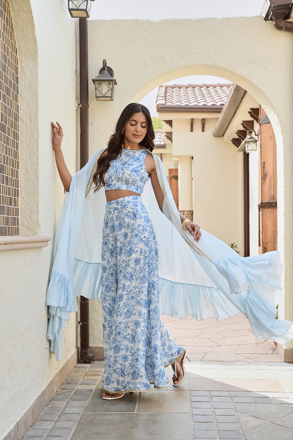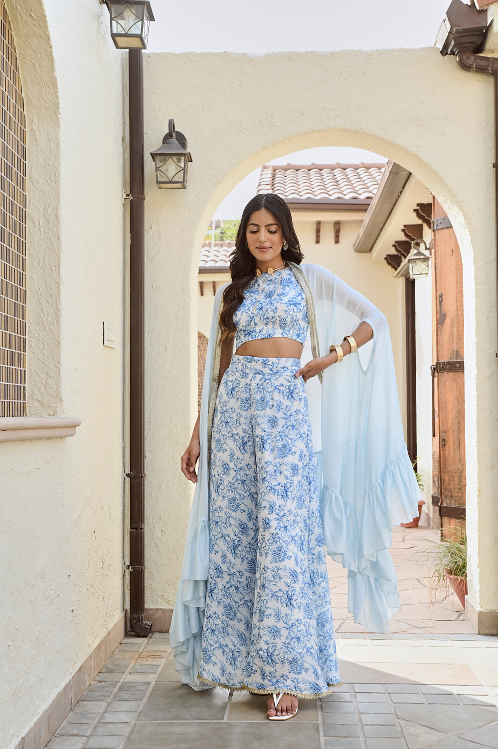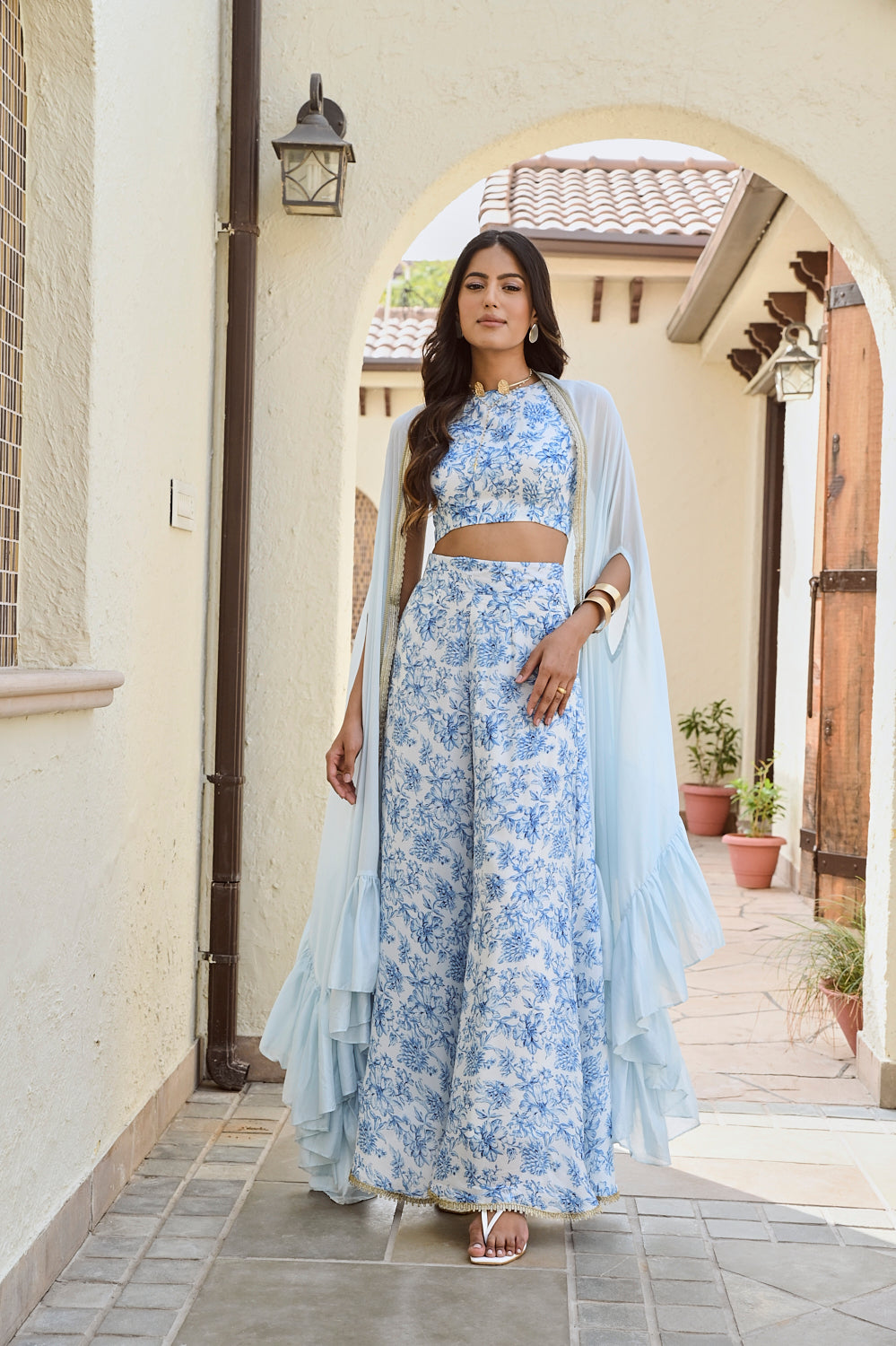 Powder Blue silver detailing at the edges. Blue and ivory printed crop top with flared pallazo trousers. The ruffle detail on the cape add to the romance of this easy breezy outfit. A comfortable and elegant outfit, cut a striking picture in our Zeeba set.