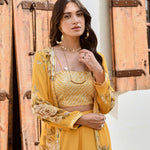 Mustard crepe jacket with a matching crop top. Intricate hand gota detailing at the the neck and sleeve. This set is paired with soft cotton modal flair pants accentuating the waist.