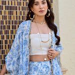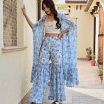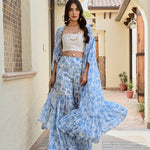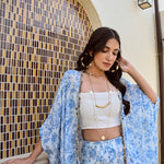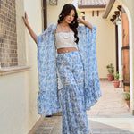 Make heads turn in this statement making piece. Soft pure crepe kaftan cape in ivory and blue floral print , pure chanderi crop top and printed crepe flair pants with intricate silver coin detailing. This outfit is the epitome of style, glamour & comfort.
