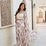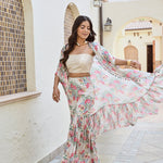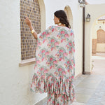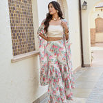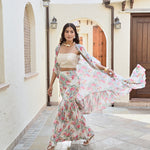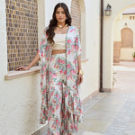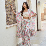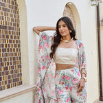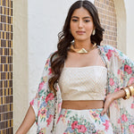 Make heads turn in this statement making piece. Soft pure crepe kaftan cape in multi floral print , pure chanderi crop top and printed crepe flair pants with intricate silver coin detailing. This outfit is the epitome of style, glamour & comfort.