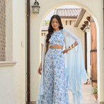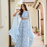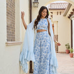 Powder Blue silver detailing at the edges. Blue and ivory printed crop top with flared pallazo trousers. The ruffle detail on the cape add to the romance of this easy breezy outfit. A comfortable and elegant outfit, cut a striking picture in our Zeeba set.