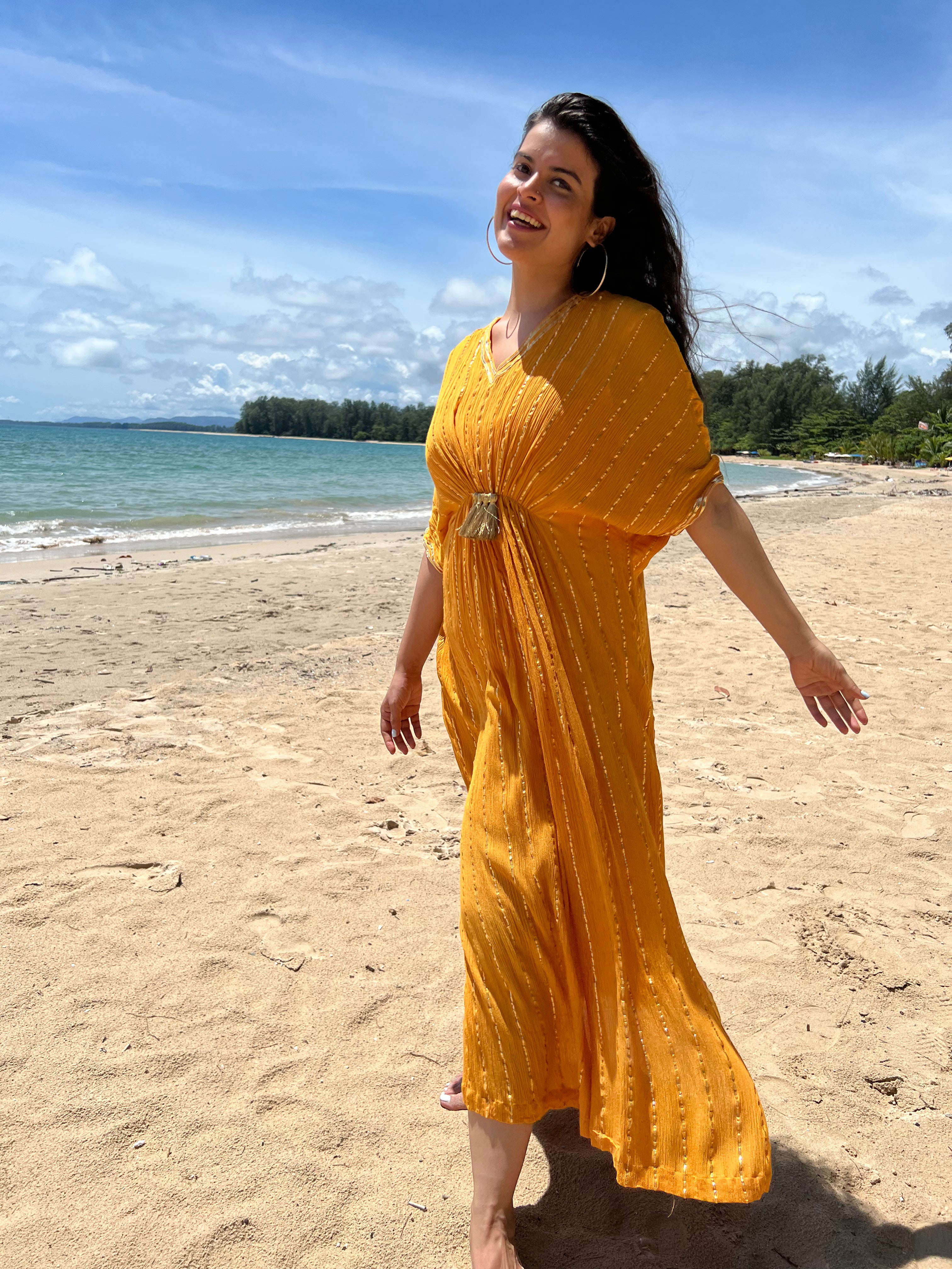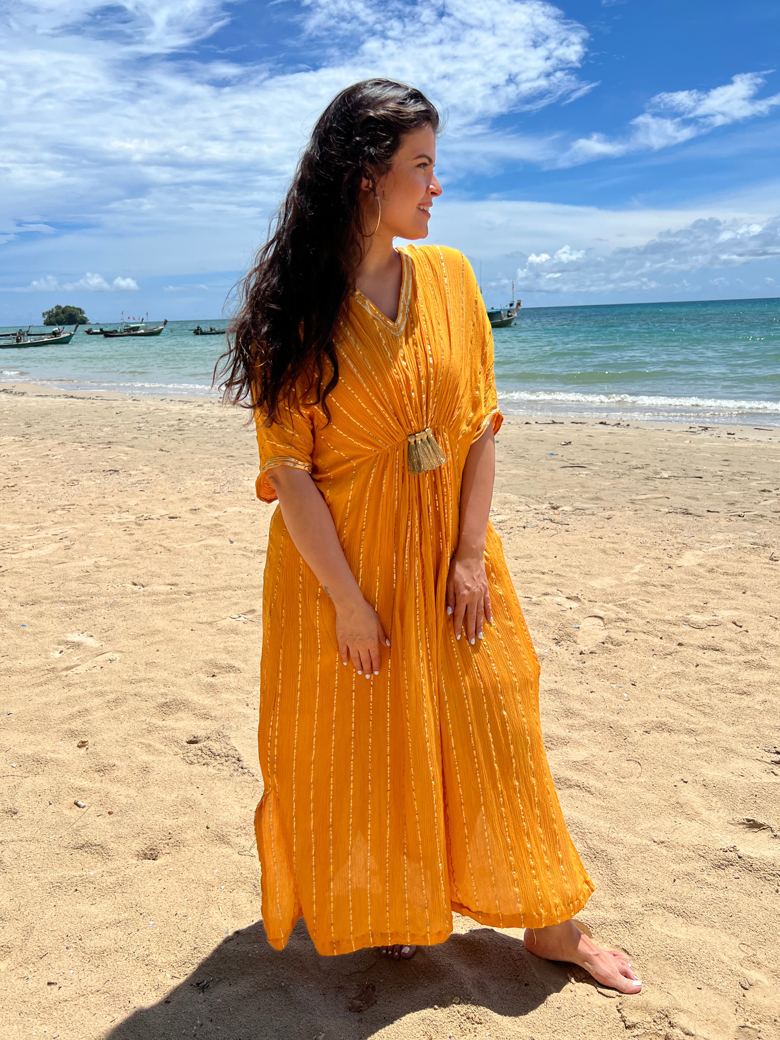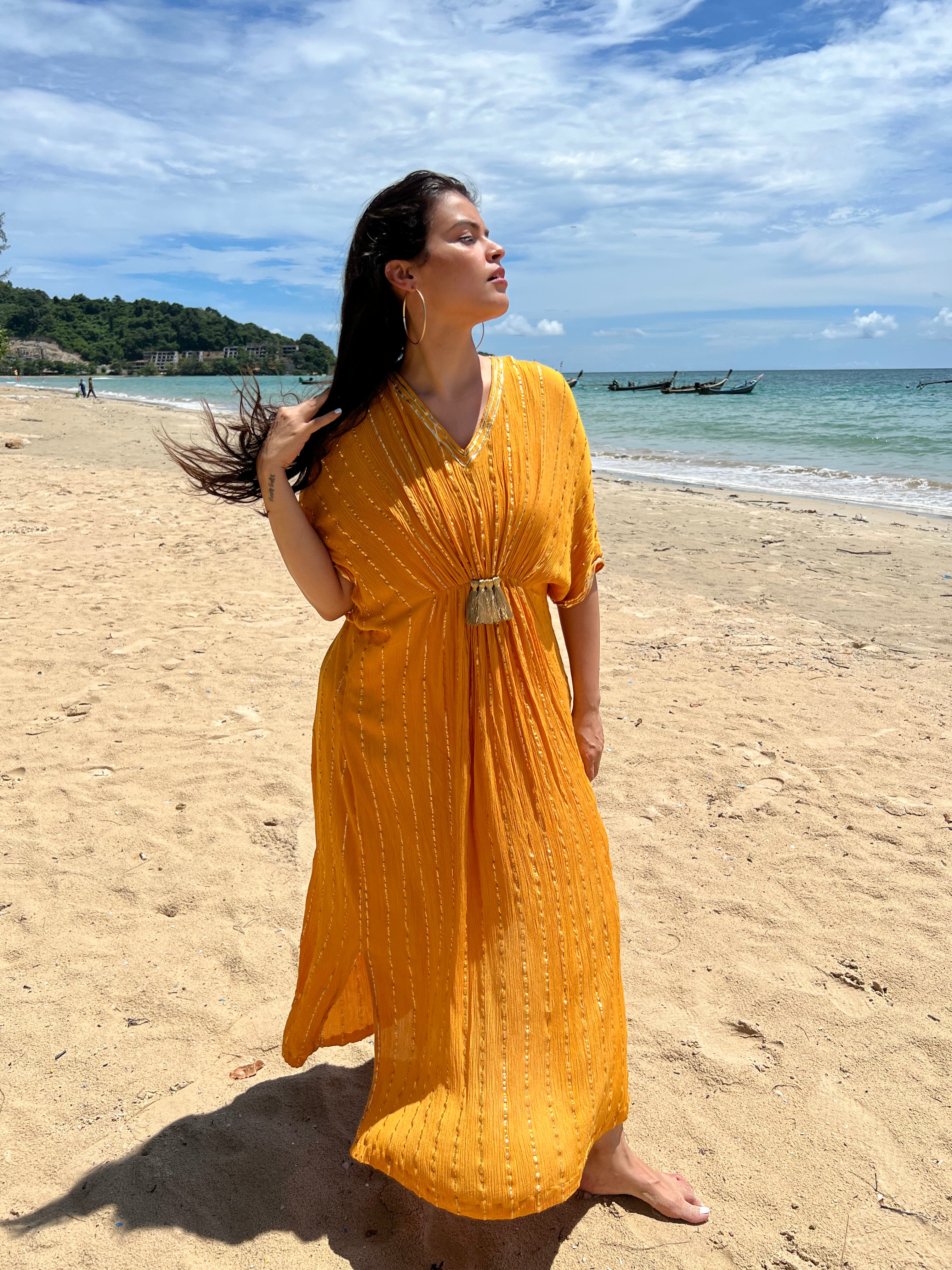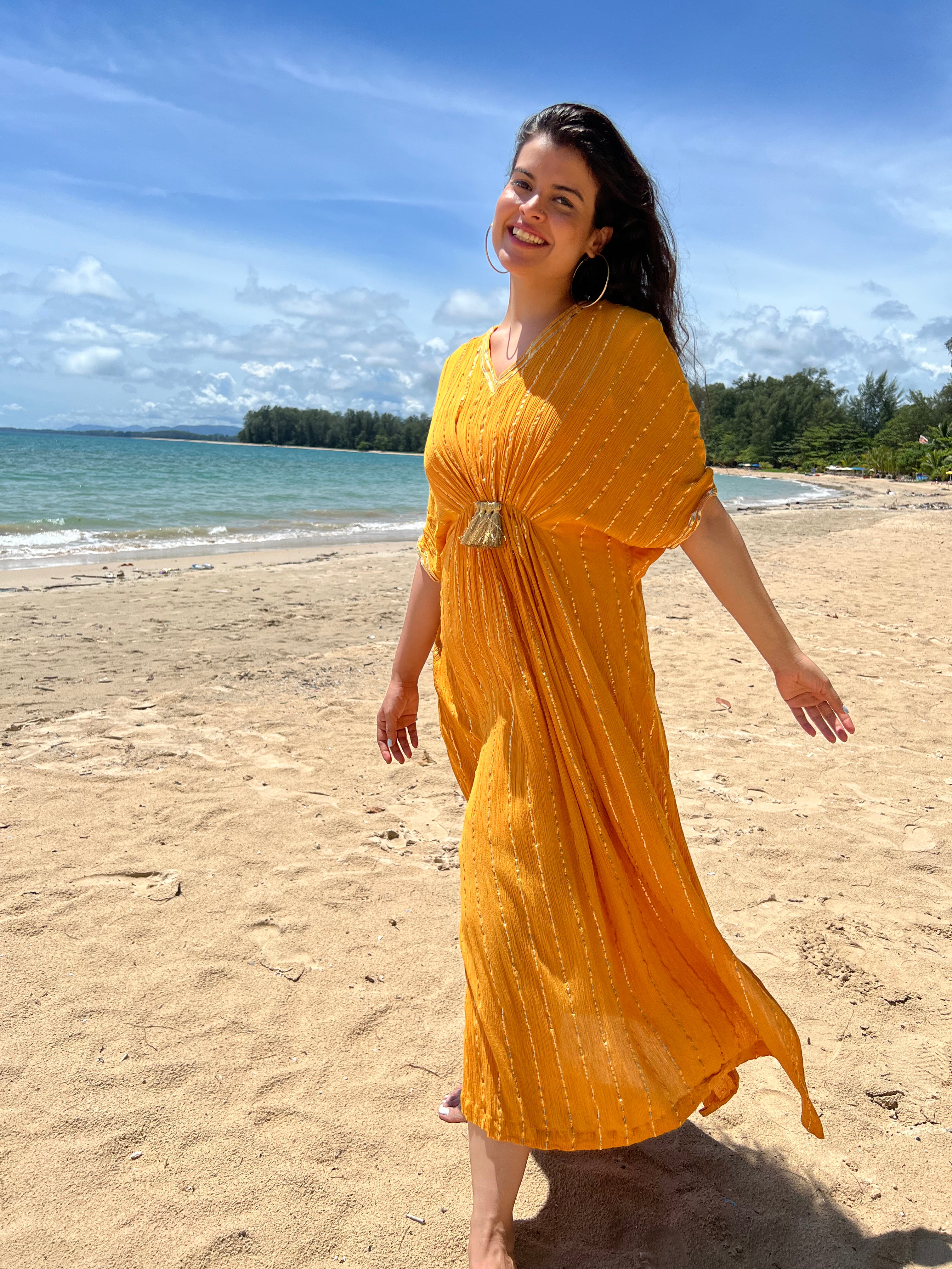 The vibrant mustard Kaftan Dress is a sure shot head turner this festive season. Style it with polki jewelry and mojaris for a Mehndi celebration. Or wear it with statement gold hoops and gladiators for a beach soiree. A must have piece in your wardrobe. It come with a soft cotton slip. Fuss free festive wear at its best.