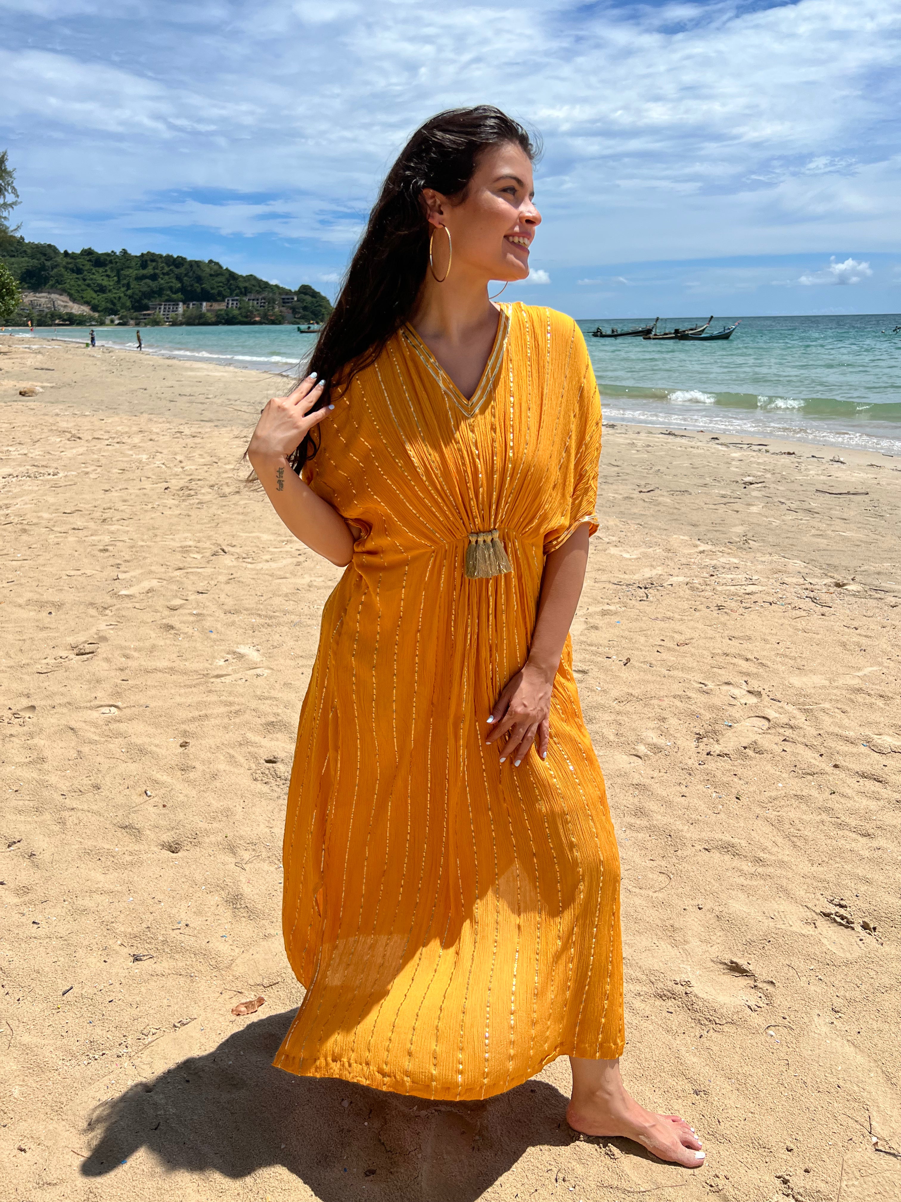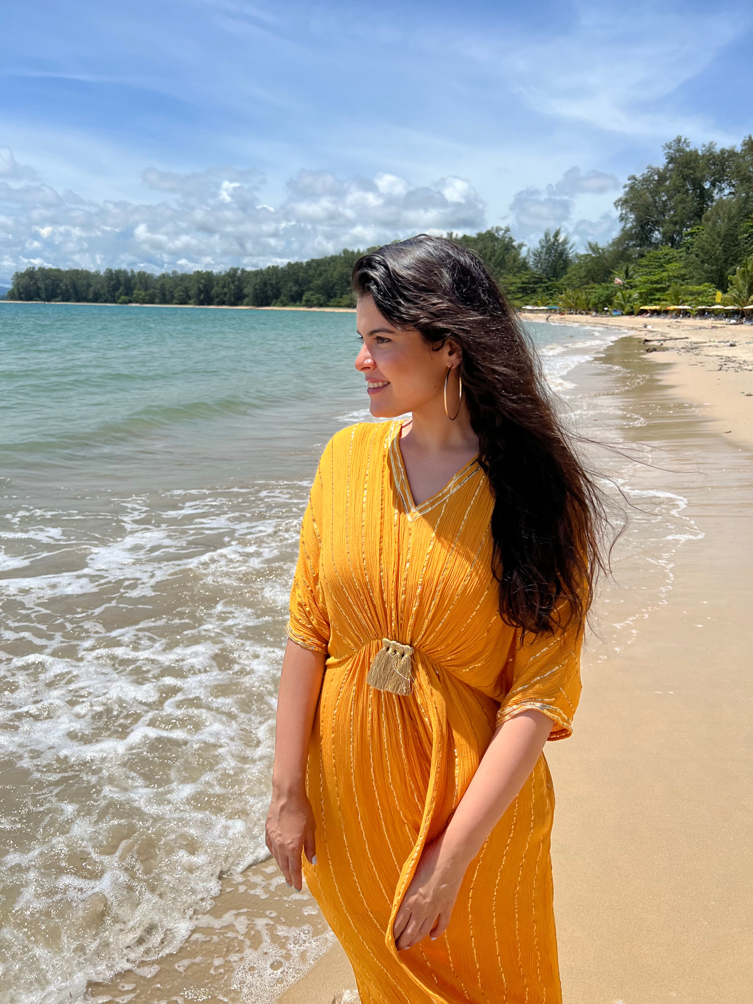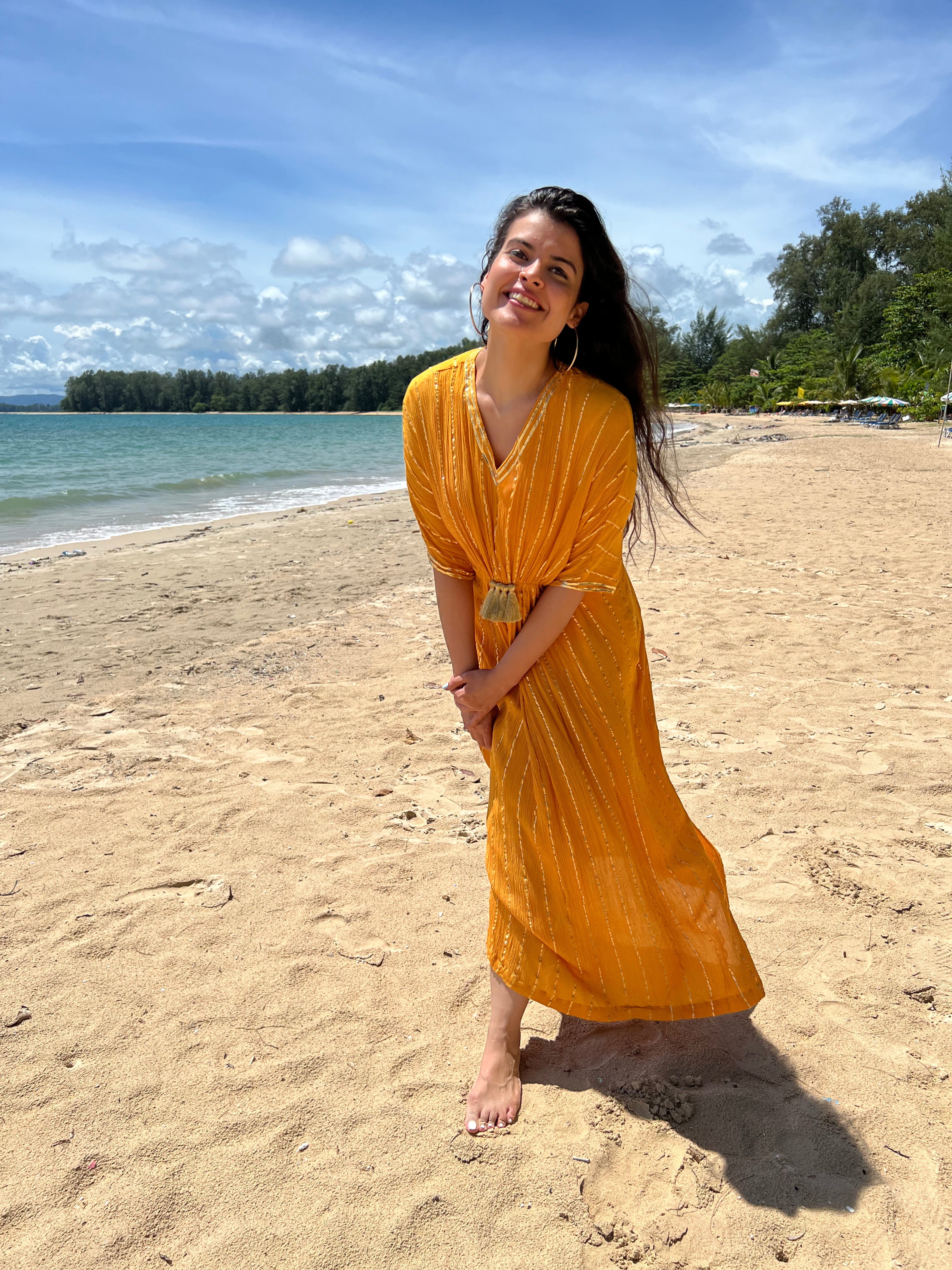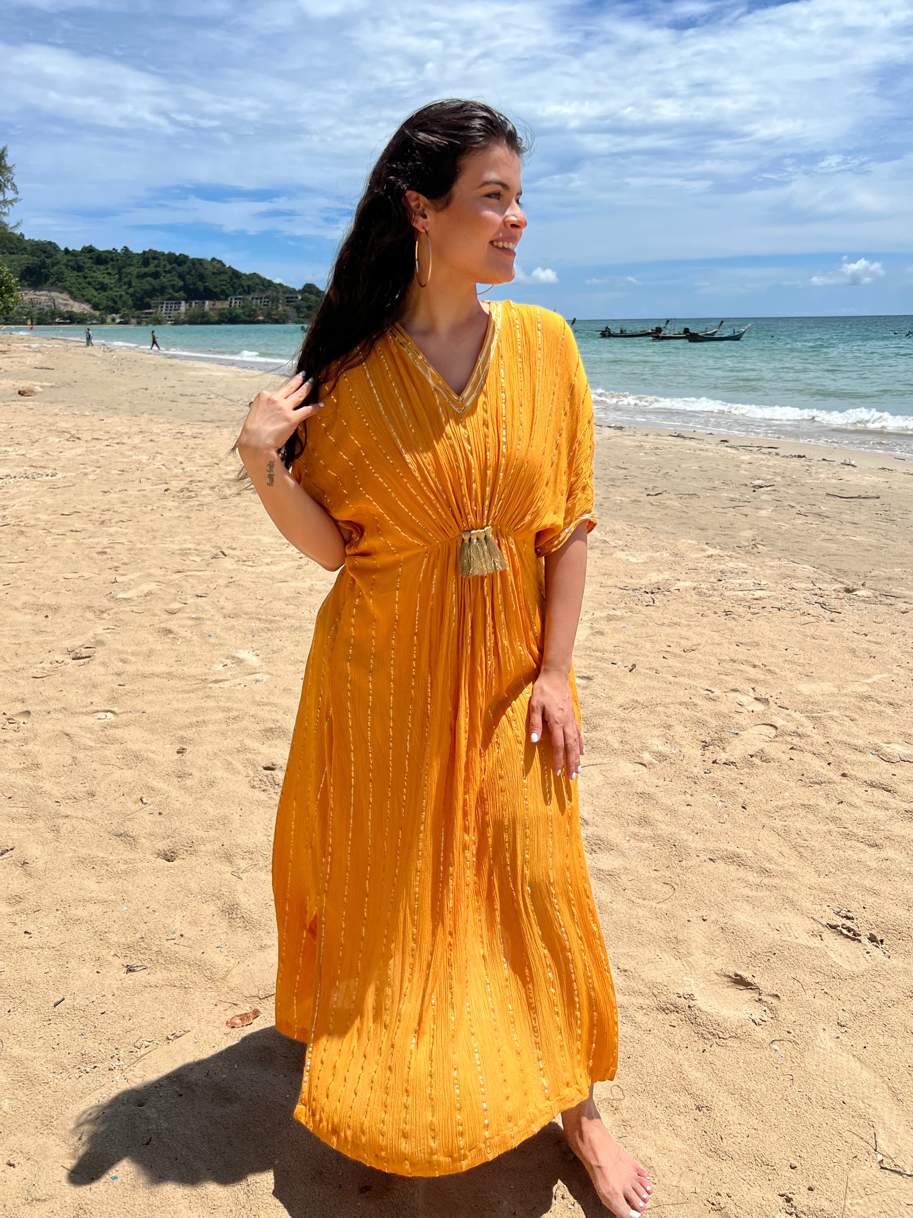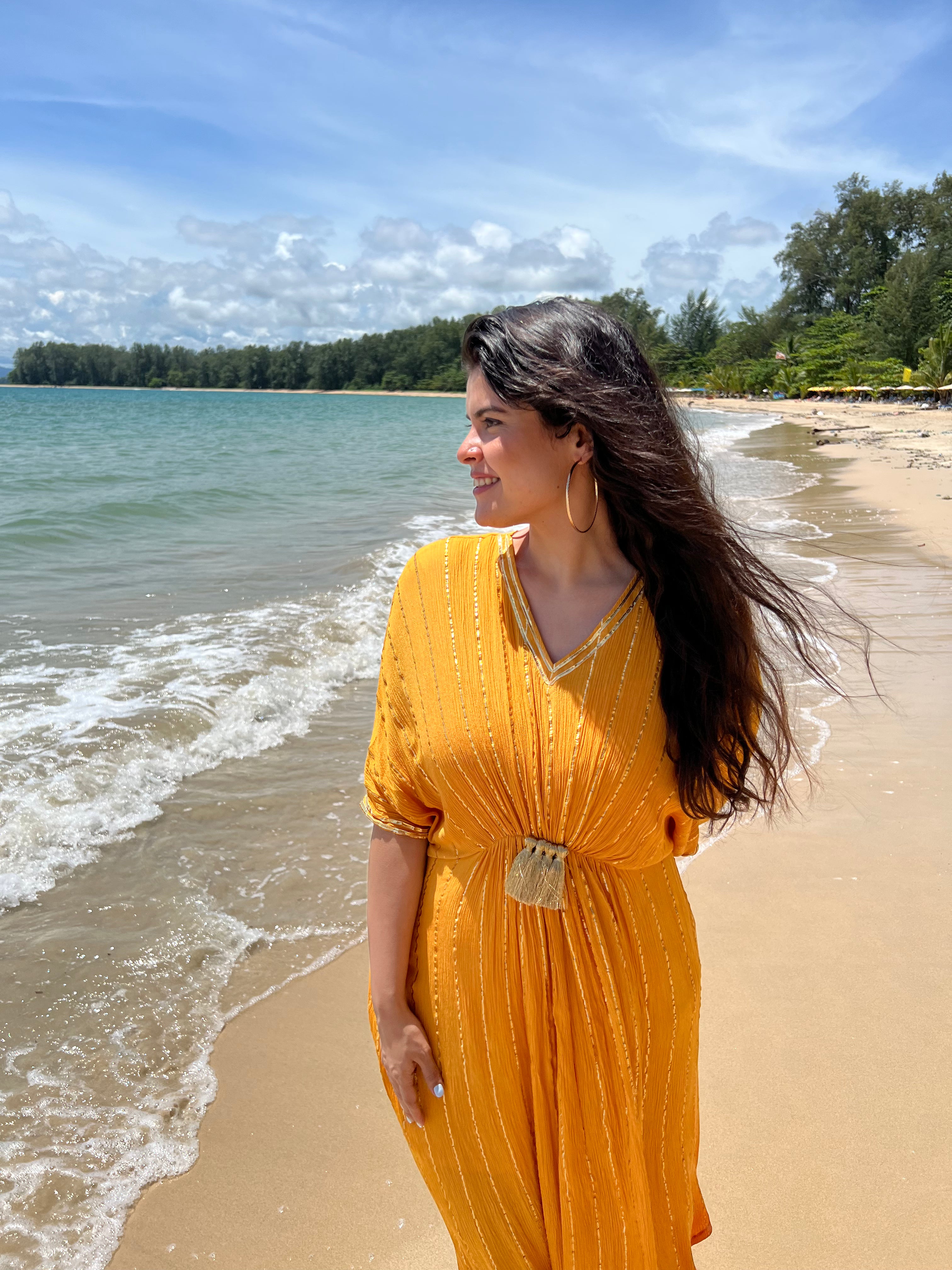 The vibrant mustard Kaftan Dress is a sure shot head turner this festive season. Style it with polki jewelry and mojaris for a Mehndi celebration. Or wear it with statement gold hoops and gladiators for a beach soiree. A must have piece in your wardrobe. It come with a soft cotton slip. Fuss free festive wear at its best.
