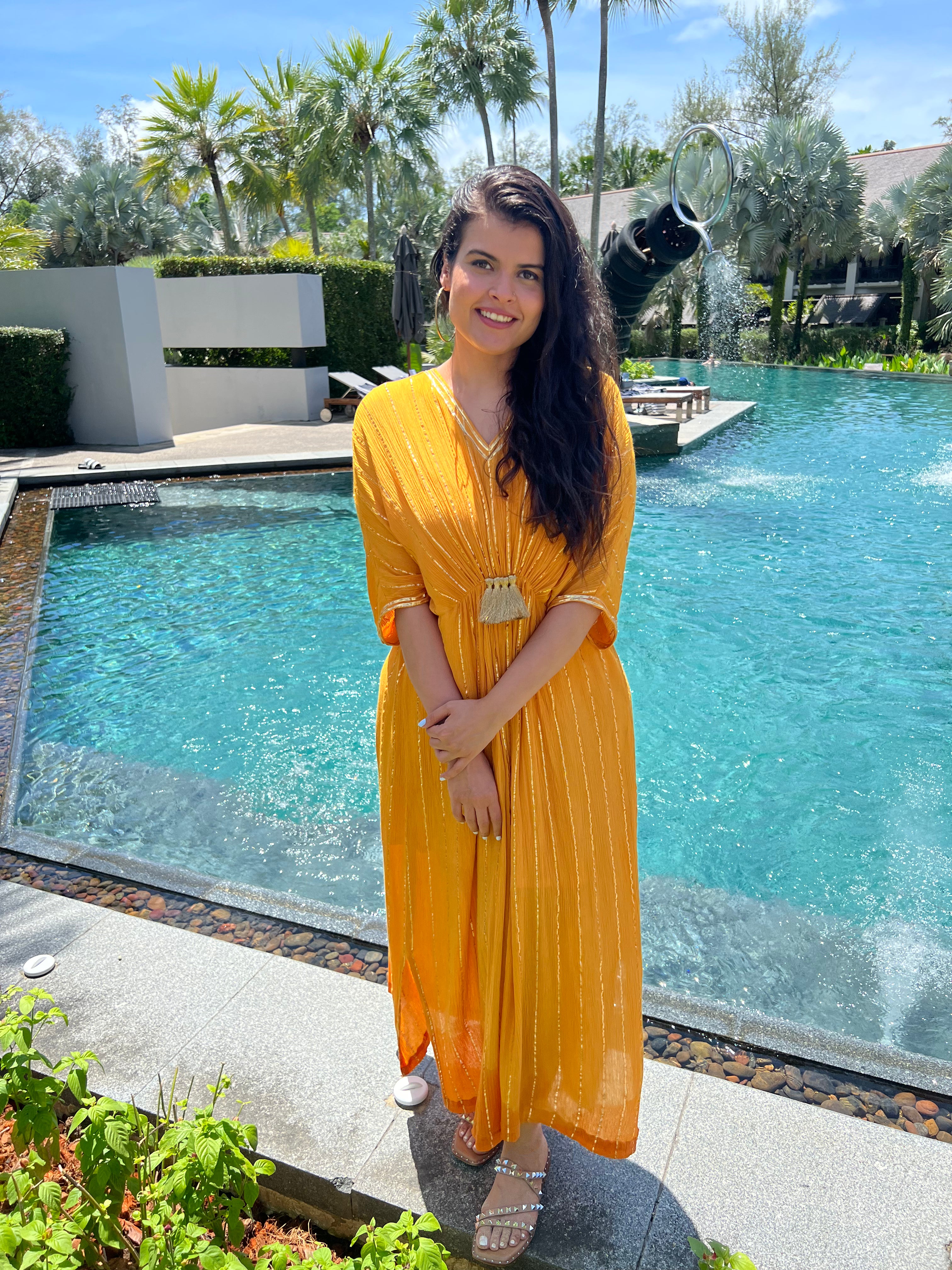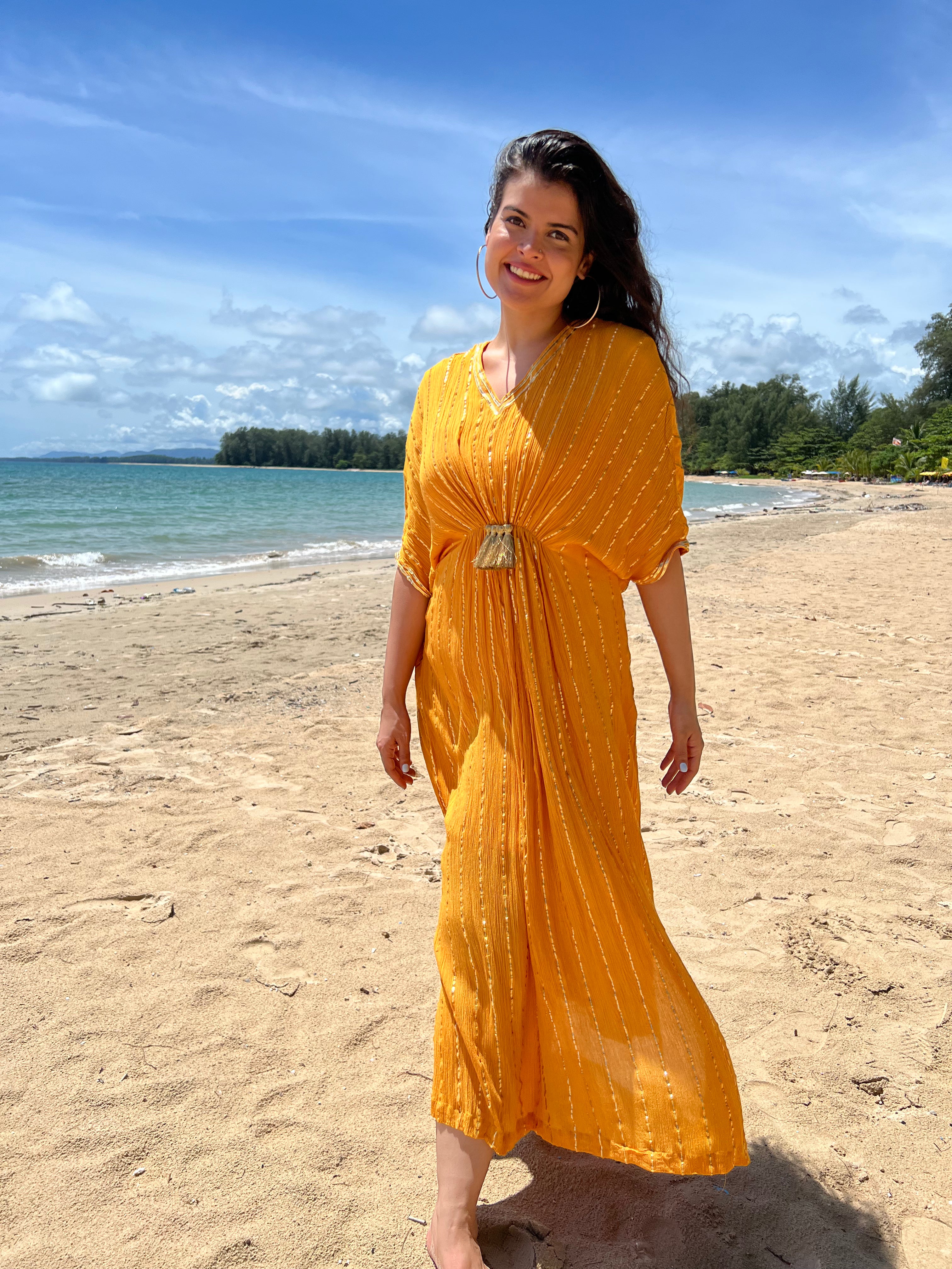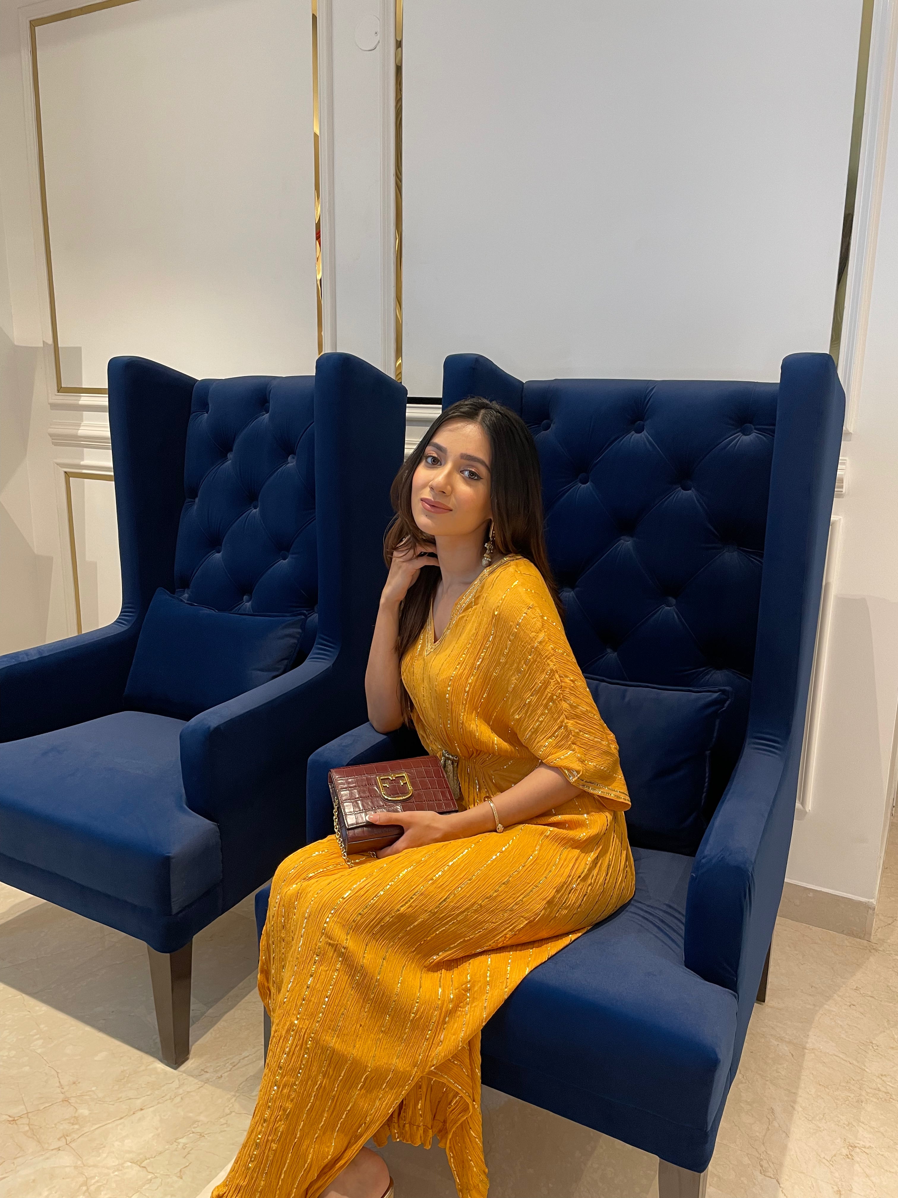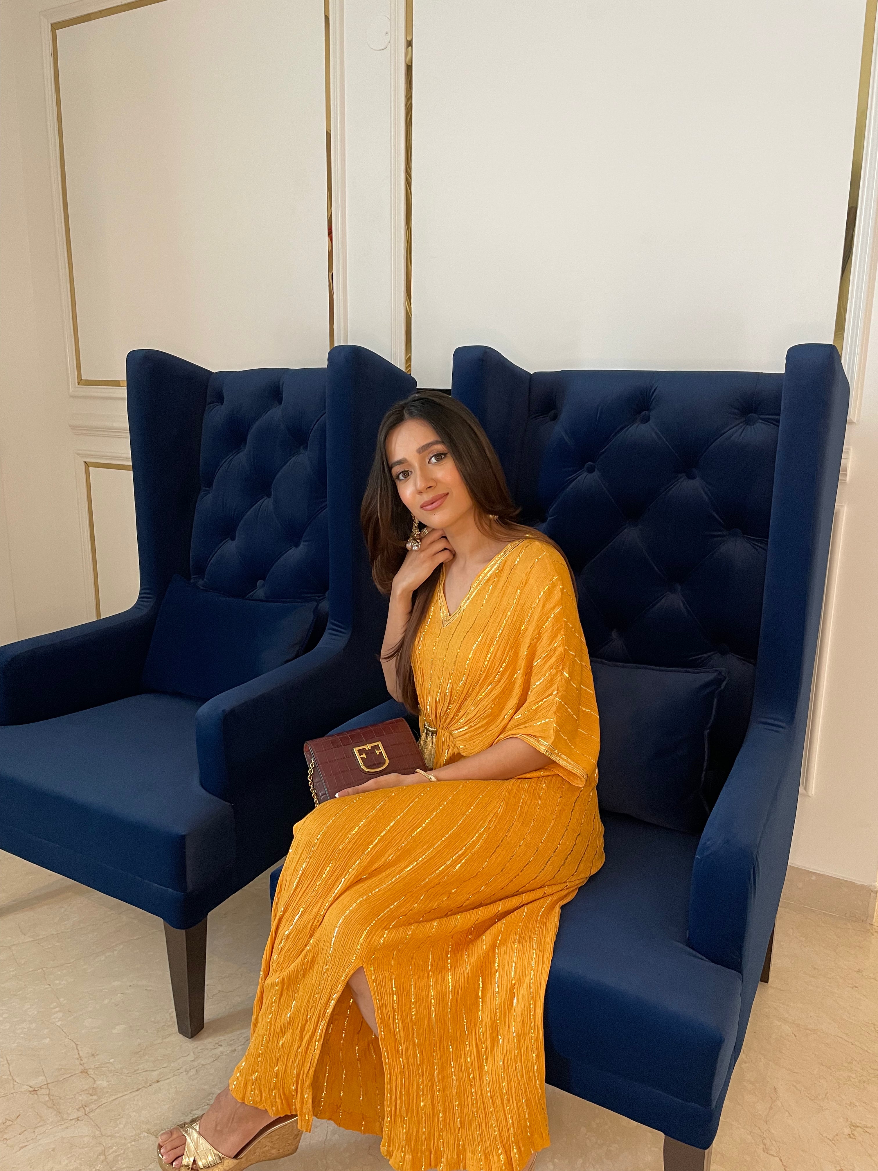 The vibrant mustard Kaftan Dress is a sure shot head turner this festive season. Style it with polki jewelry and mojaris for a Mehndi celebration. Or wear it with statement gold hoops and gladiators for a beach soiree. A must have piece in your wardrobe. It come with a soft cotton slip. Fuss free festive wear at its best.