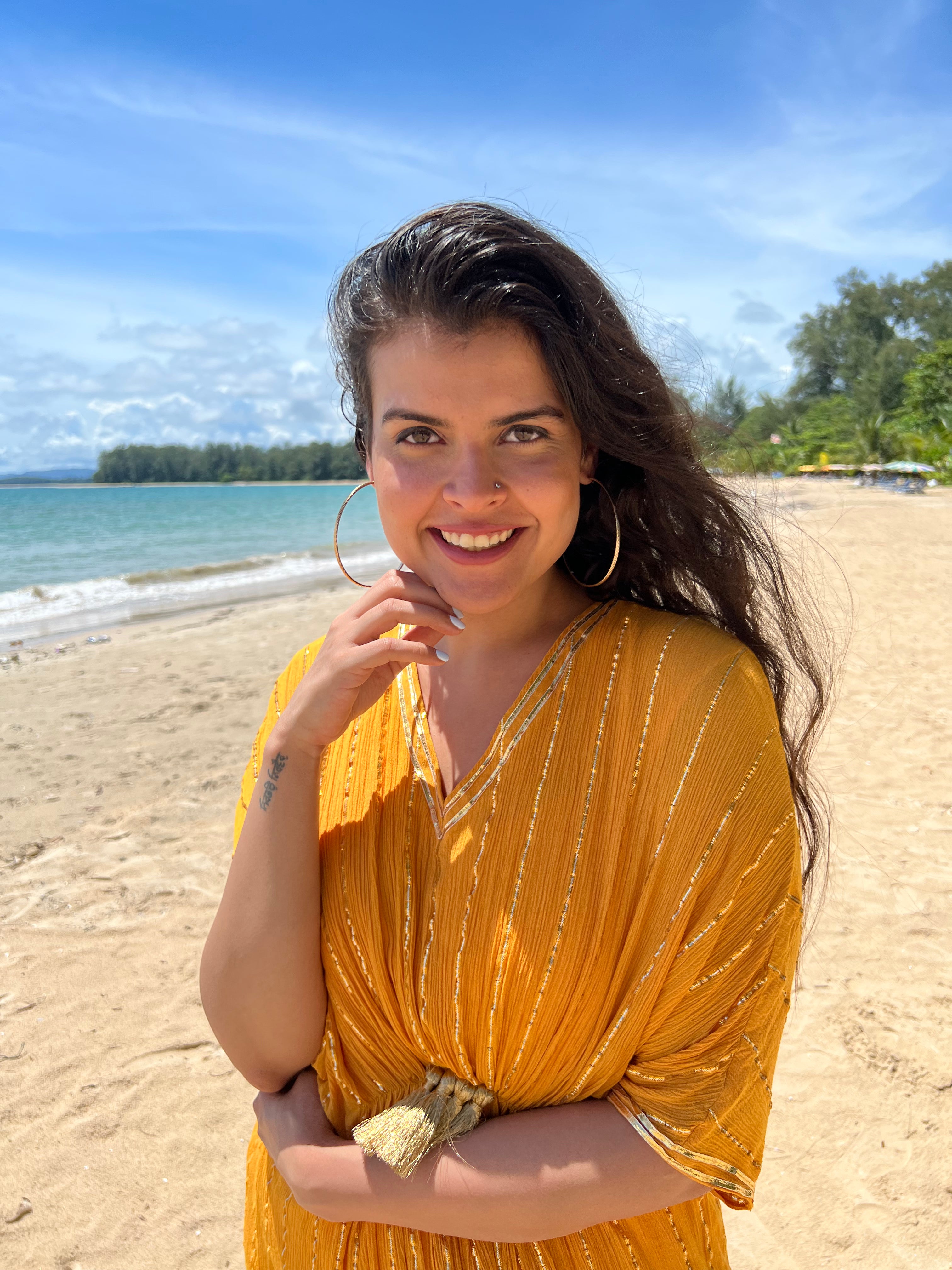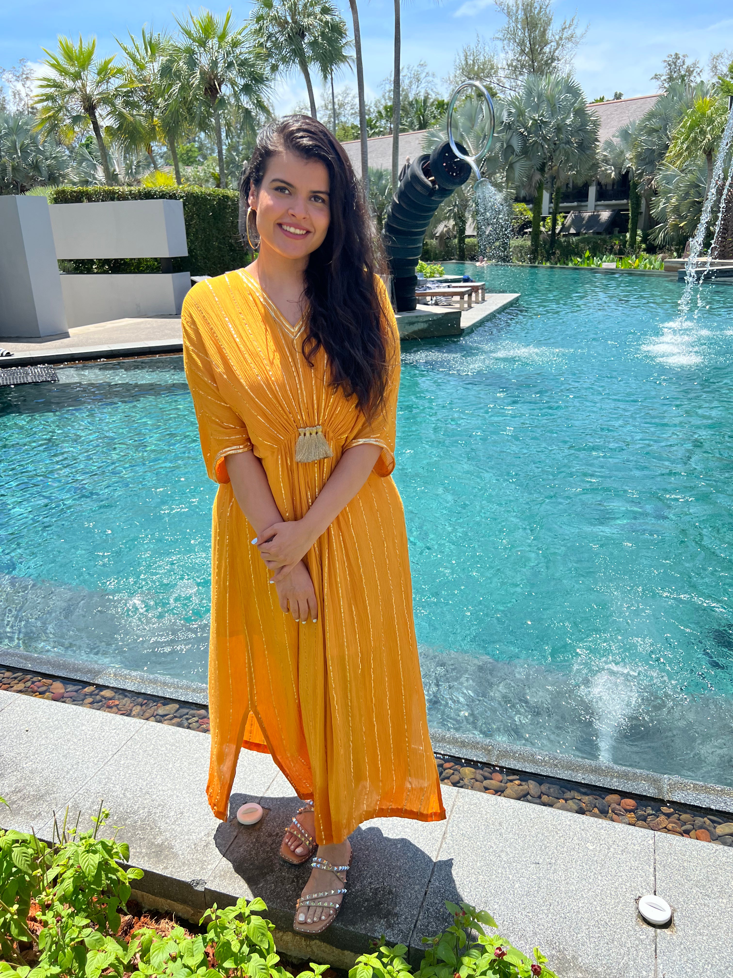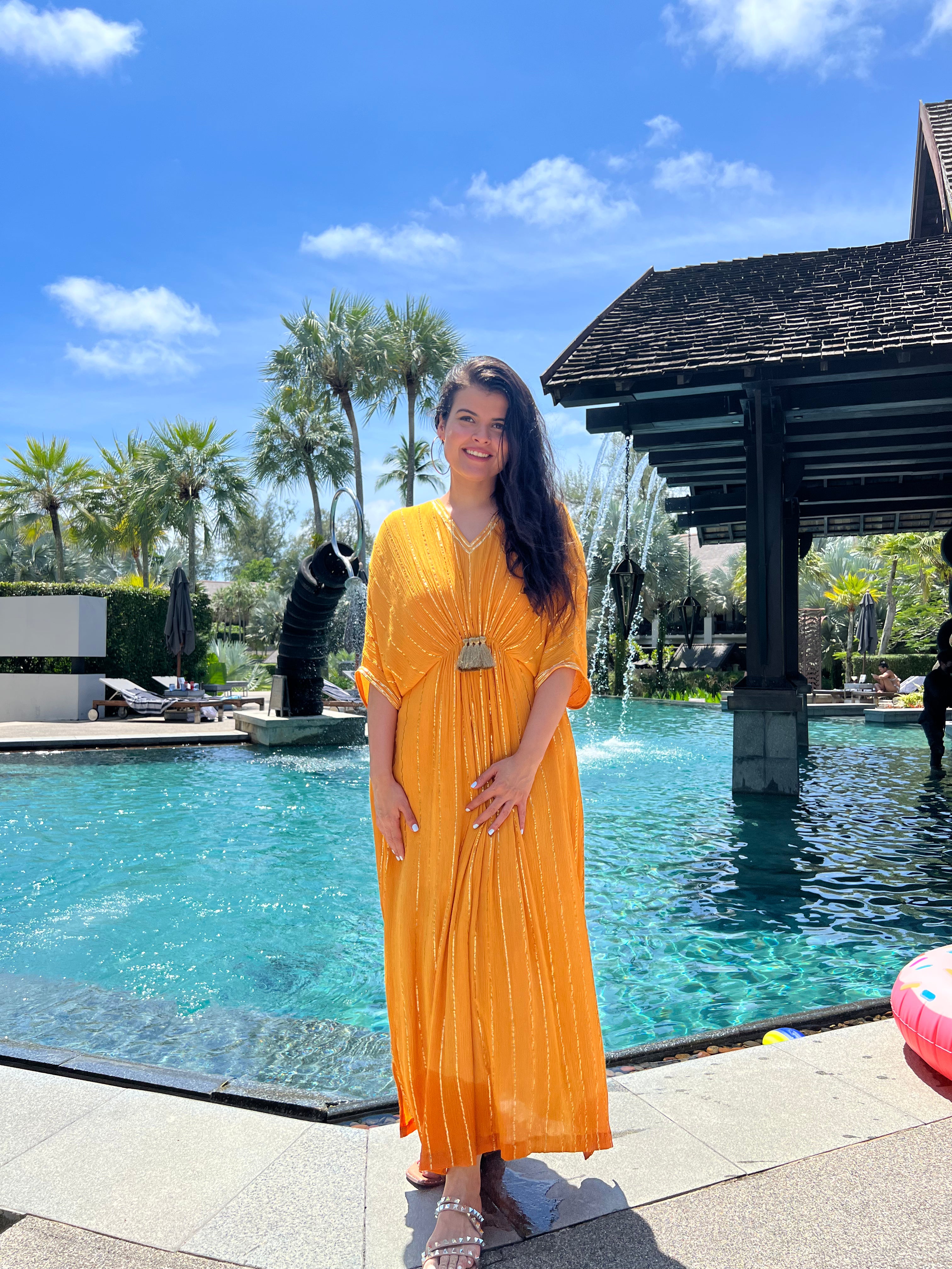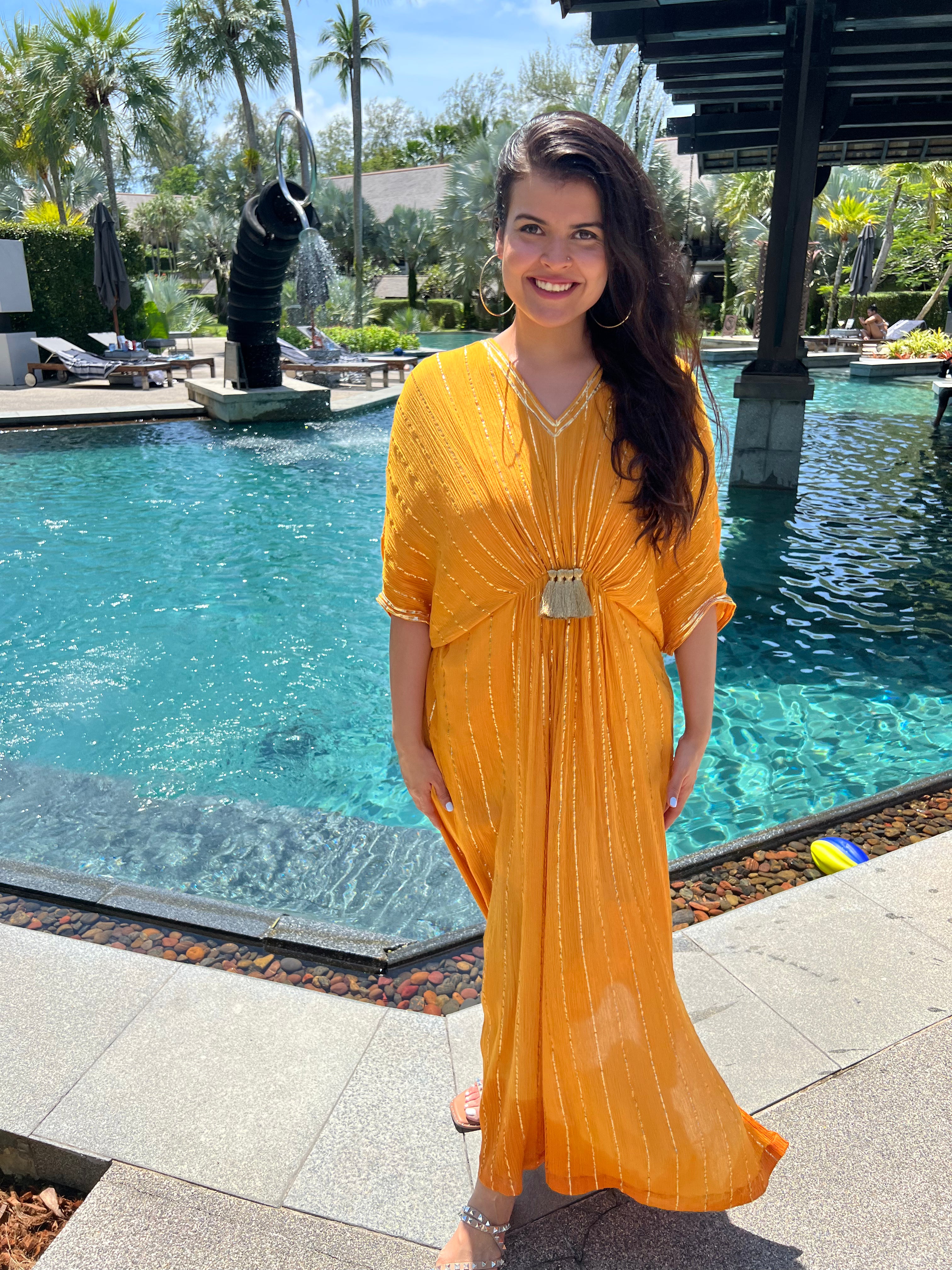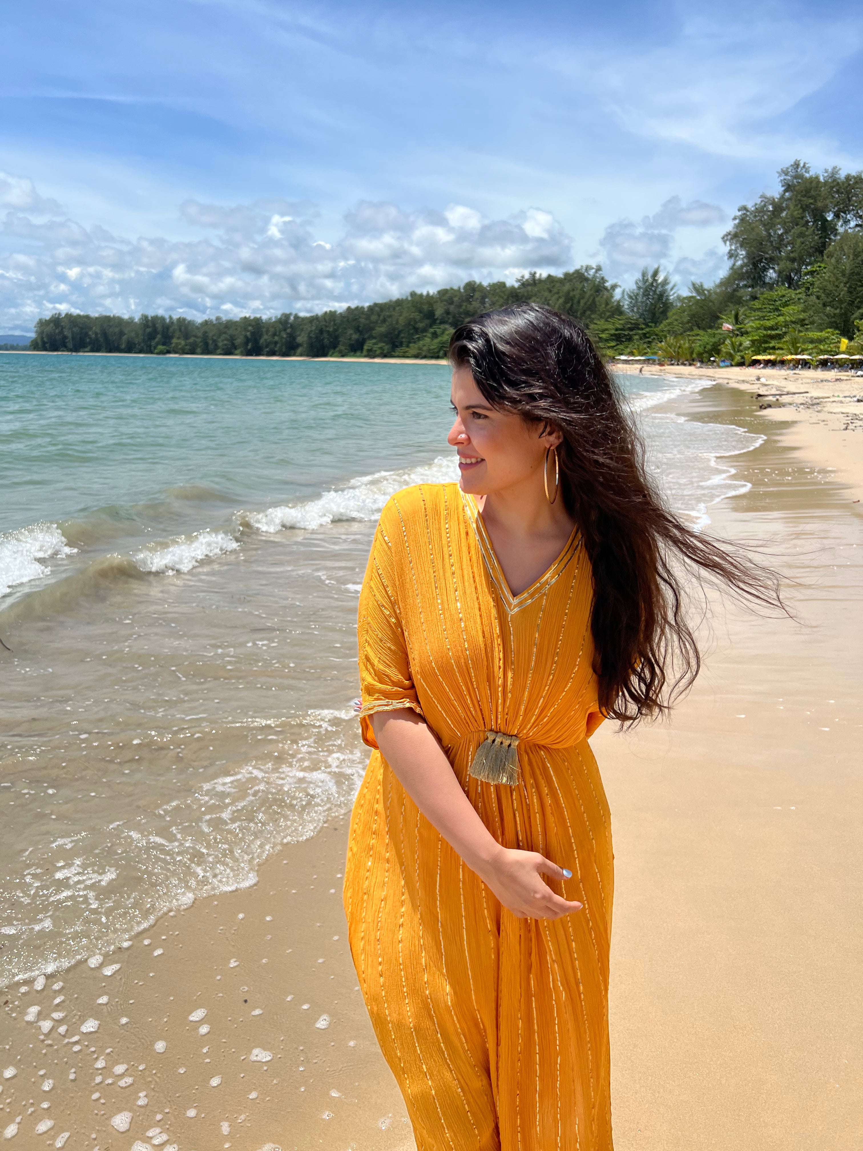 The vibrant mustard Kaftan Dress is a sure shot head turner this festive season. Style it with polki jewelry and mojaris for a Mehndi celebration. Or wear it with statement gold hoops and gladiators for a beach soiree. A must have piece in your wardrobe. It come with a soft cotton slip. Fuss free festive wear at its best.