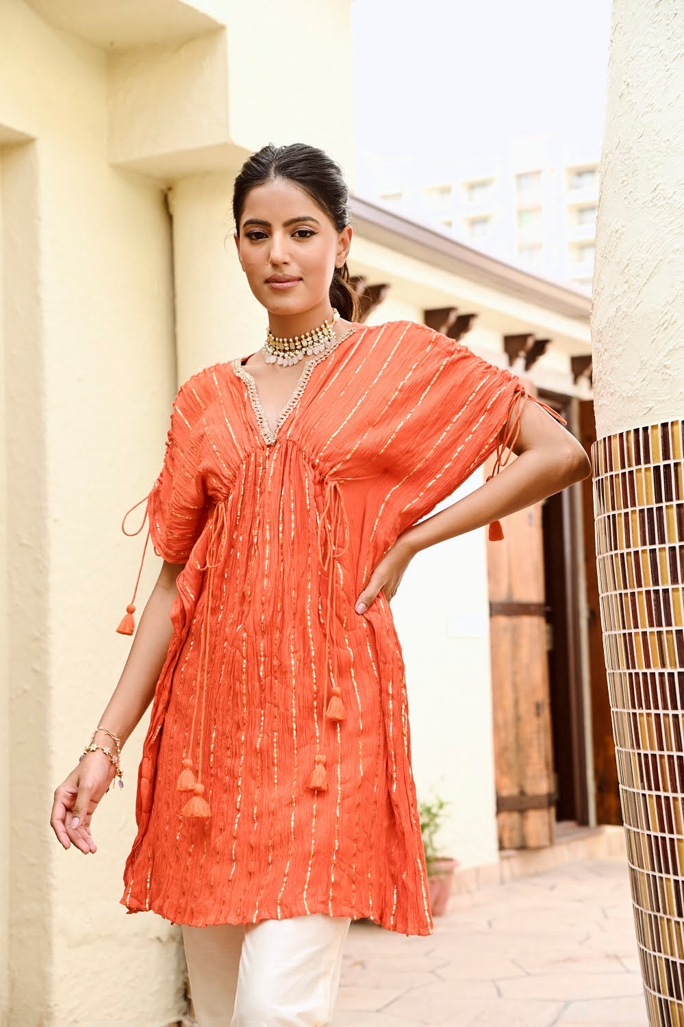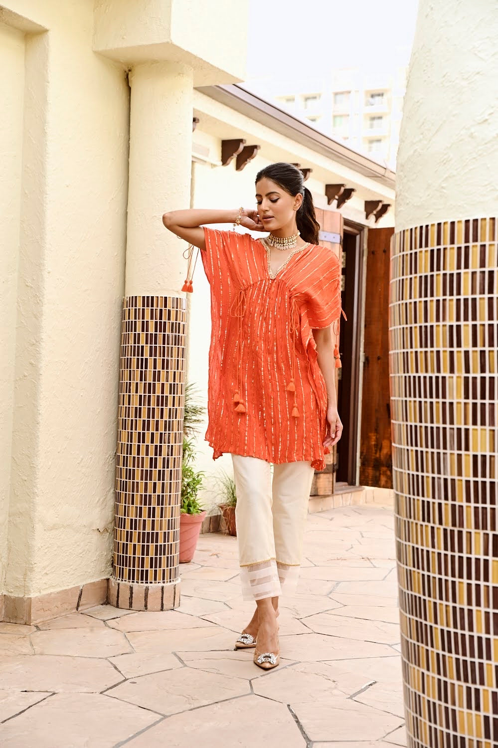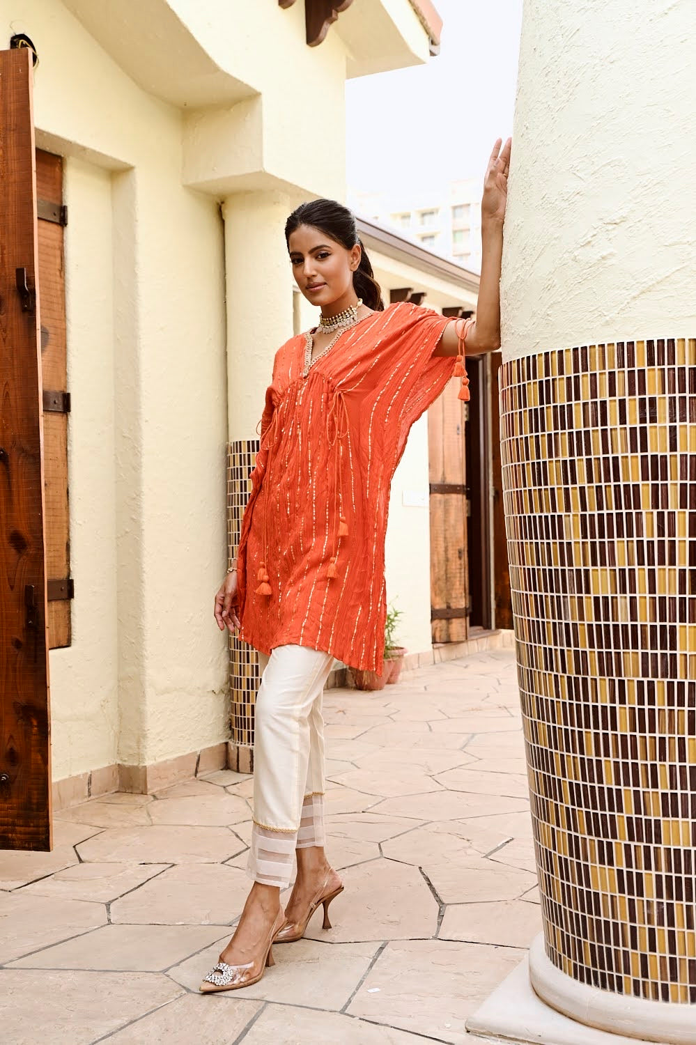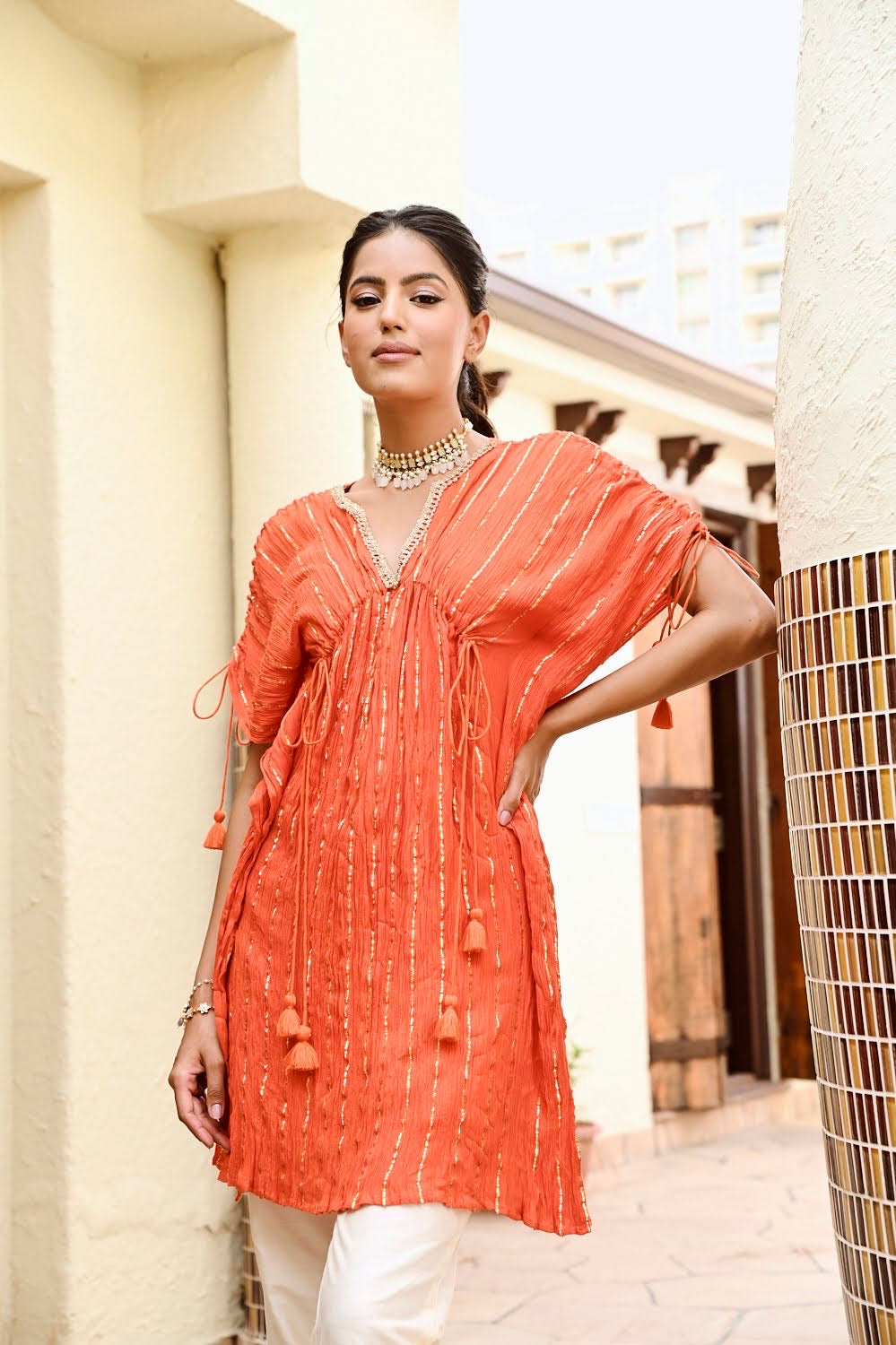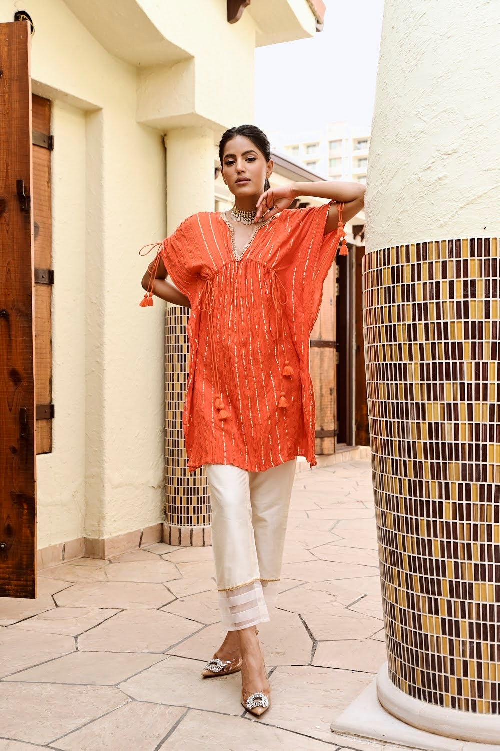 Here comes our signature orange lurex fabric in the most versatile Kaftan silhouette. complete with intricate gotta work; this soft cotton lurex kaftan is as comfortable as its stylish. It come with ivory cotton silk pants