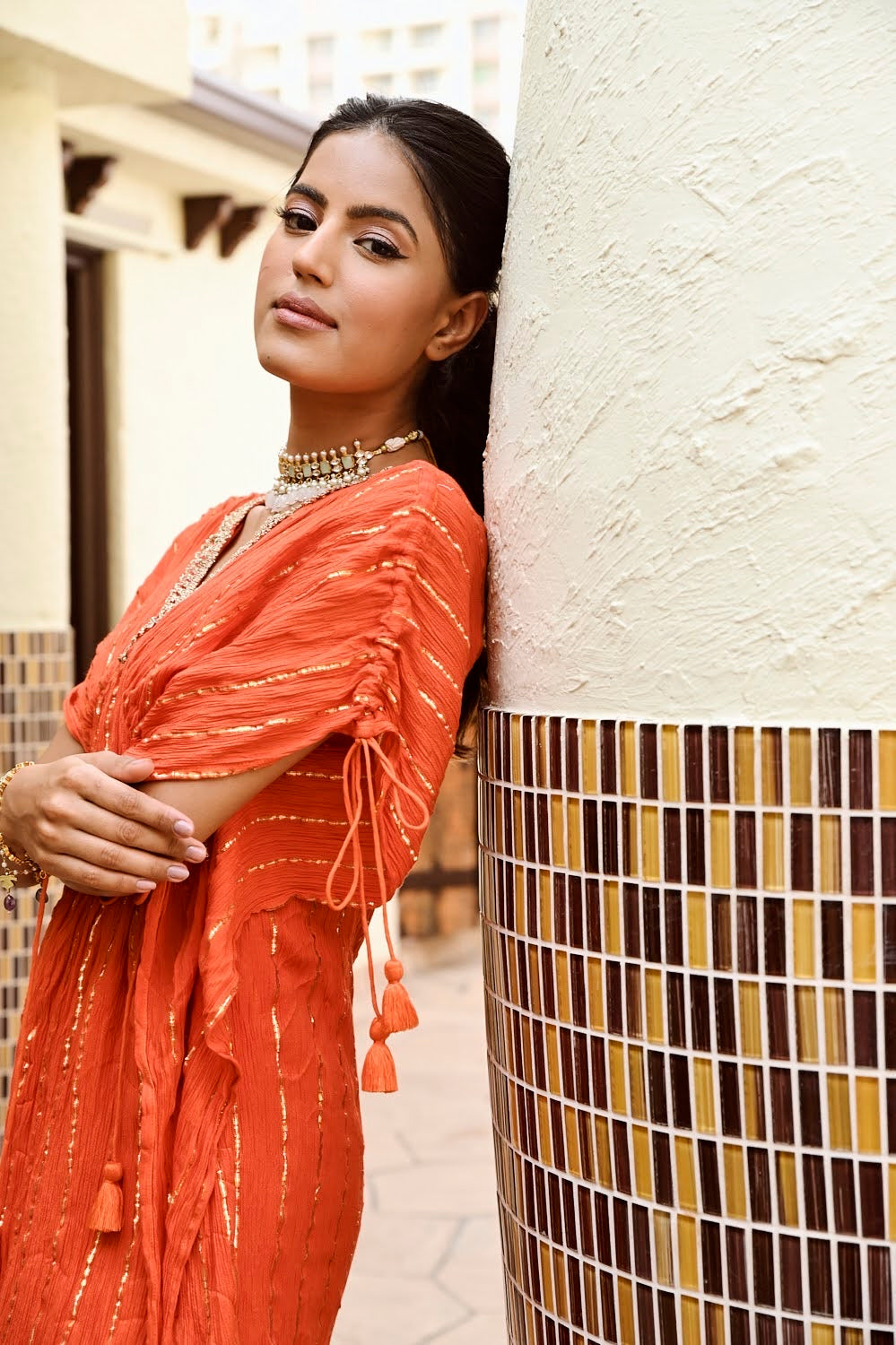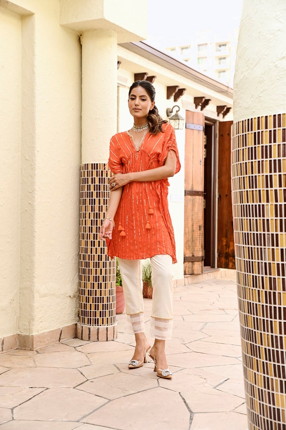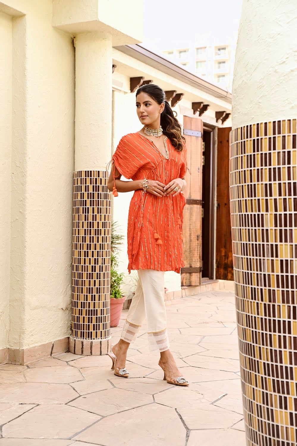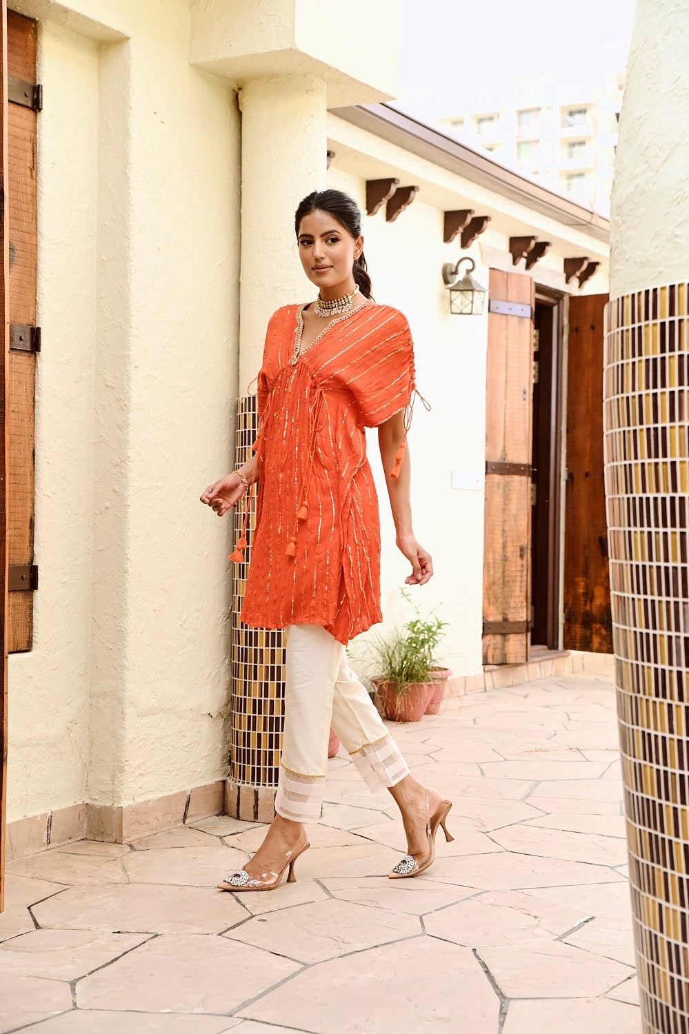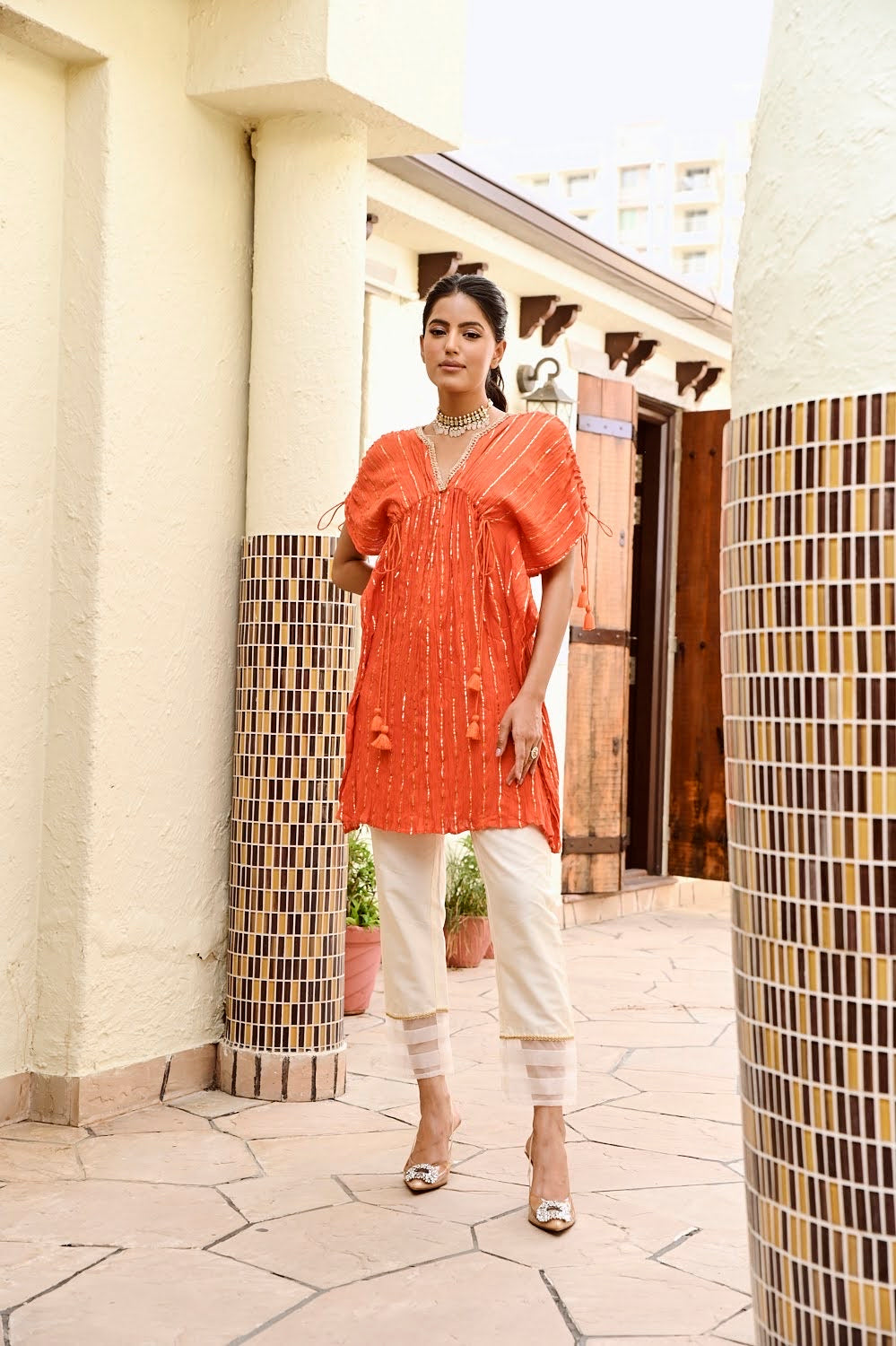 Here comes our signature orange lurex fabric in the most versatile Kaftan silhouette. complete with intricate gotta work; this soft cotton lurex kaftan is as comfortable as its stylish. It come with ivory cotton silk pants